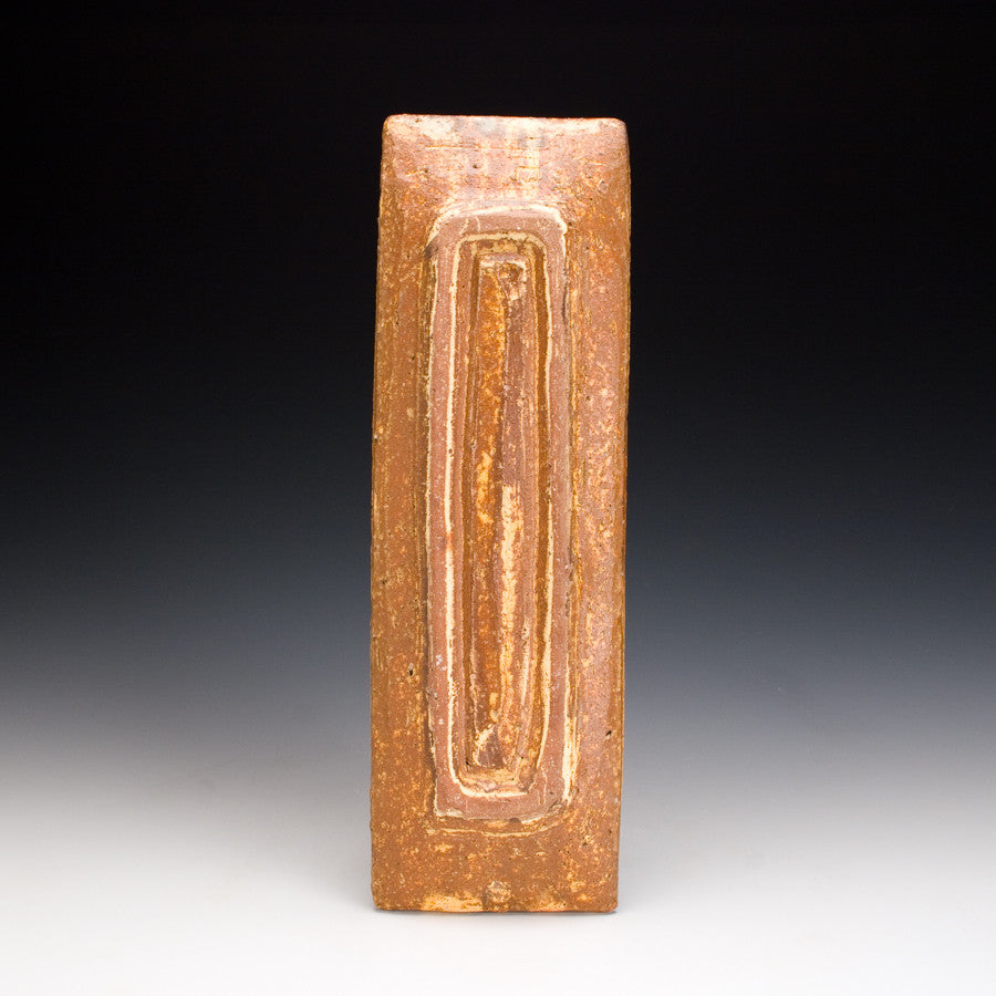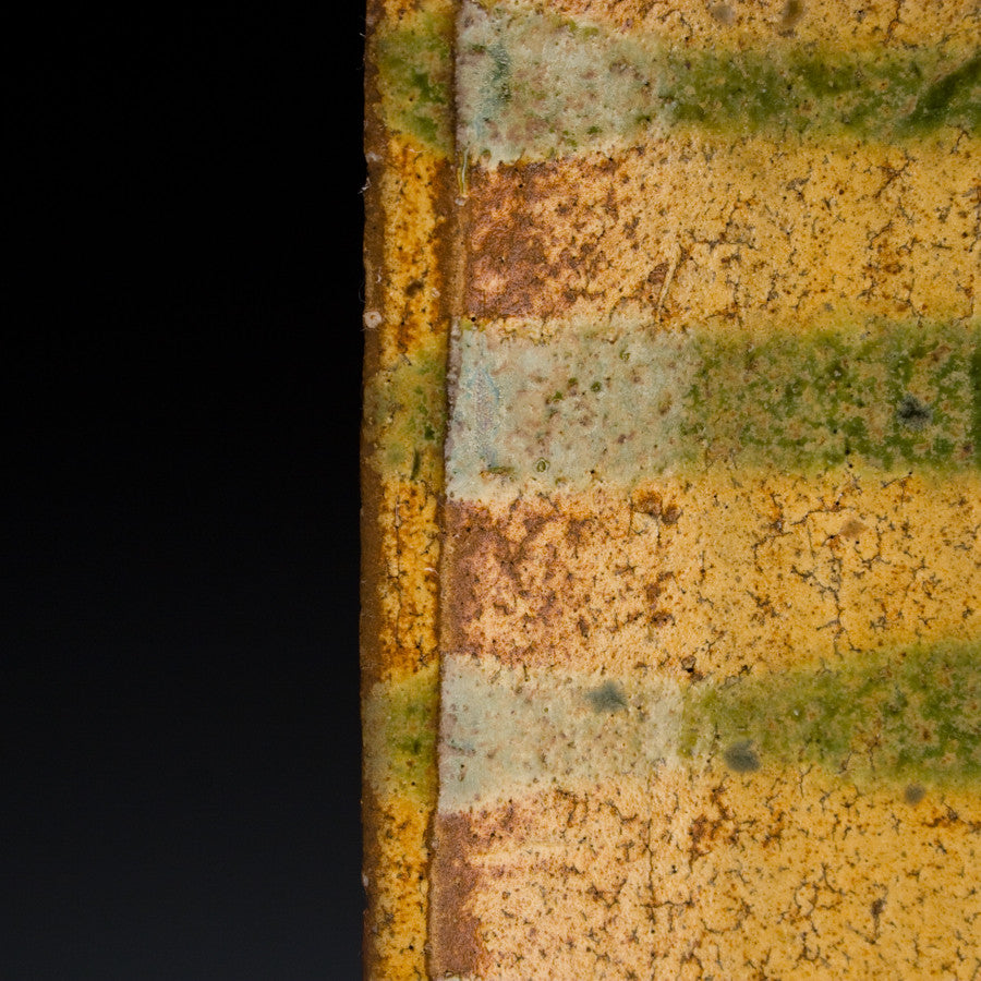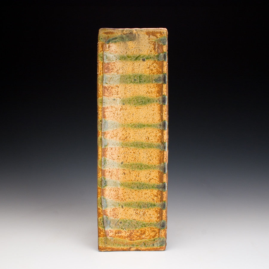 Wood fired local red clay. Yellow Glaze with green oribe stripes. 1.25 x 14 x 4.5