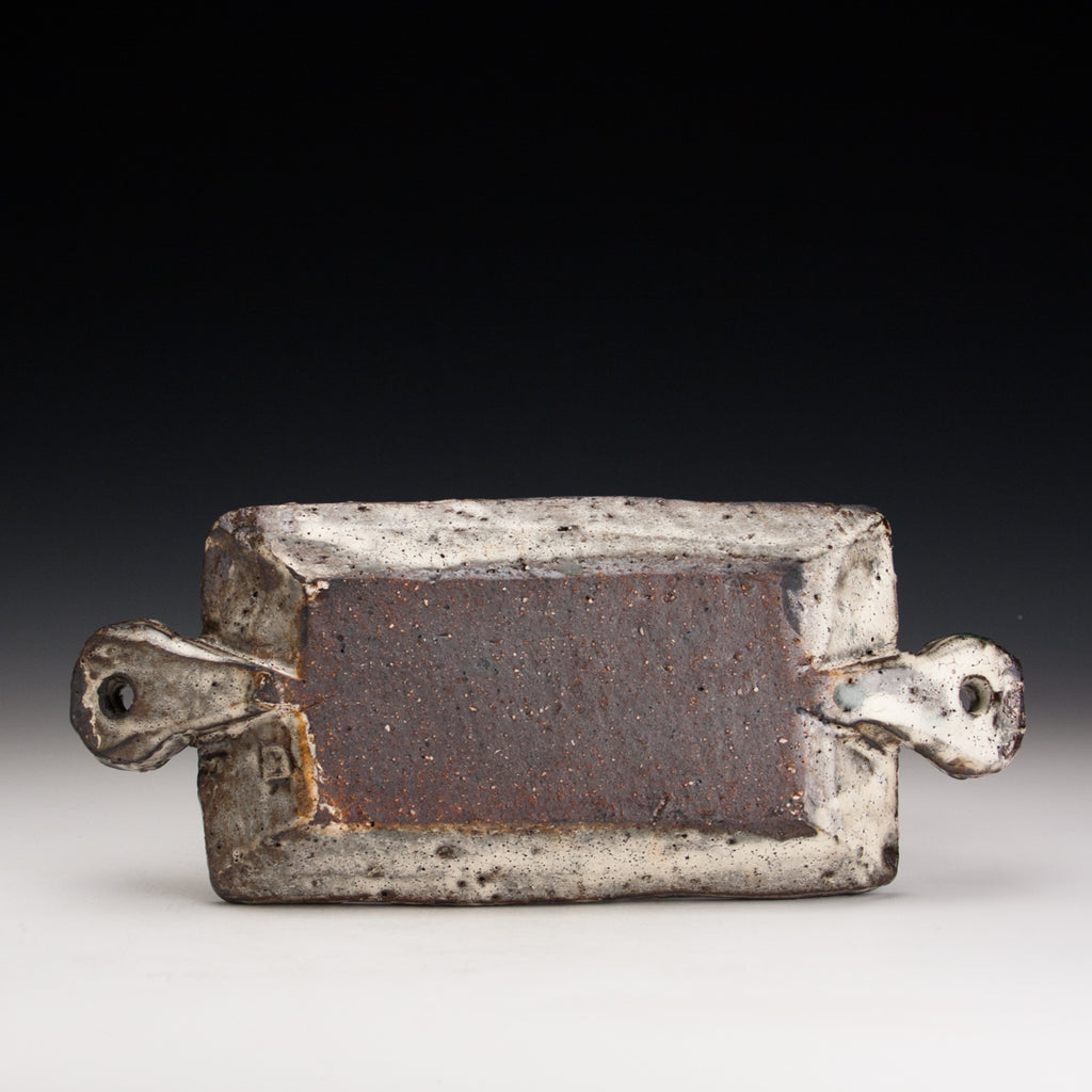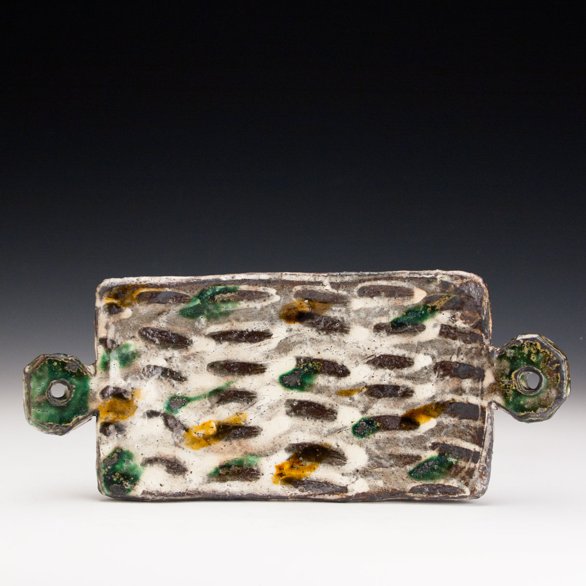 Local red clay. White slip, finger wipes, clear glaze with green and amber deco.  11.25 x 5 x 2