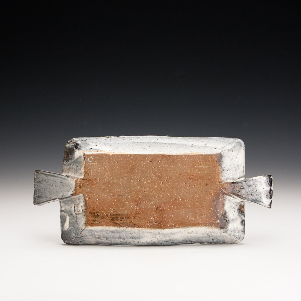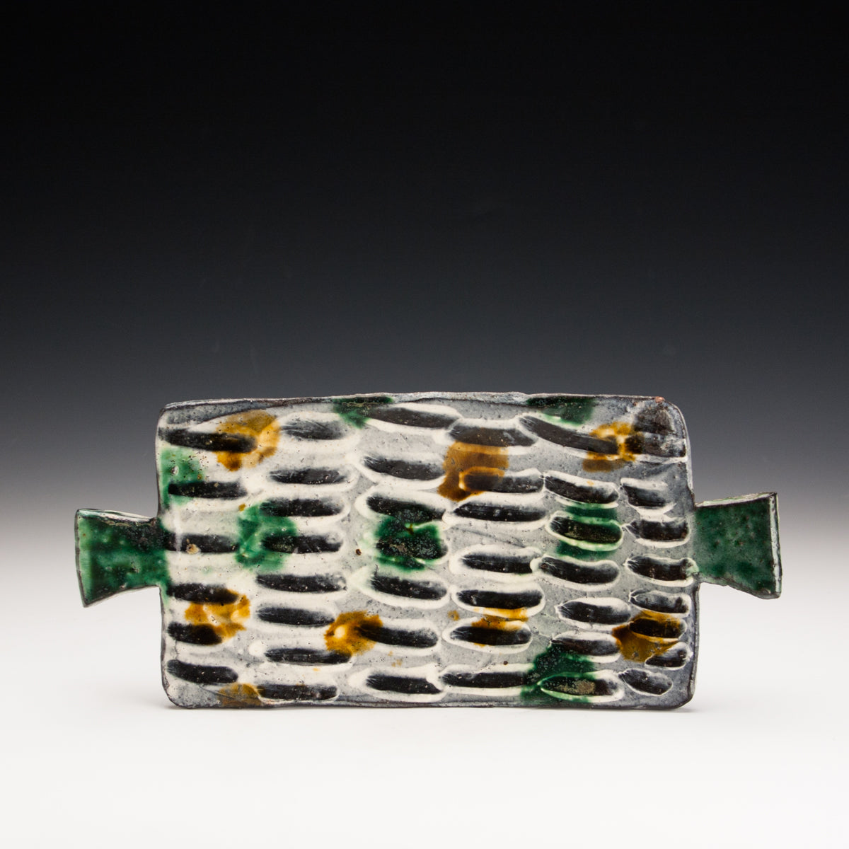 Wood fired local red clay. White slip, finger wipes, clear glaze with green and amber deco. 11.25 x 5 x 2
