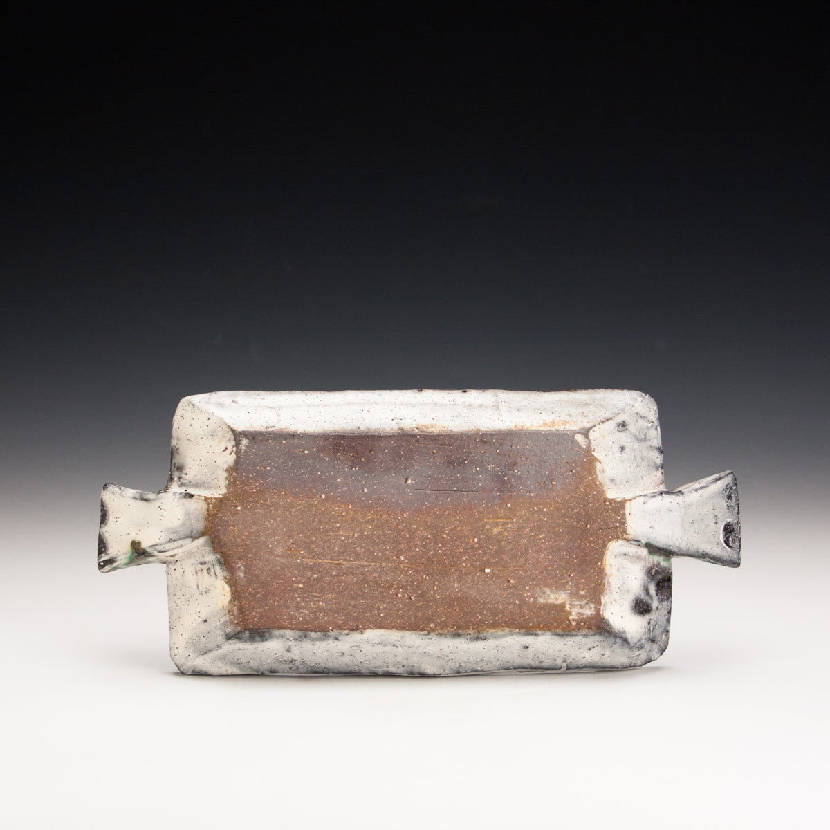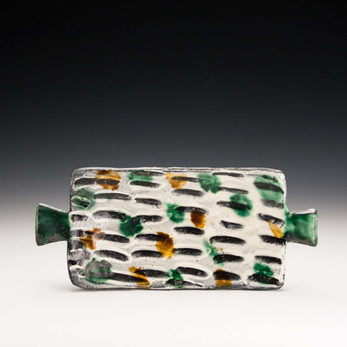 Wood fired local red clay. White slip, finger wipes, clear glaze with green and amber deco. 11.25 x 5 x 2