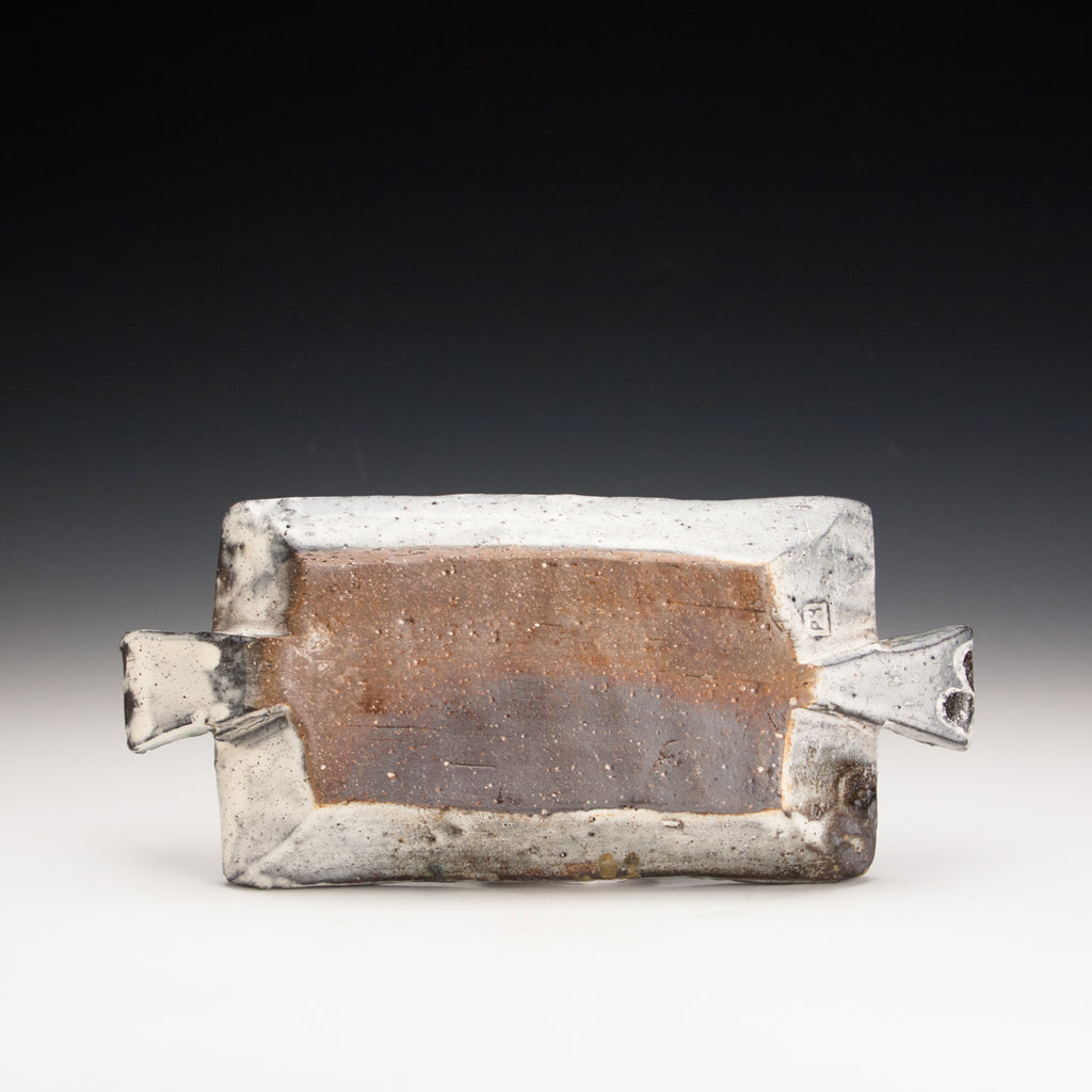 Wood fired local red clay. White slip, finger wipes, clear glaze with green and amber deco. 11.25 x 5 x 2