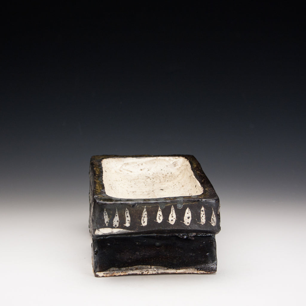 Wood fired local red clay. Wax Resist and iron. 8.5 x 4.5 x 3.5 This solid, heavy tray is carved from a single piece of clay.