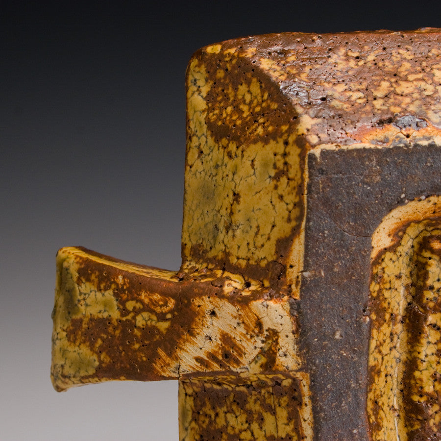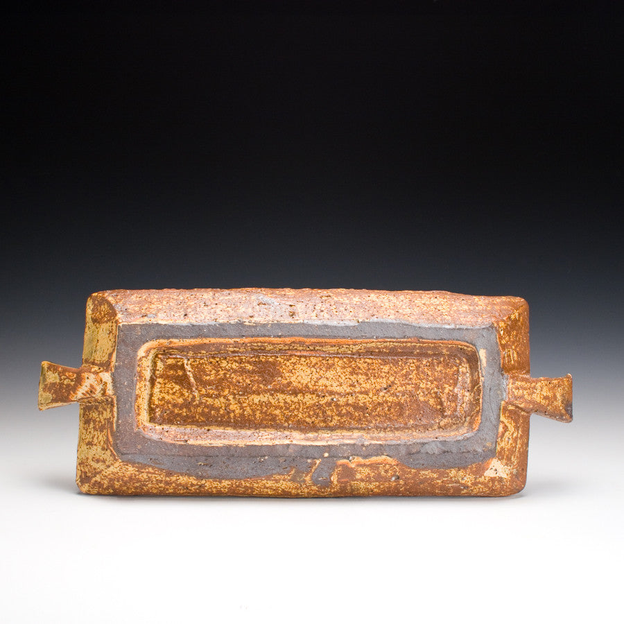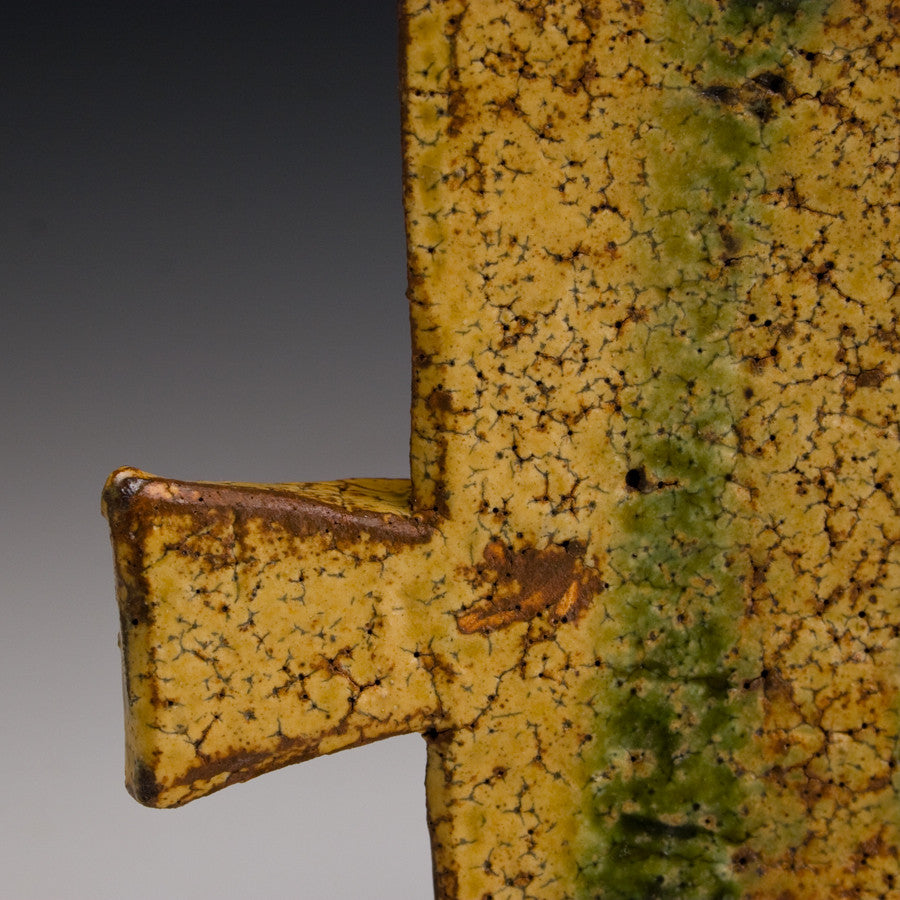 Wood fired local red clay. Yellow Glaze with Green Oribe stripes.  1.75 x 14.25 x 5.5
