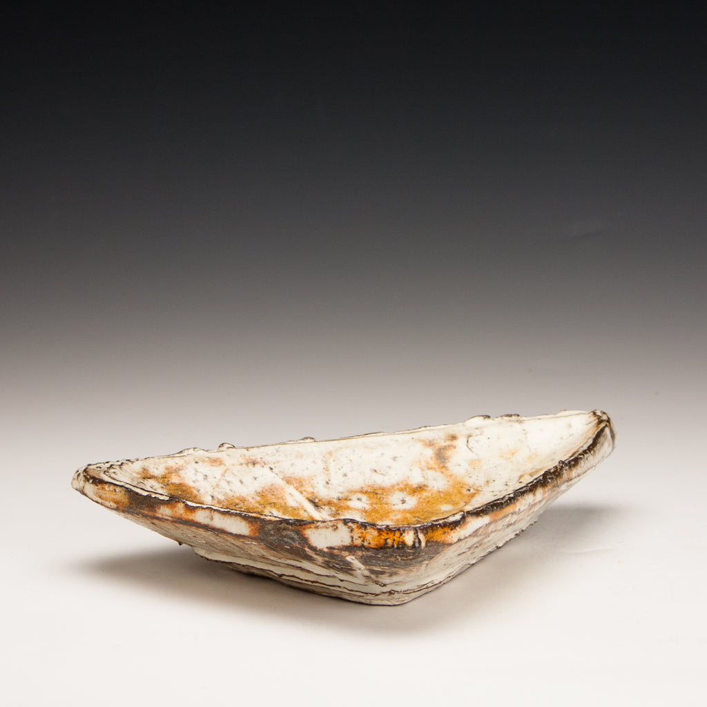 Wood fired local red clay. White slip and clear glaze.  7 x 7.5 x 1.5