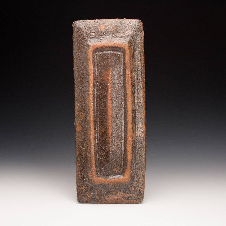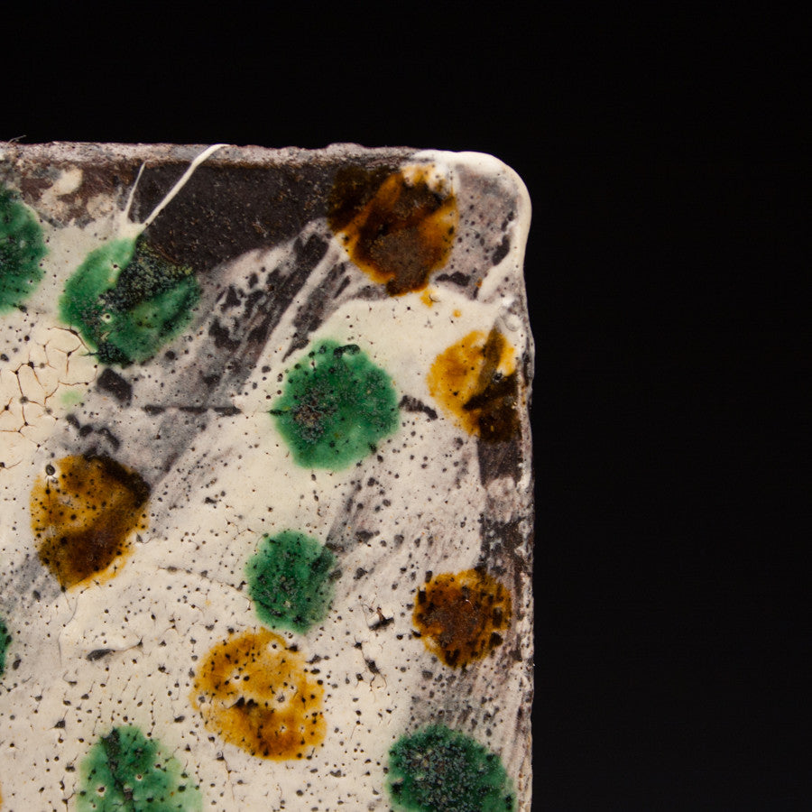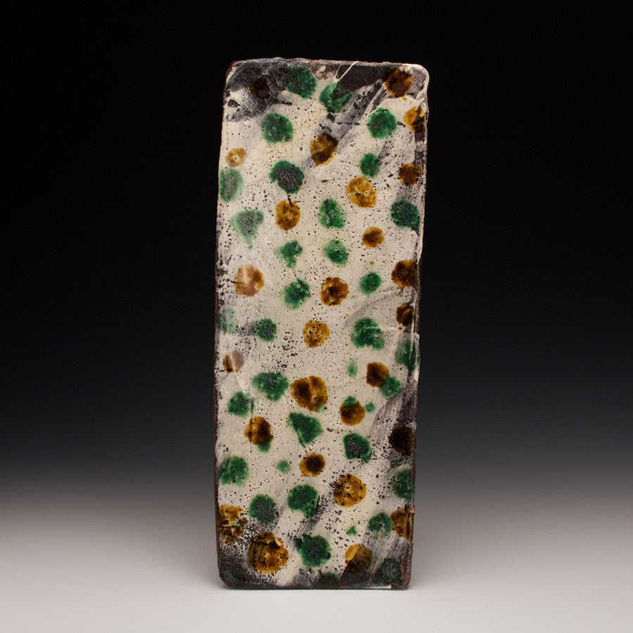 Wood fired local red clay. Hakame slip with amber and green dots. 14.75 x 5.75 x 1