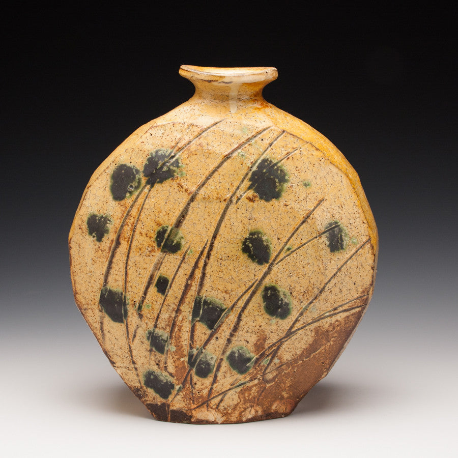 Wood fired local red clay. Sgraffito, yellow glaze and green dots. 7.5 x 4 x 9