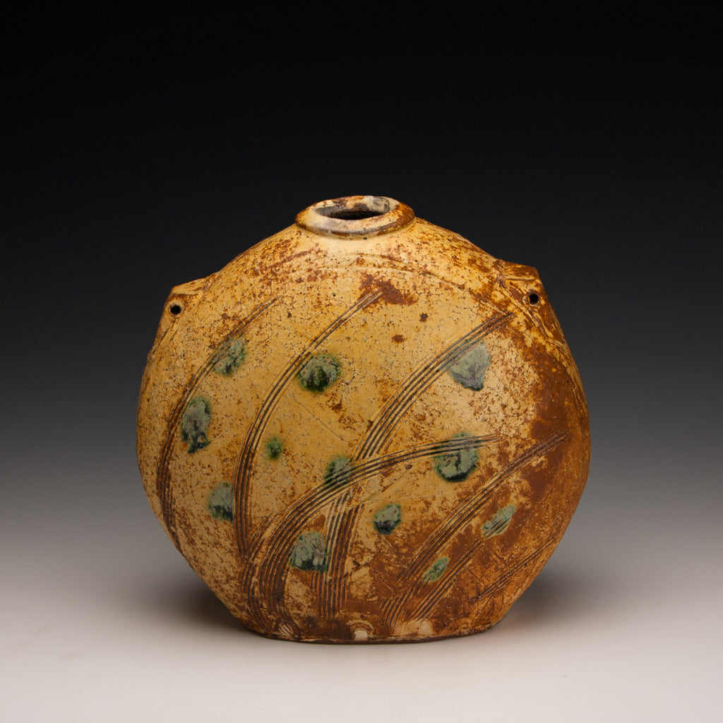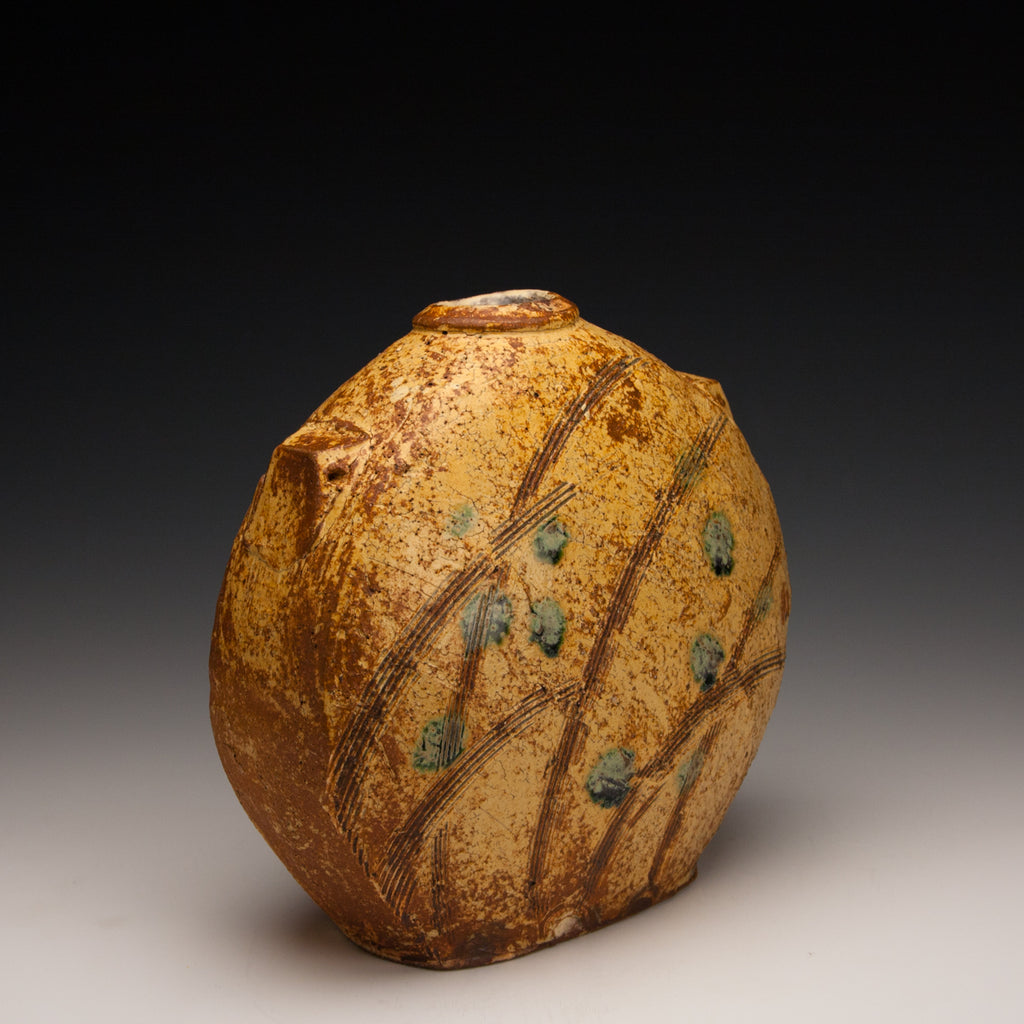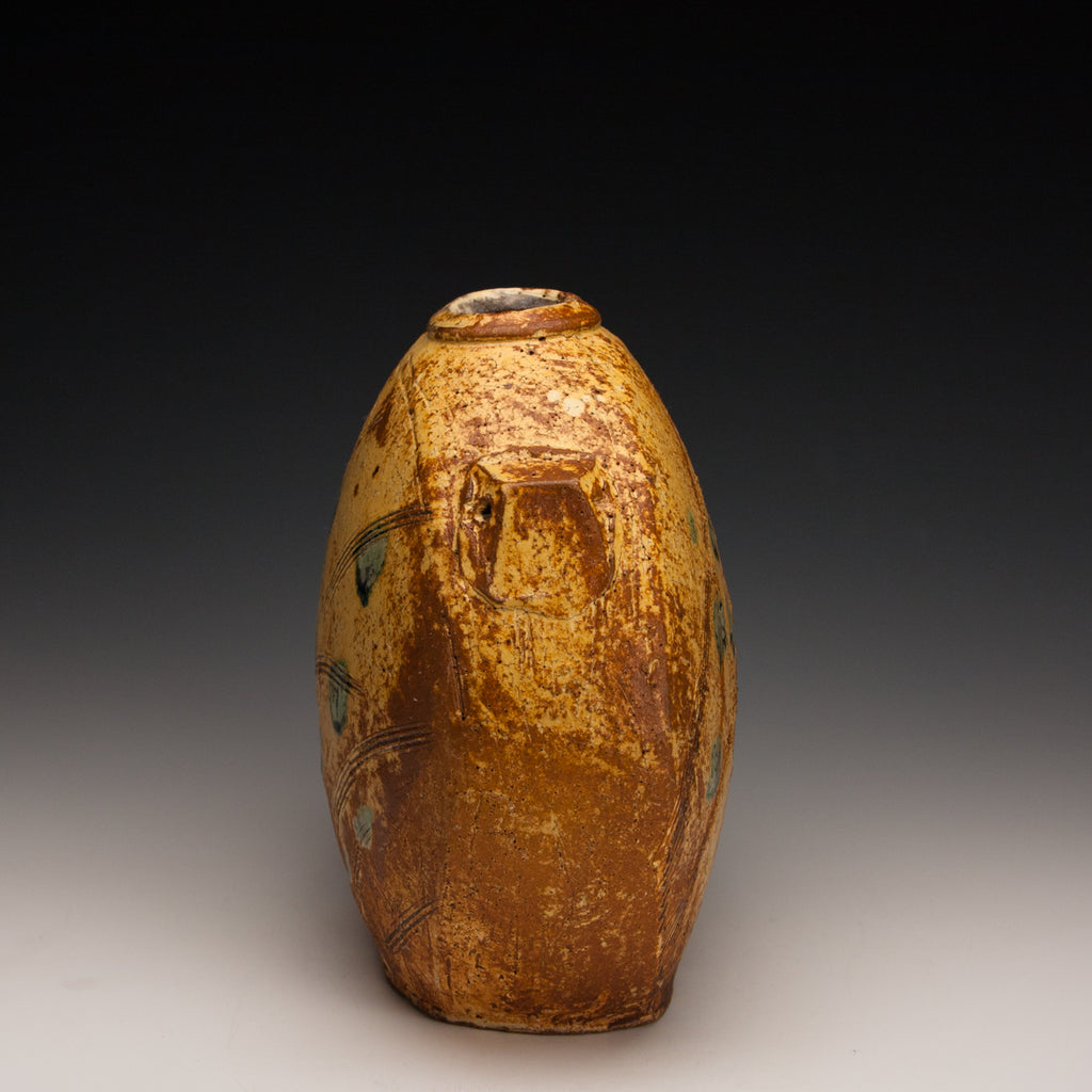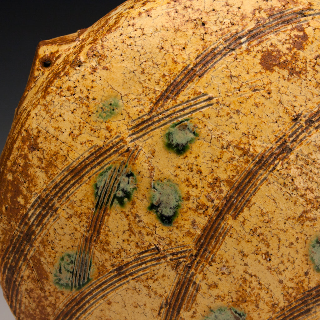 Wood fired local red clay. Yellow slip w/ Sgraffito, yellow ash glaze and oribe green. 8.5" x 8" x 4.5"