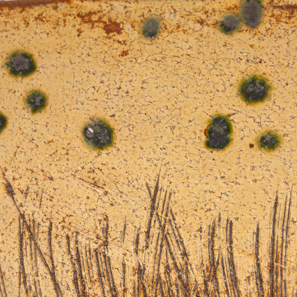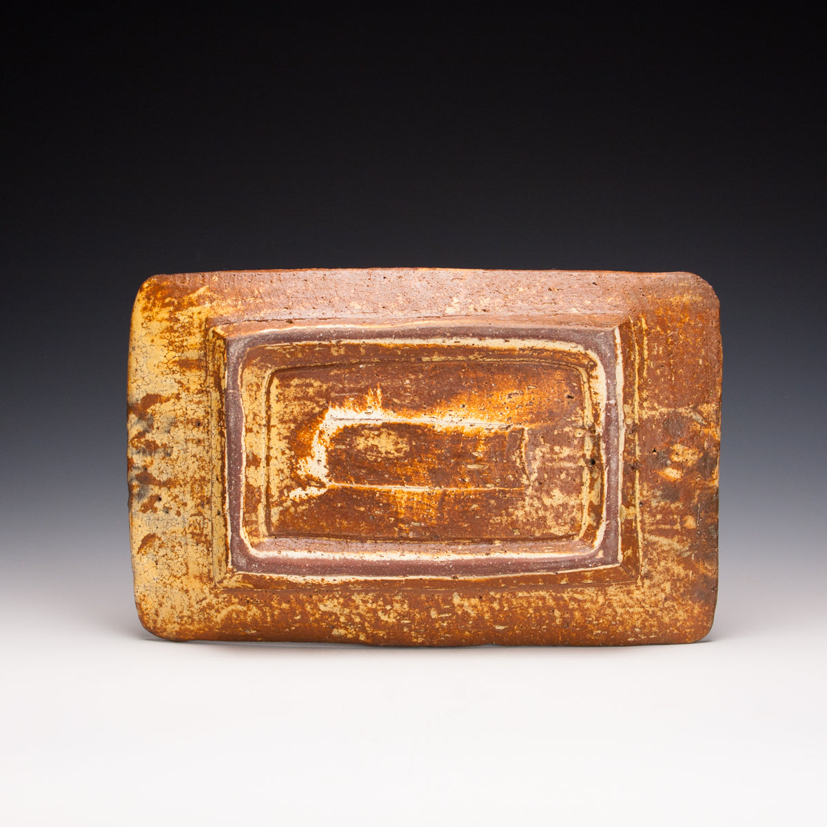 Wood fired local red clay. Yellow ash glaze and green. 13 x 8.5 x 2