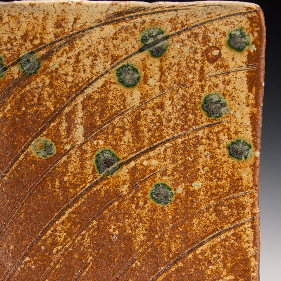 Wood fired local red clay. Yellow Glaze, Sgraffito and Green dots.  9 x 1.75