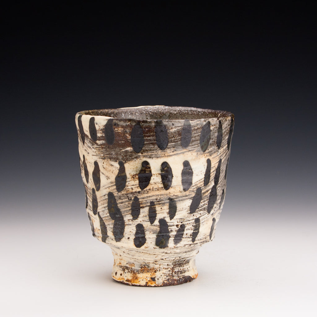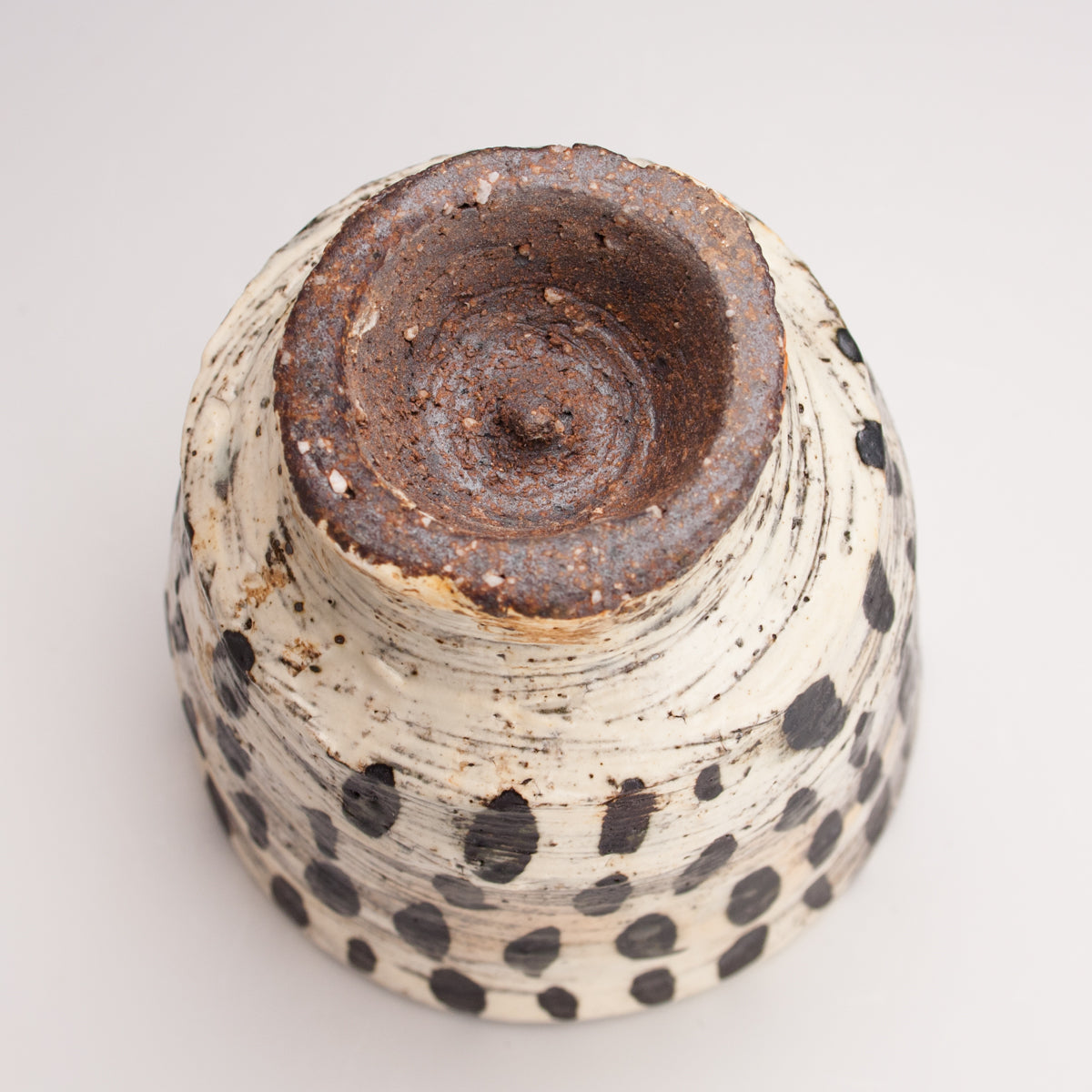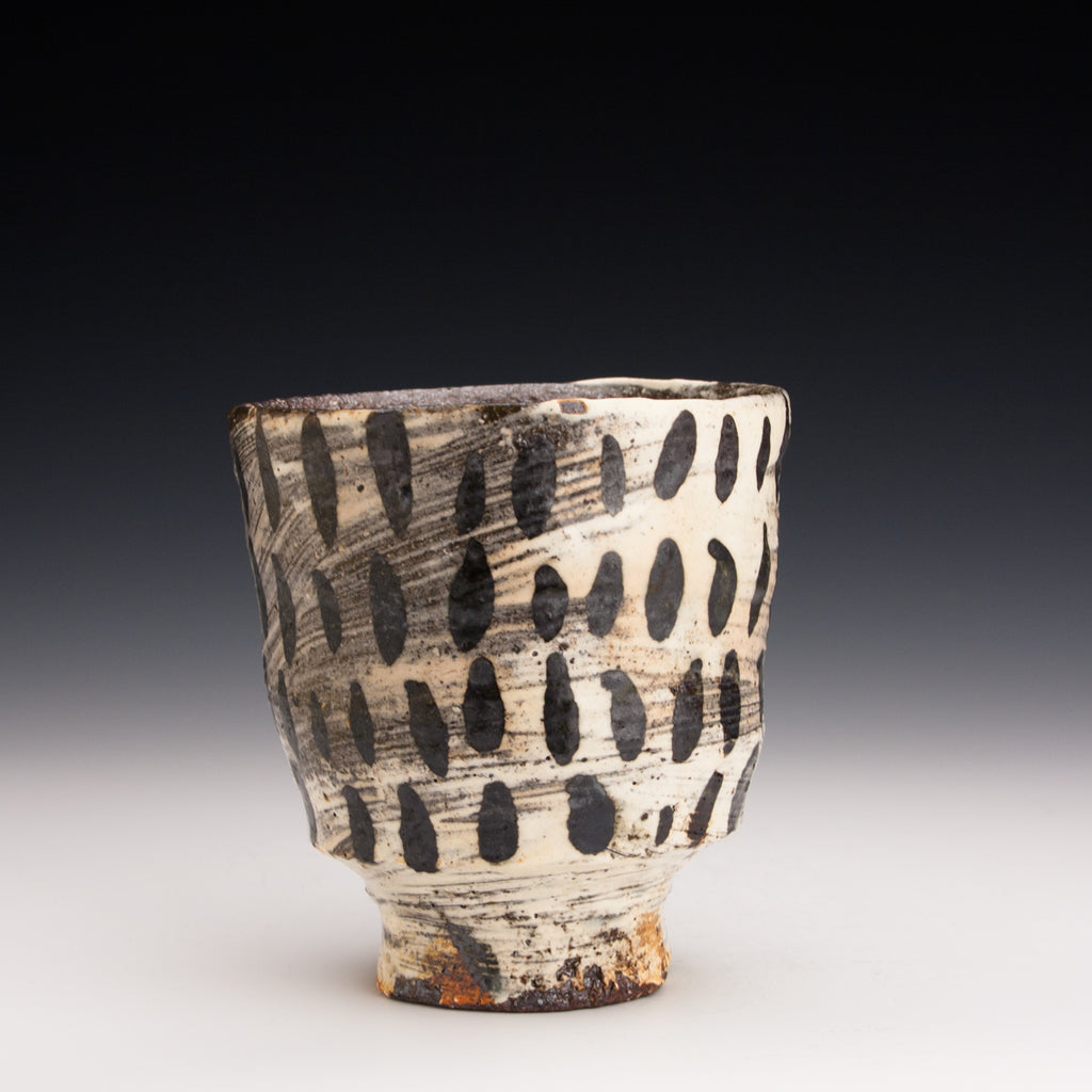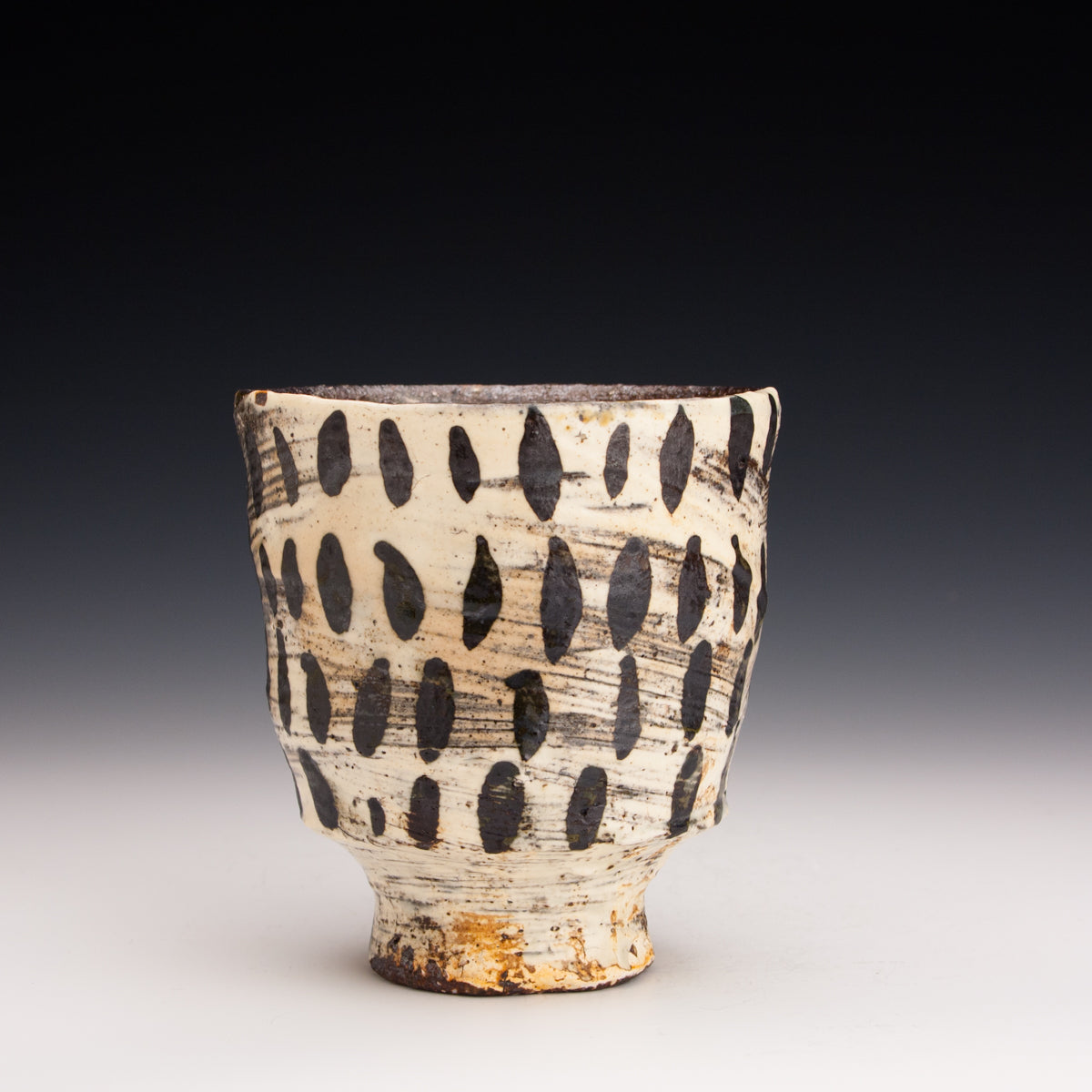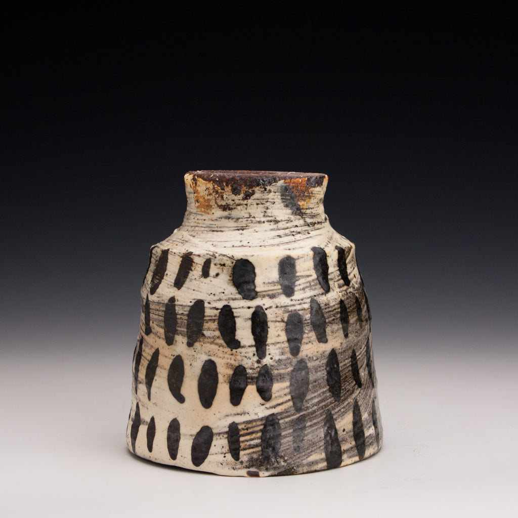 Wood fired local red clay. white slip, black iron deco and clear glaze. 4 x 3.75