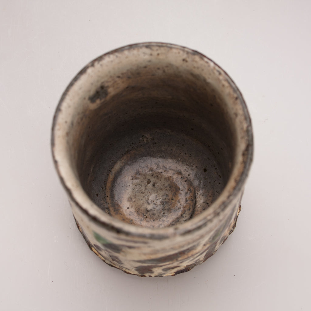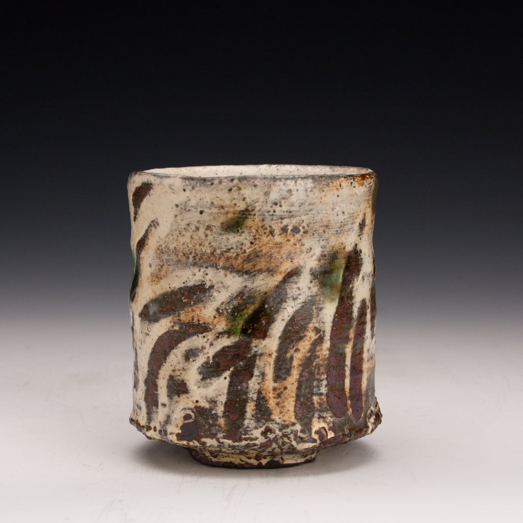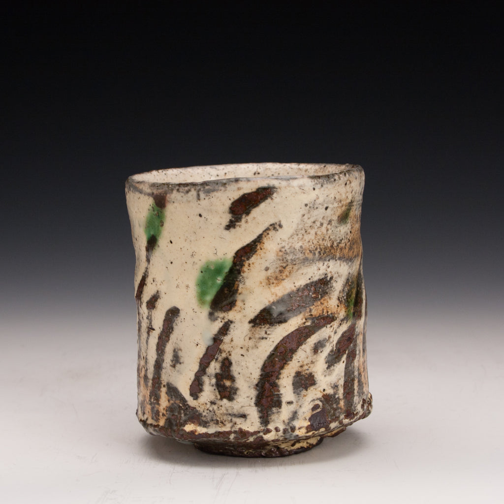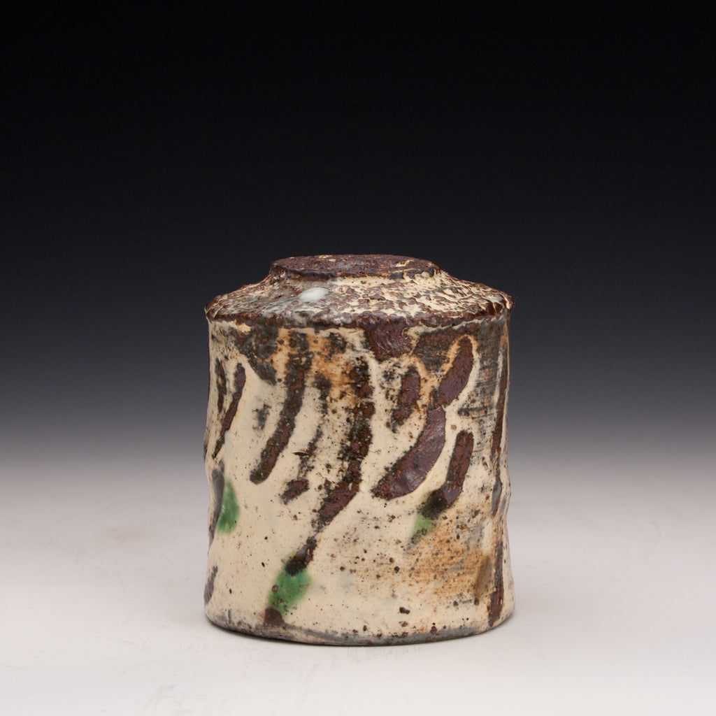 Wood fired local red clay. White slip, finger wipes, clear glaze and green dots. 3.25 x 3.75