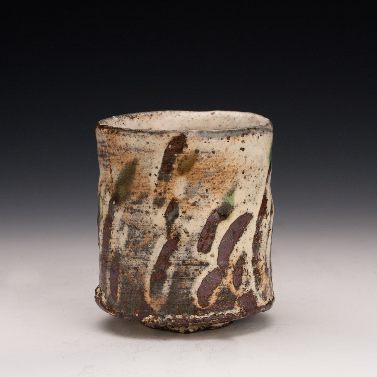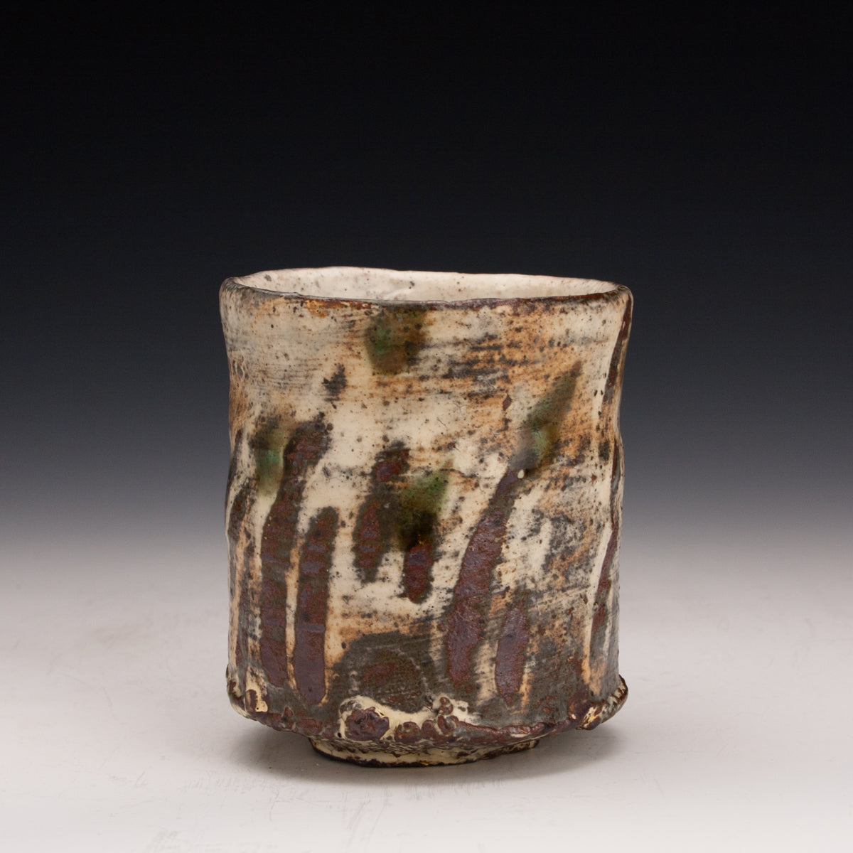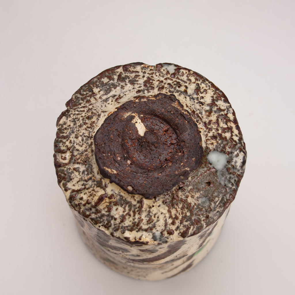 Wood fired local red clay. White slip, finger wipes, clear glaze and green dots. 3.25 x 3.75