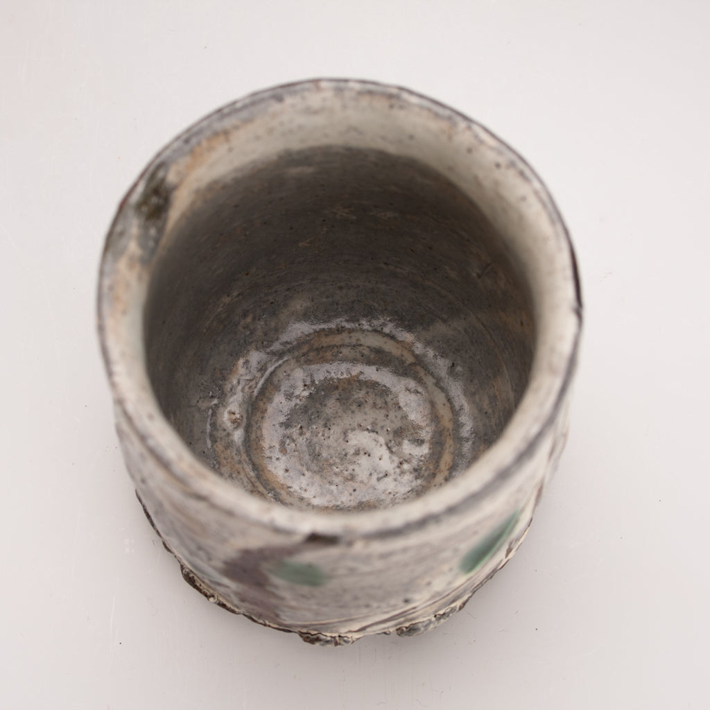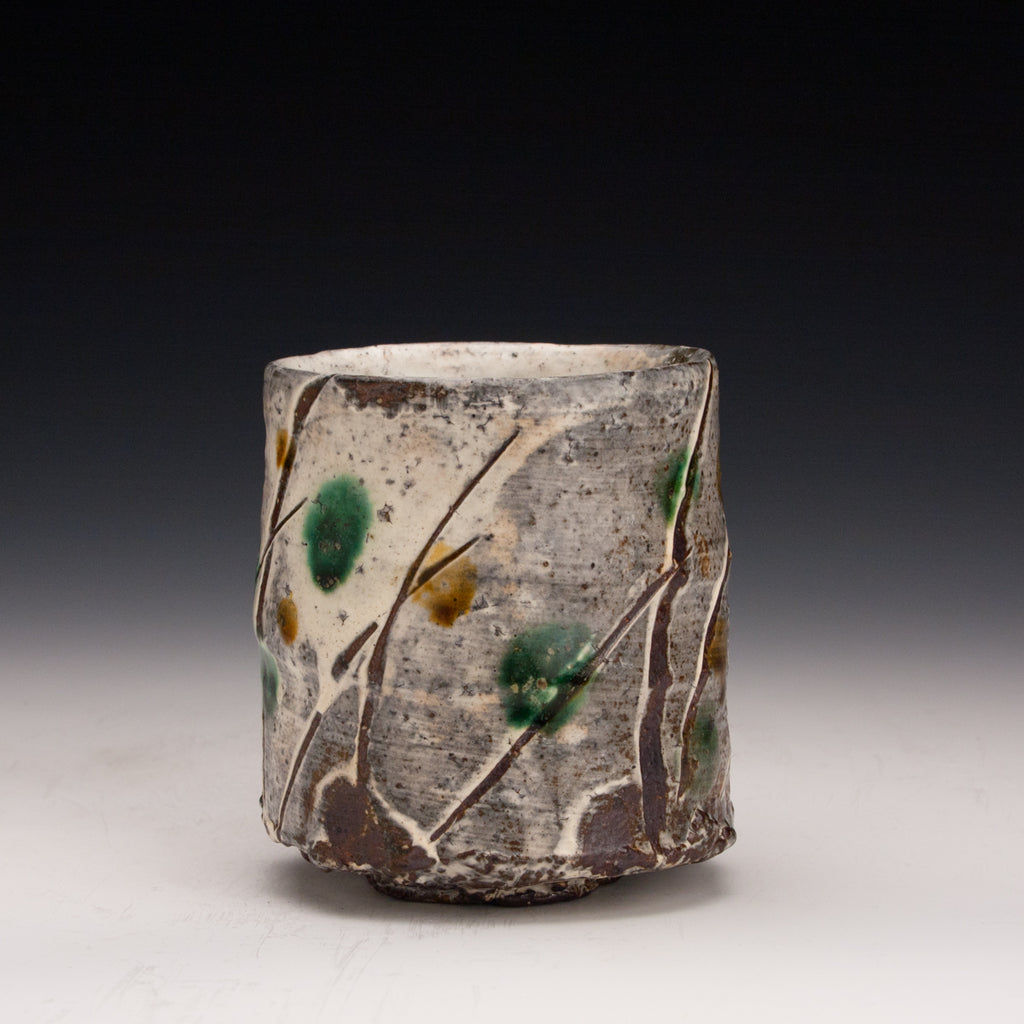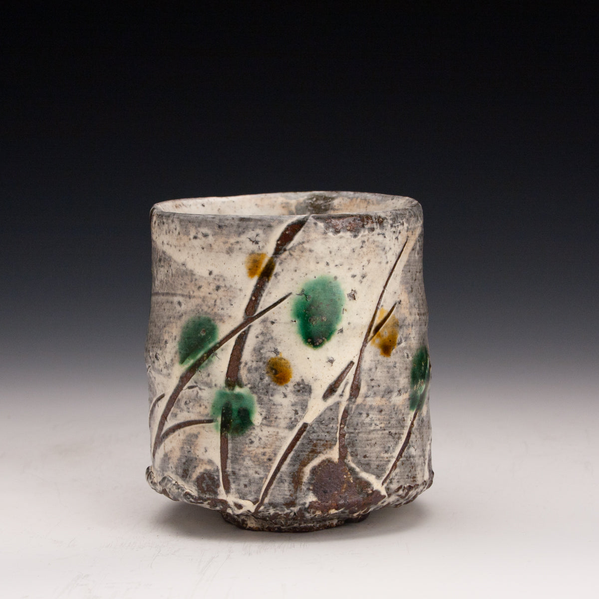Wood fired local red clay. White slip sgraffito, clear glaze and green and amber dots. 3.25 x 3.75