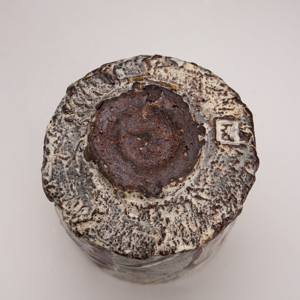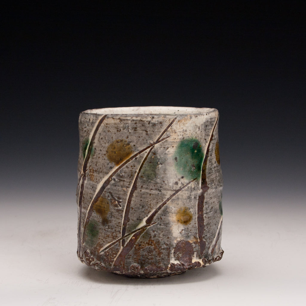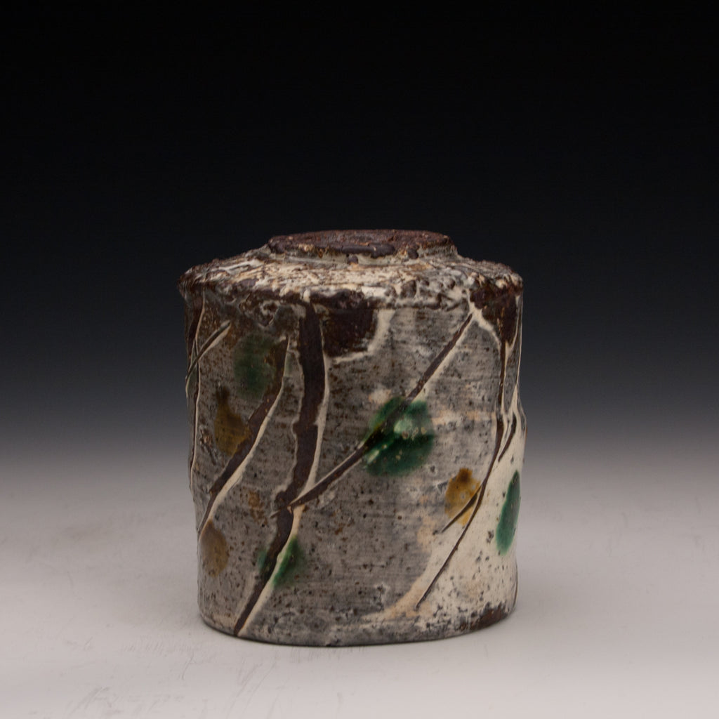 Wood fired local red clay. White slip sgraffito, clear glaze and green and amber dots. 3.25 x 3.75