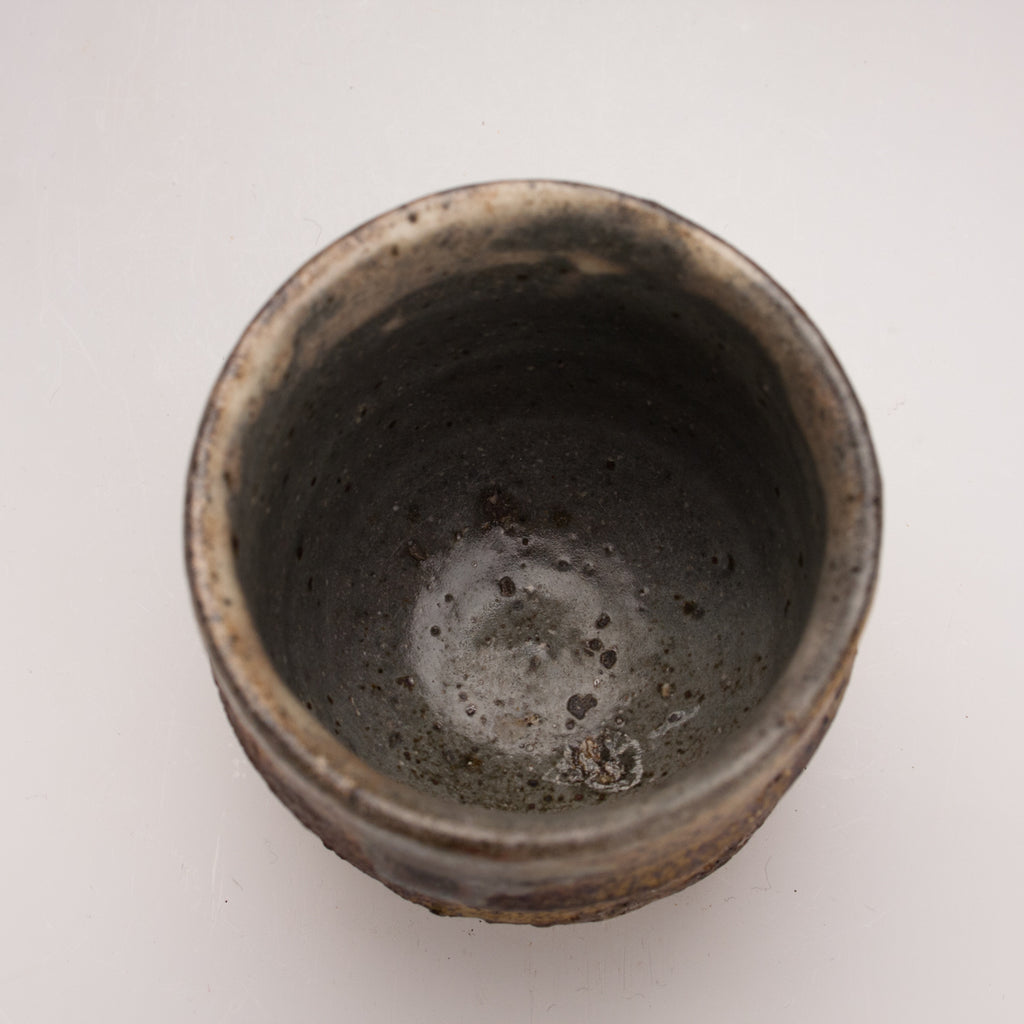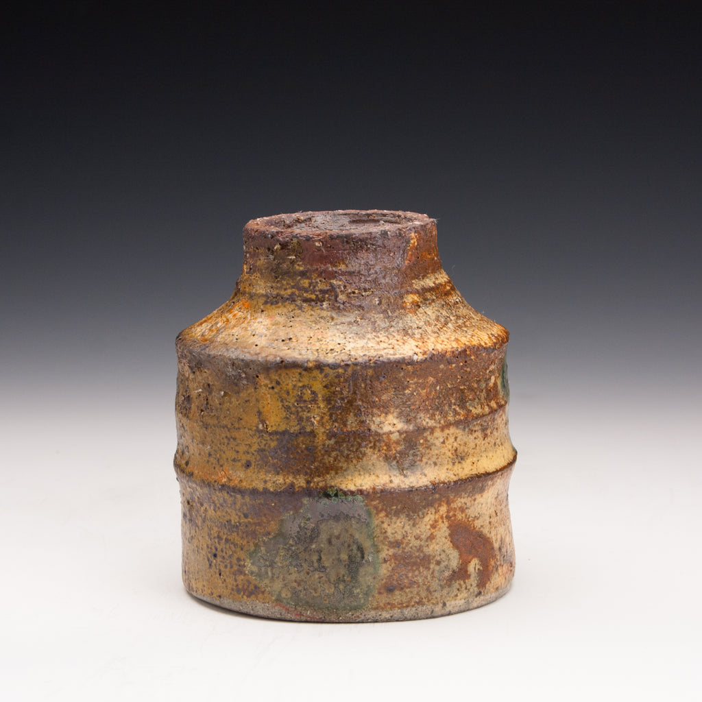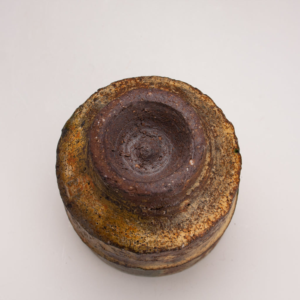 Wood fired local red clay. Yellow ash glaze and green dots. 3.25 x 3.5