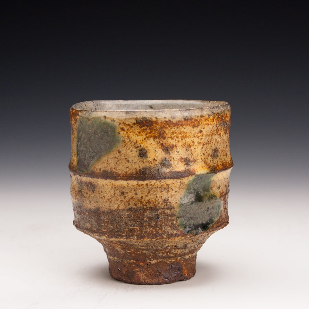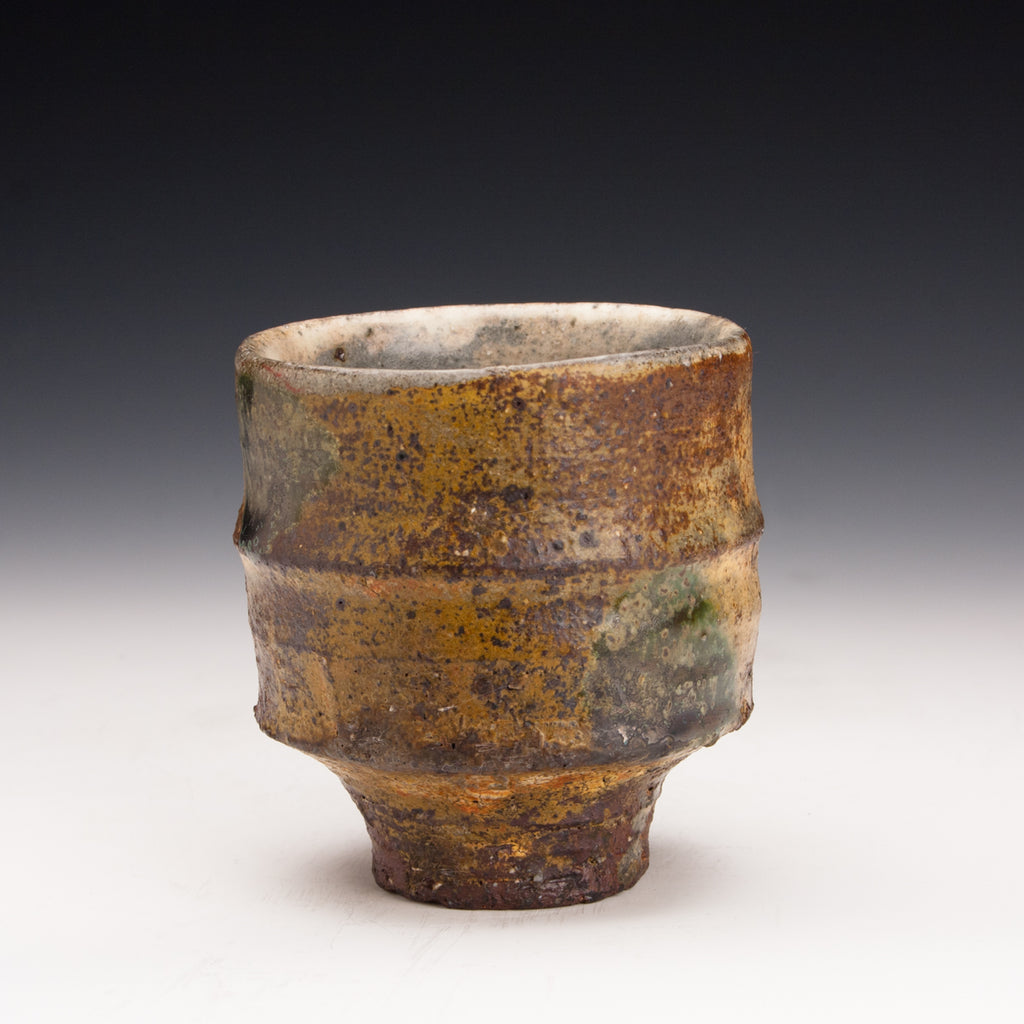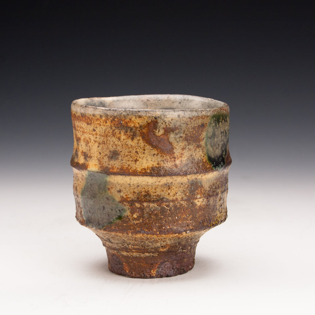 Wood fired local red clay. Yellow ash glaze and green dots. 3.25 x 3.5