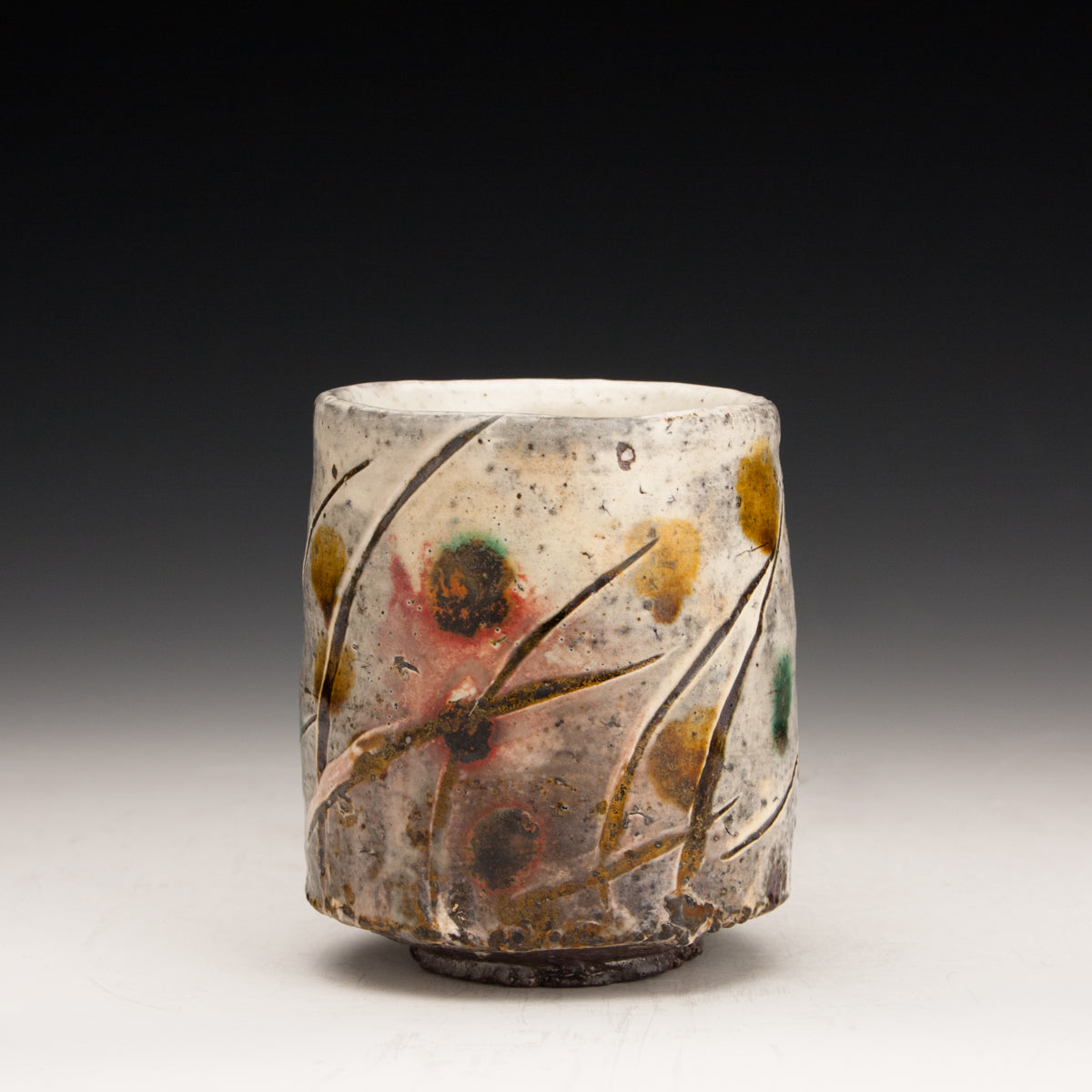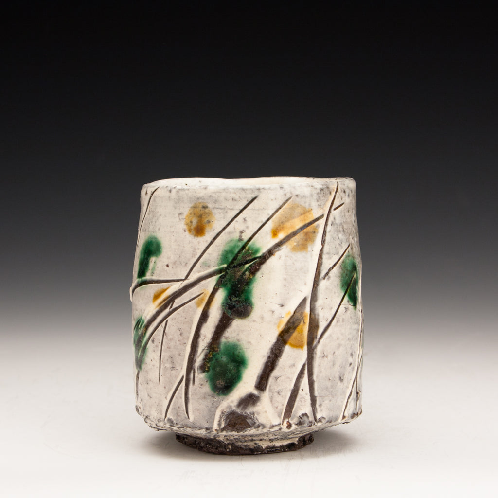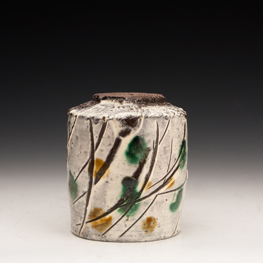 Wood fired local red clay. White slip, sgraffito, clear glaze, green and amber dots. 3 x 3.5