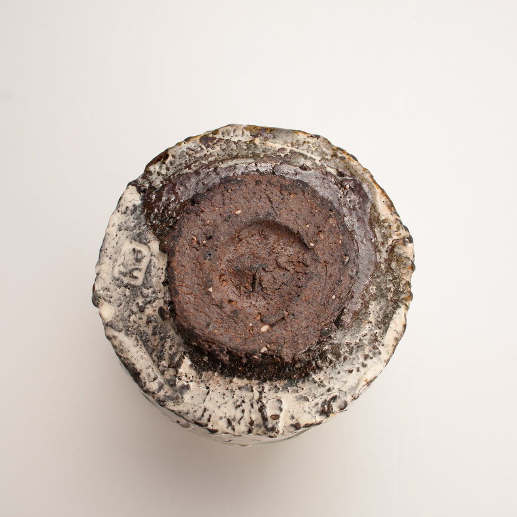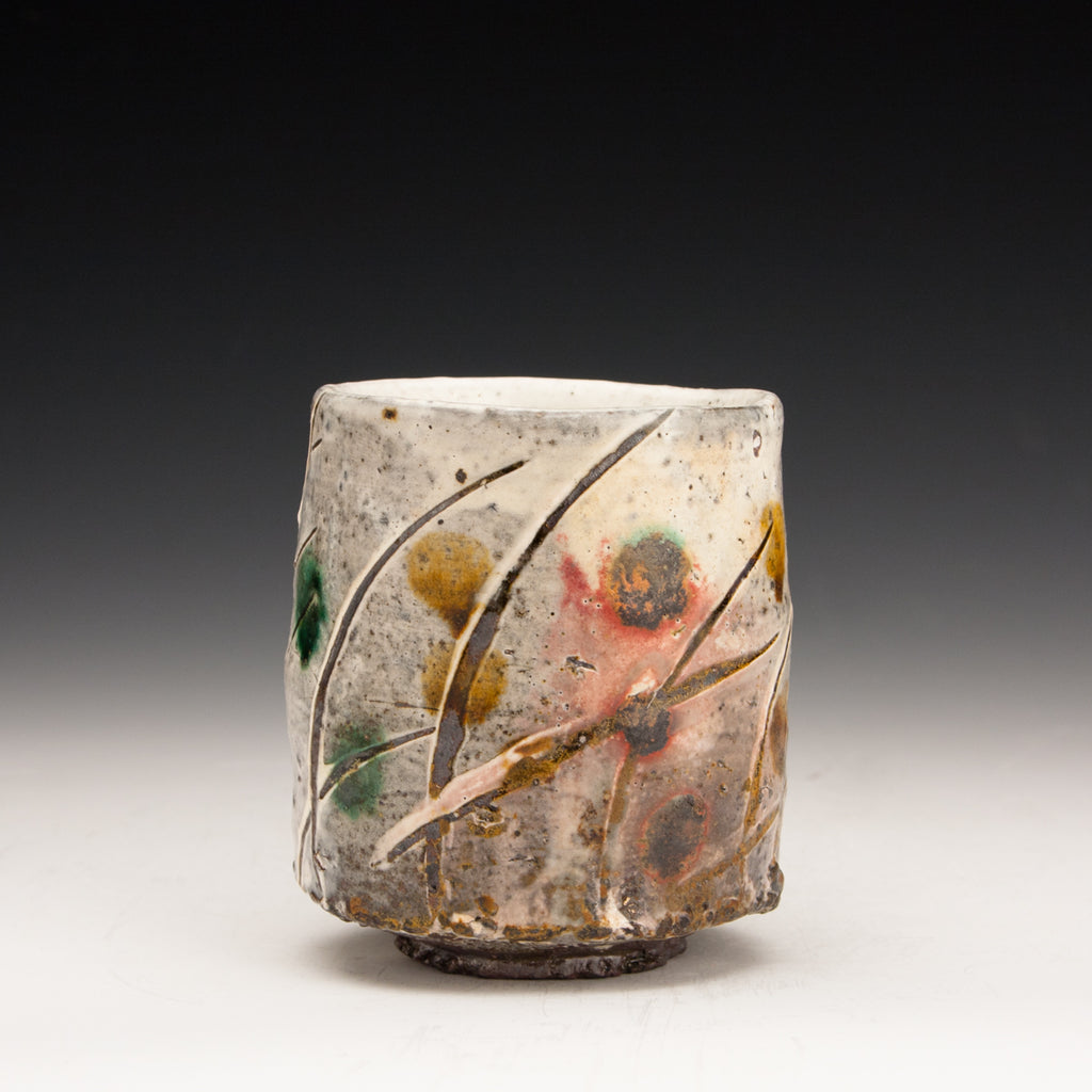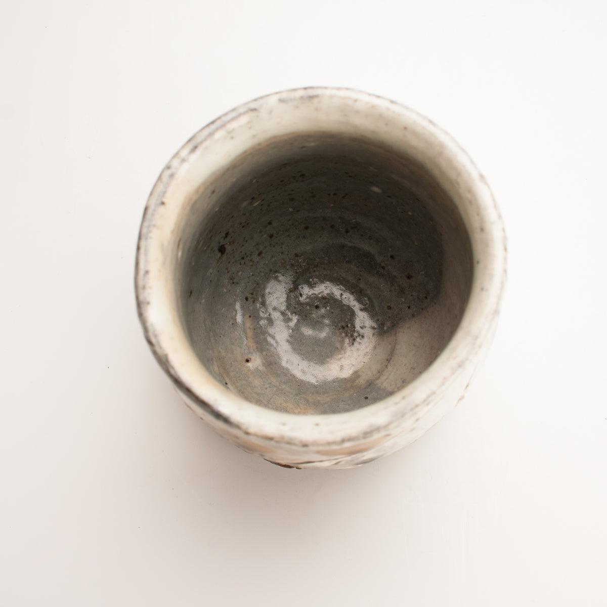 Wood fired local red clay. White slip, sgraffito, clear glaze, green and amber dots. 3 x 3.5