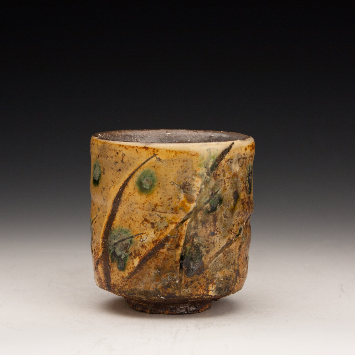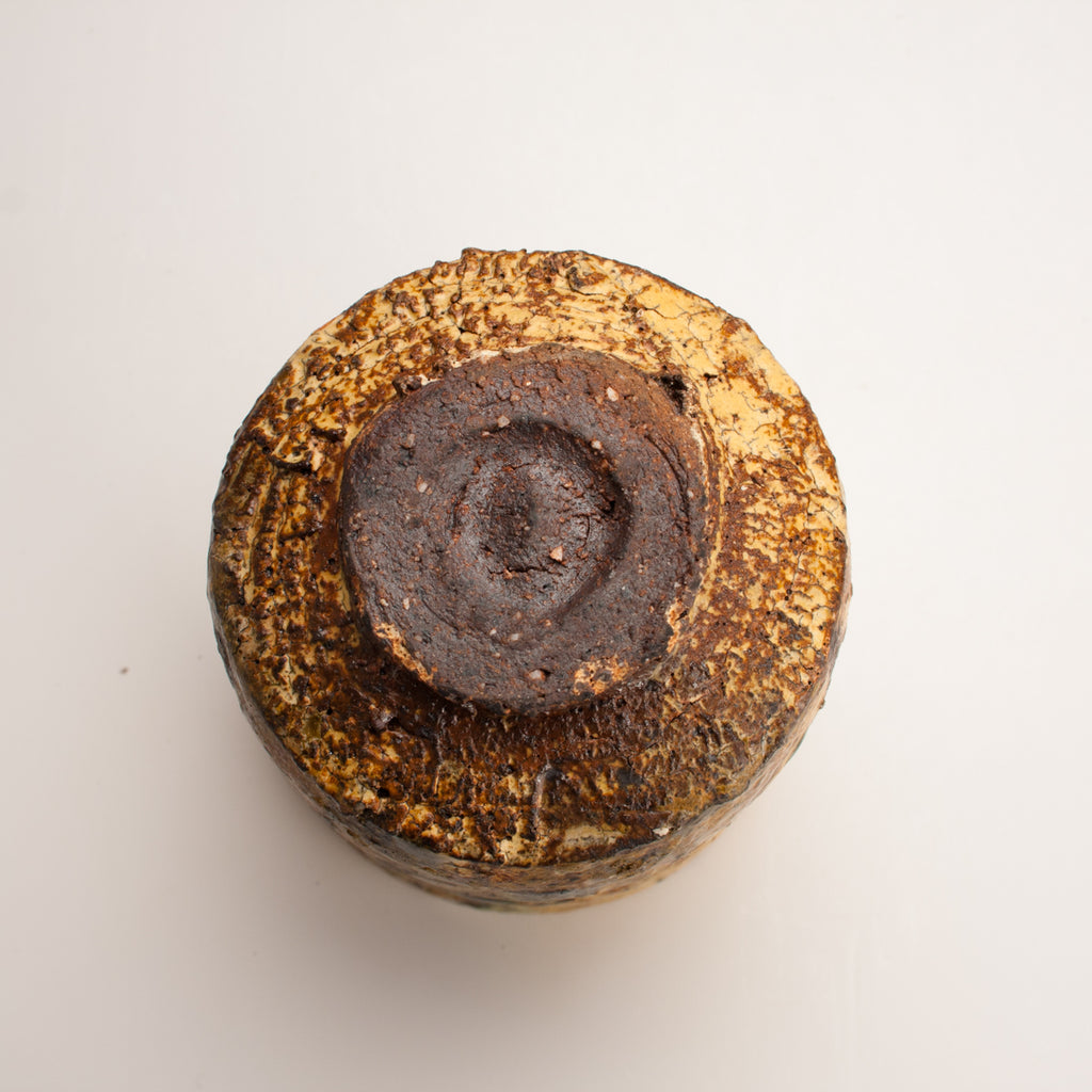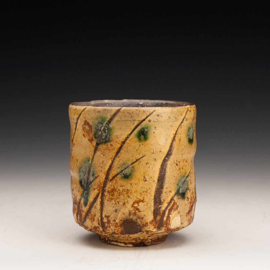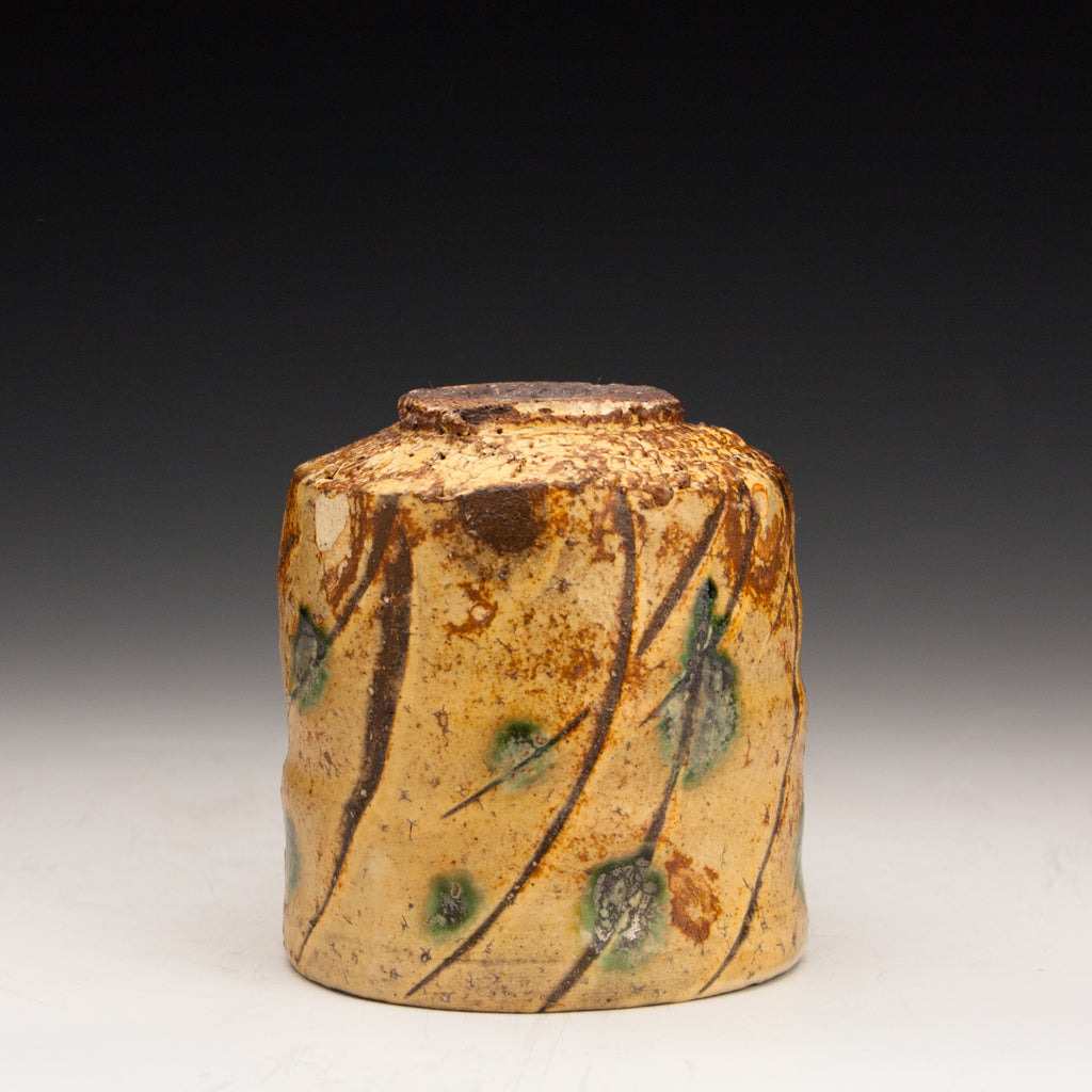 Wood fired local red clay. Yellow Glaze and Green dots. 3 x 3.5