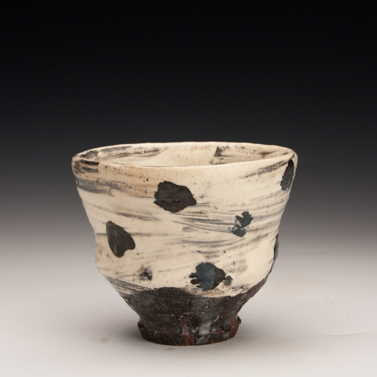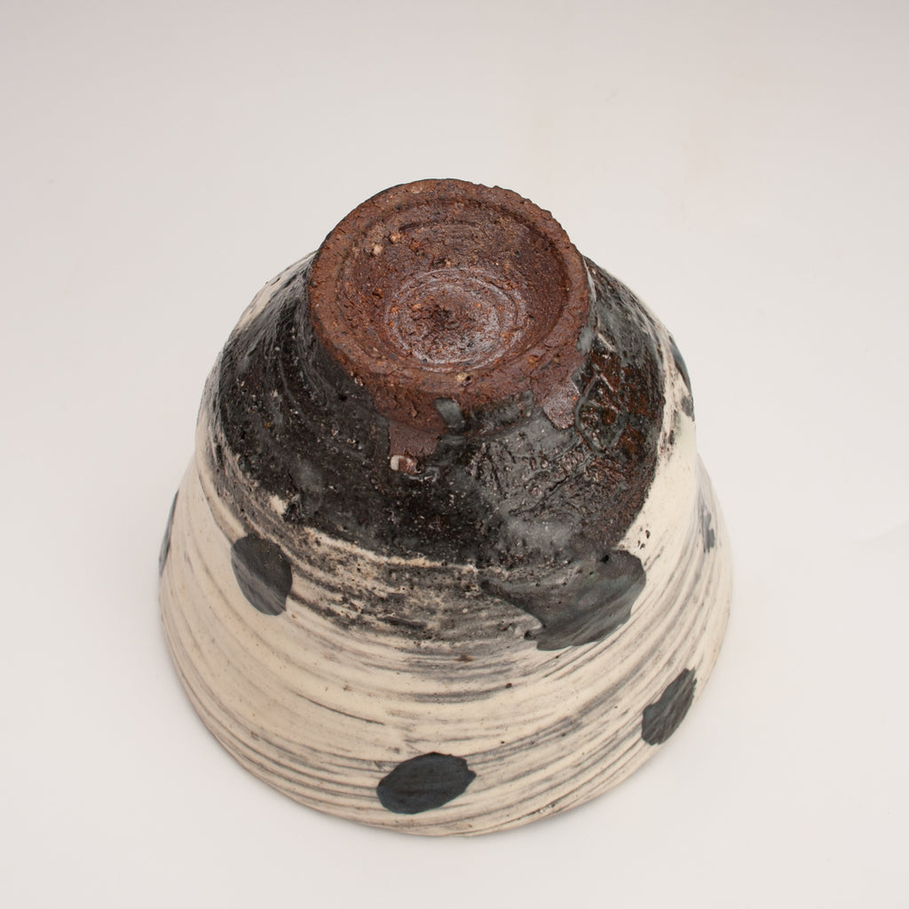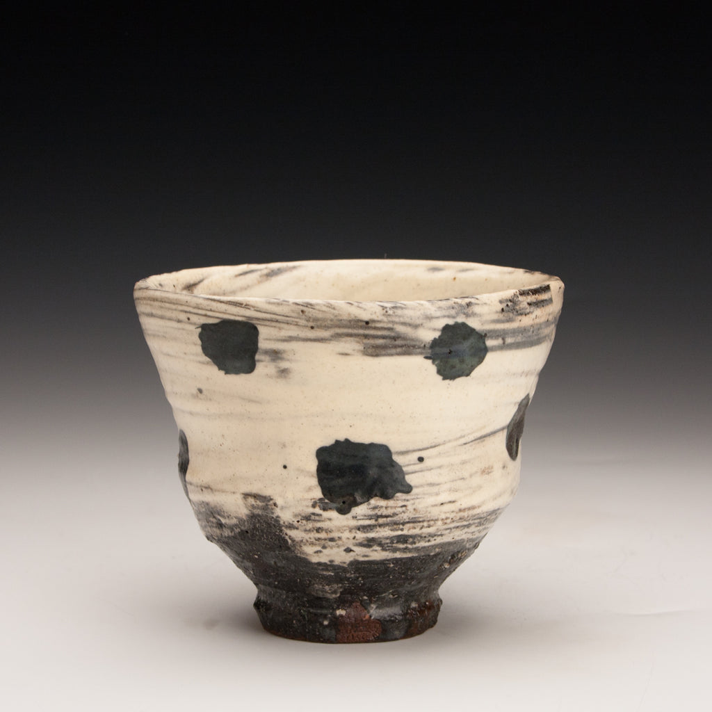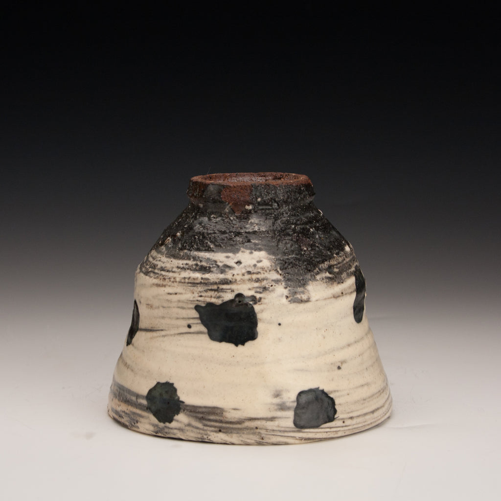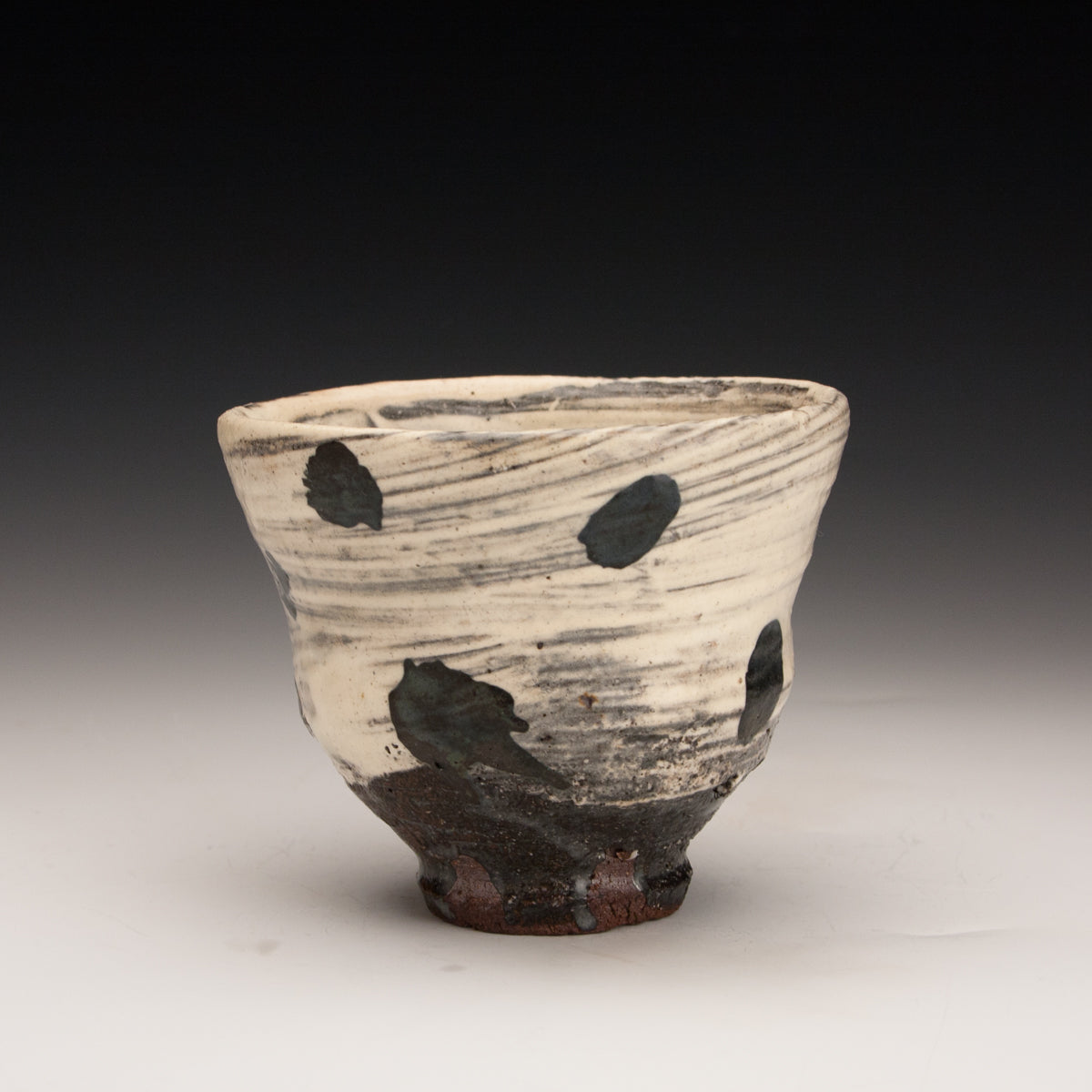 Wood fired local red clay. Hakame slip and clear glaze with black iron deco. 4 x 3.25