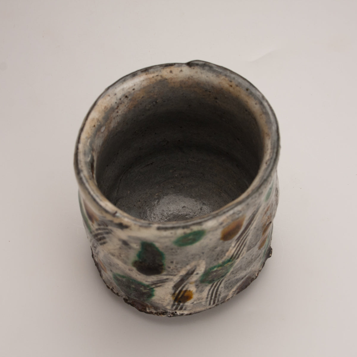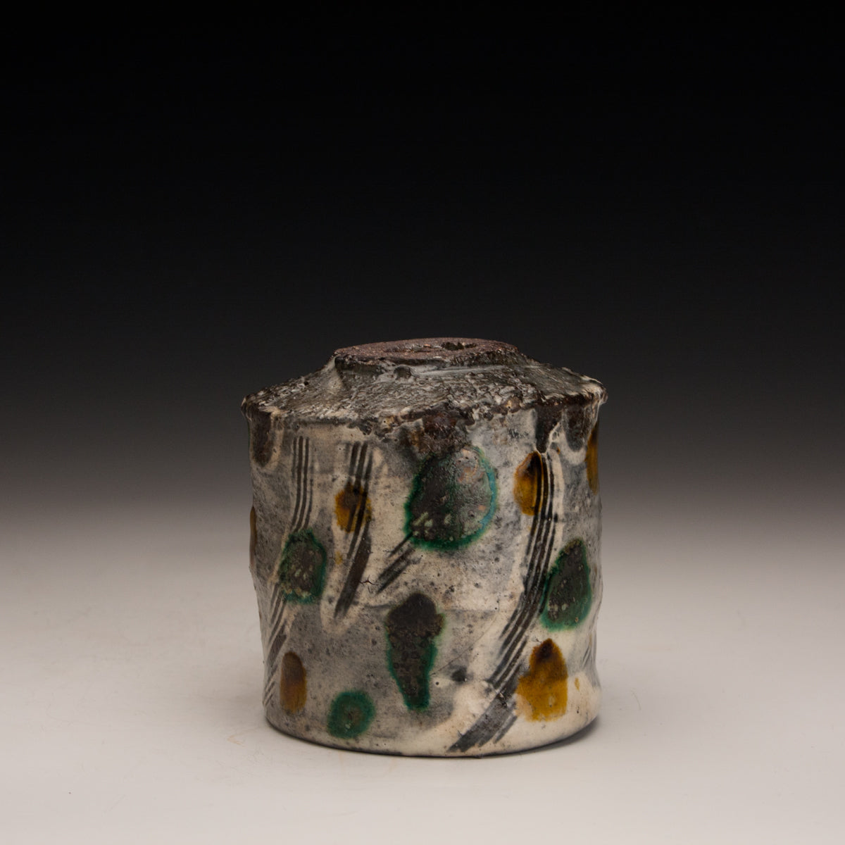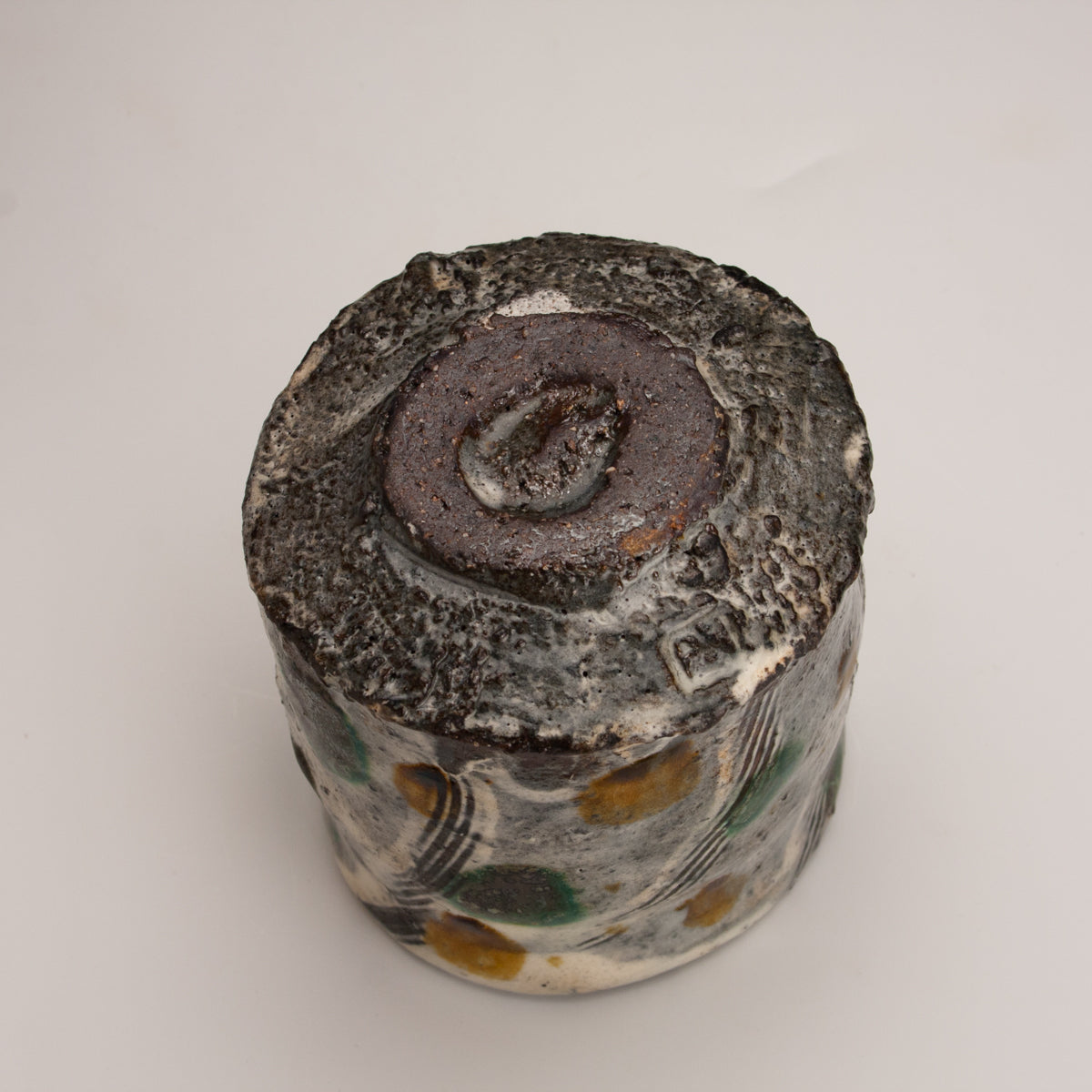 Wood fired local red clay. White slip and clear glaze with green and amber dots.  3.25 x 3.25