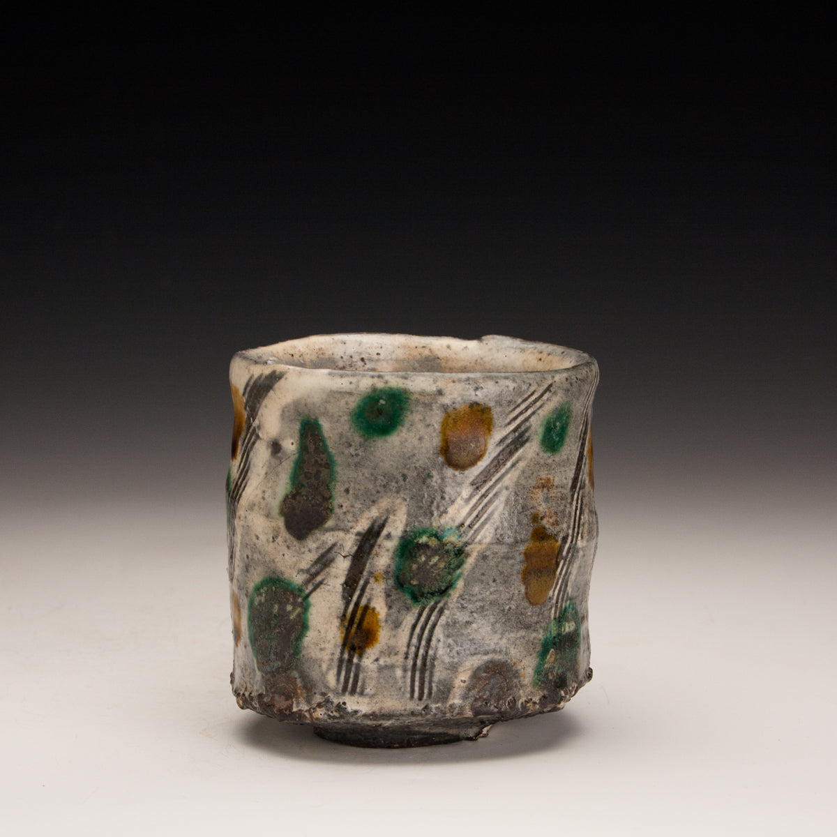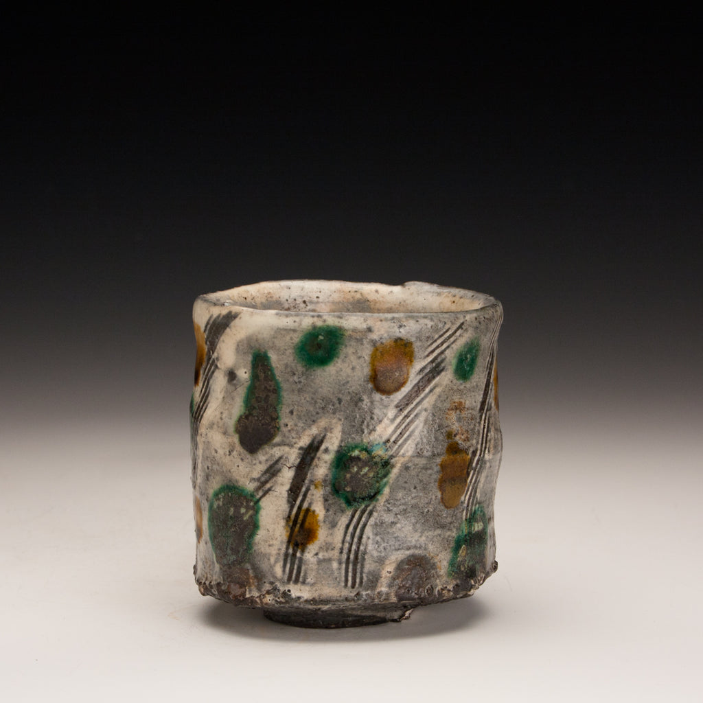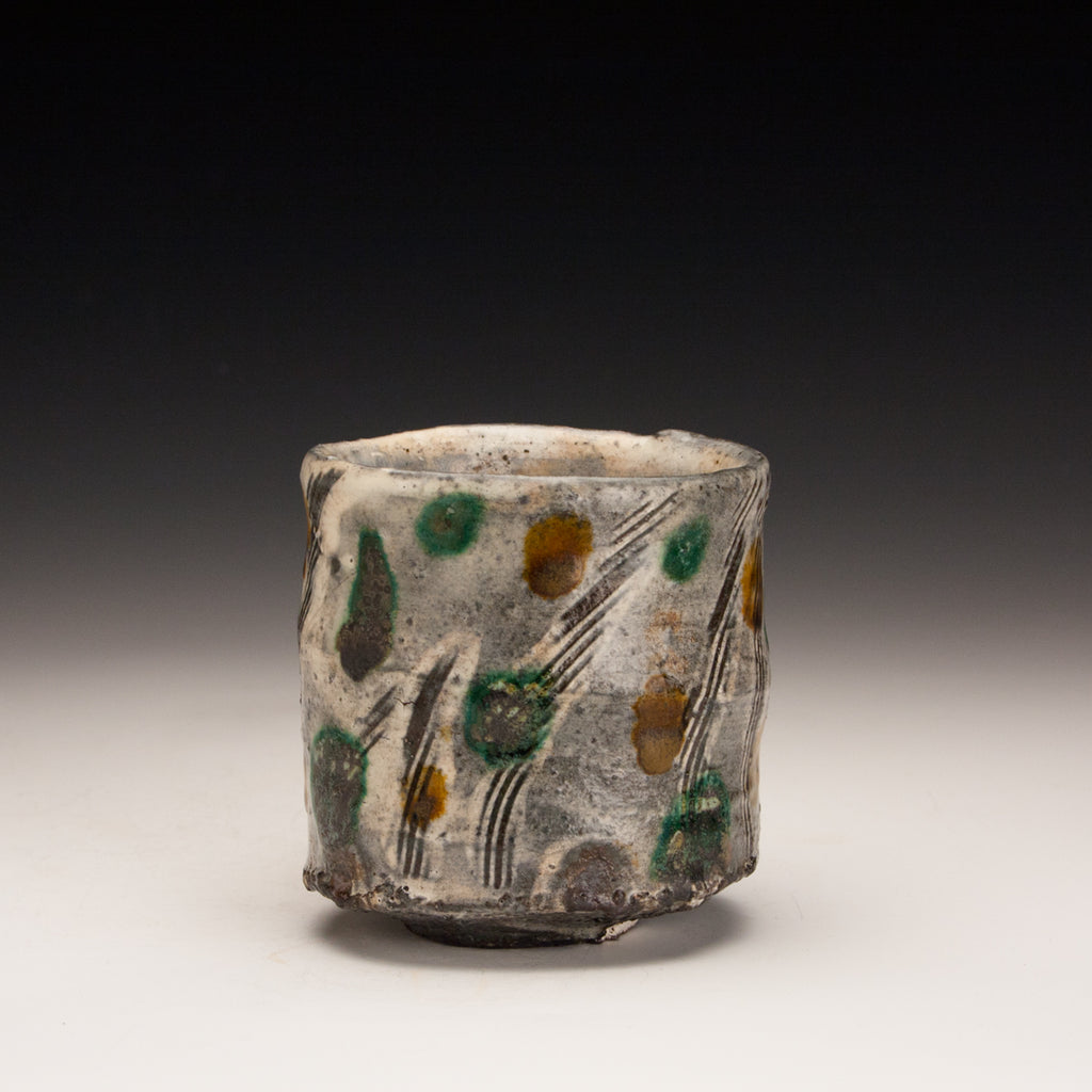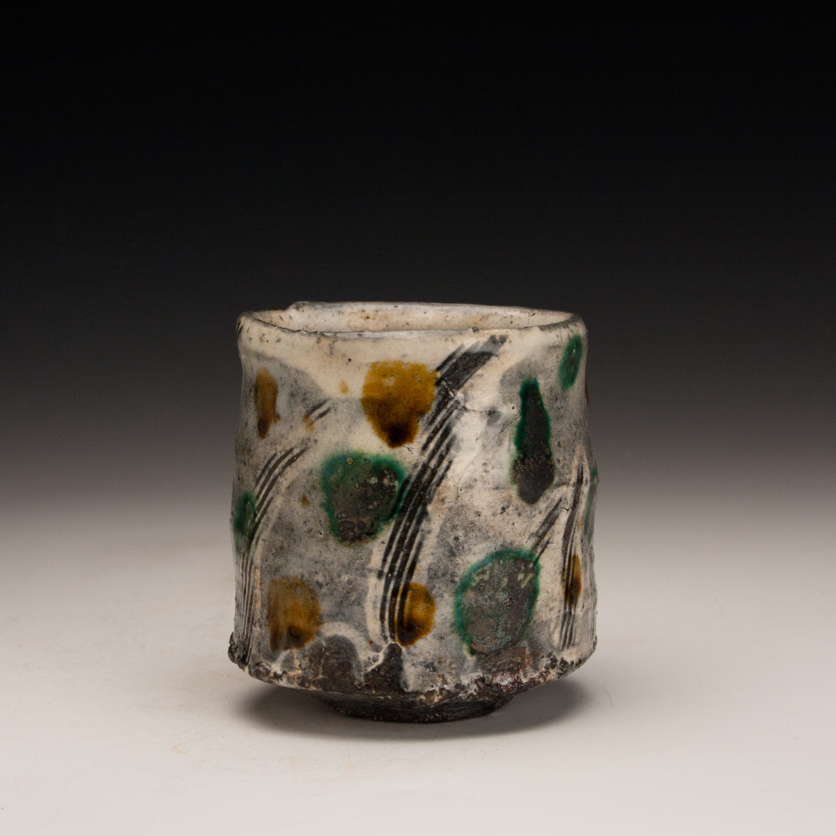 Wood fired local red clay. White slip and clear glaze with green and amber dots.  3.25 x 3.25