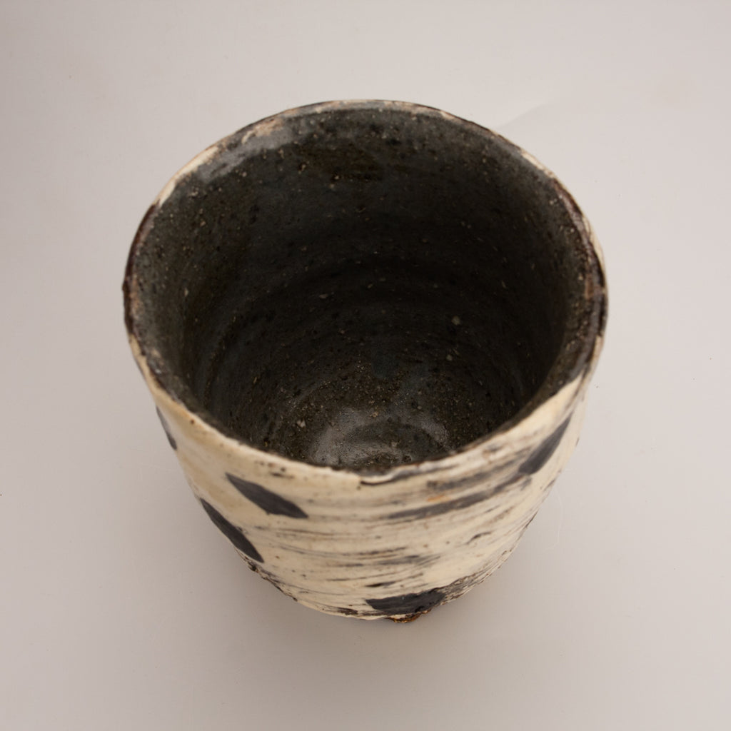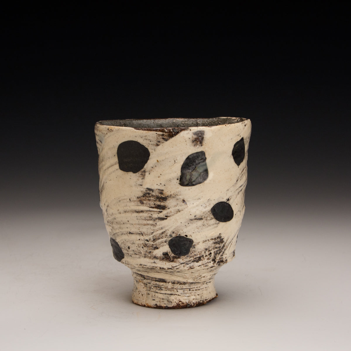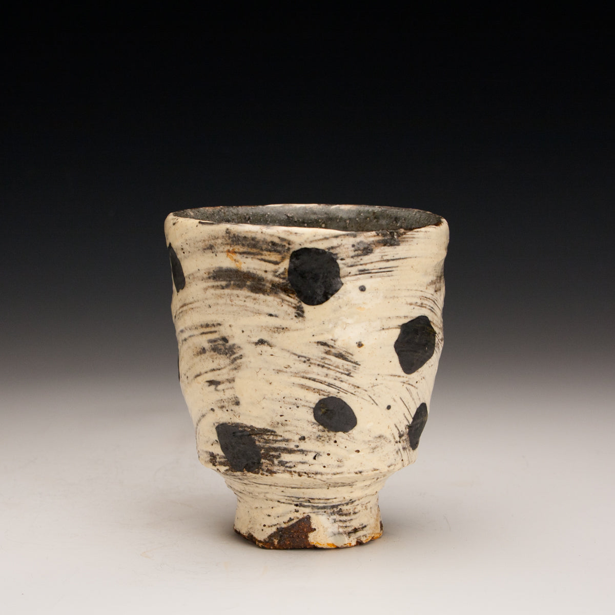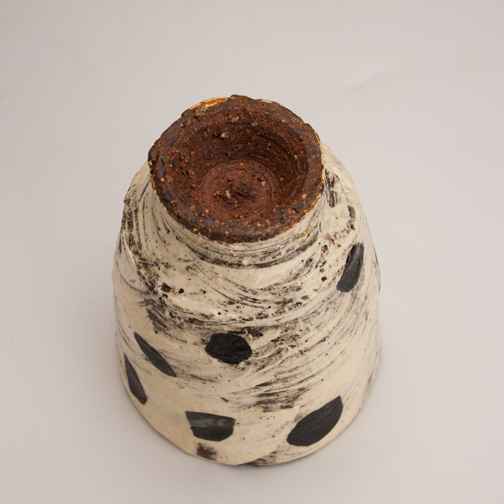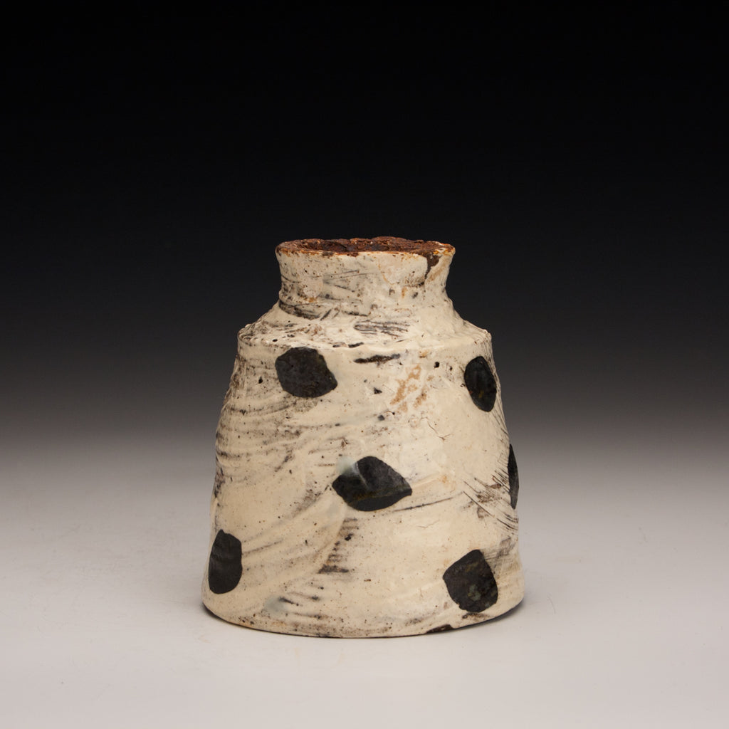 Wood fired local red clay. Brushed slip and clear glaze with black iron dots. 3.5 x 3.75