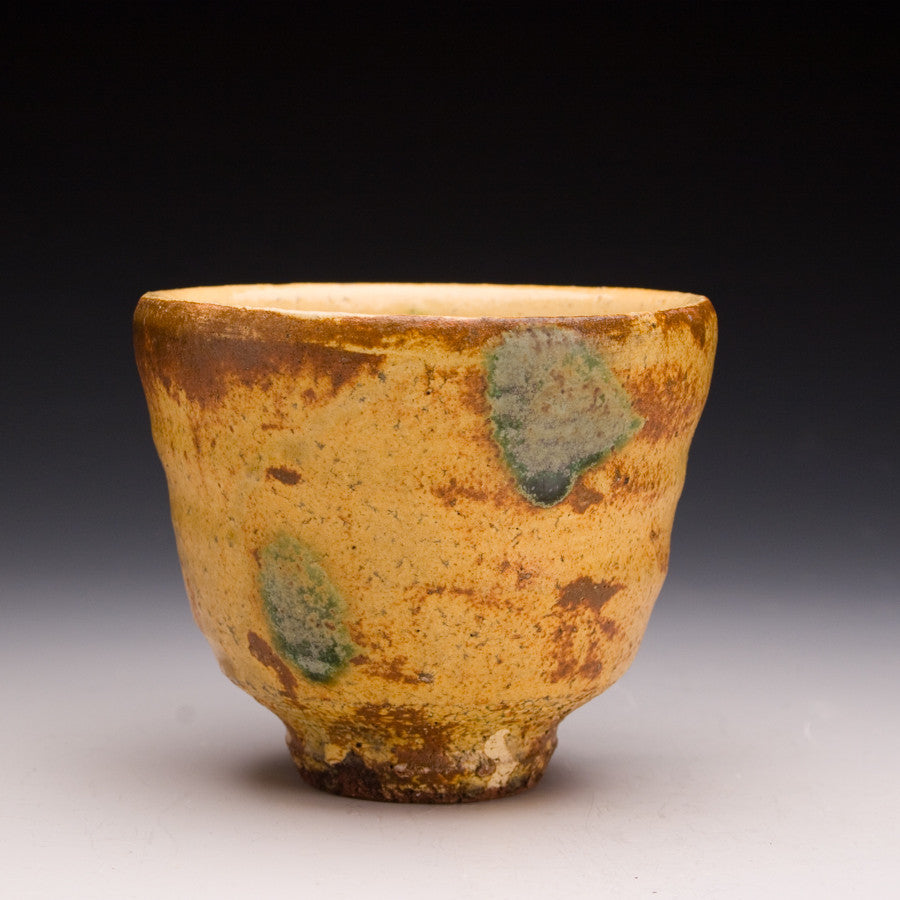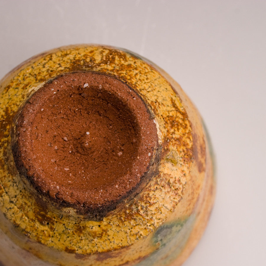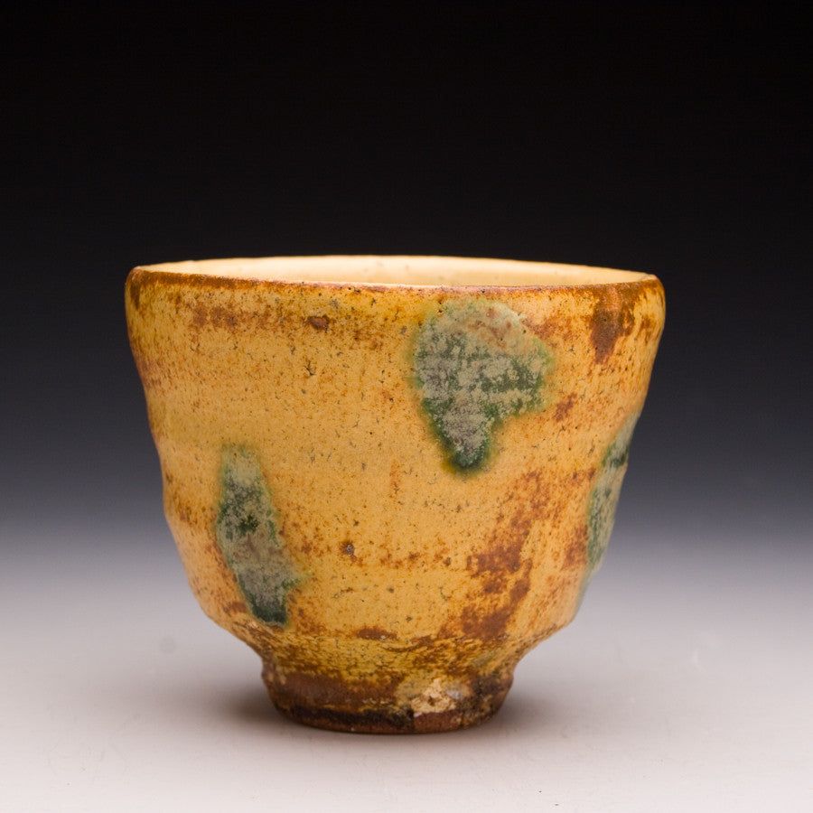 Wood fired local red clay. White slip and green under ash glaze. 3.25 x 3.5