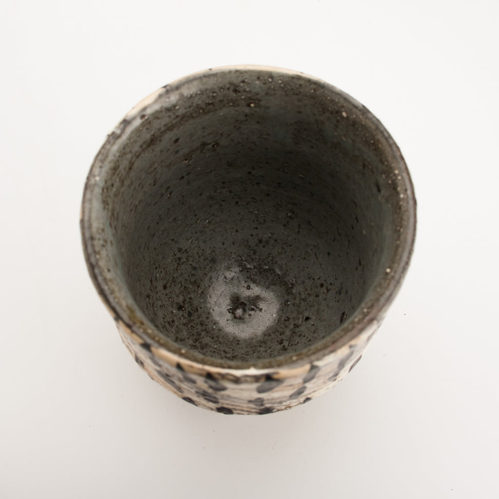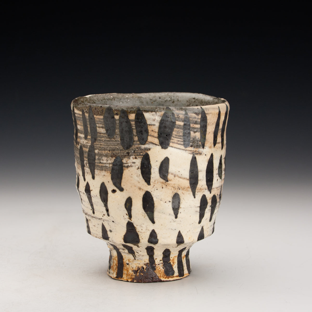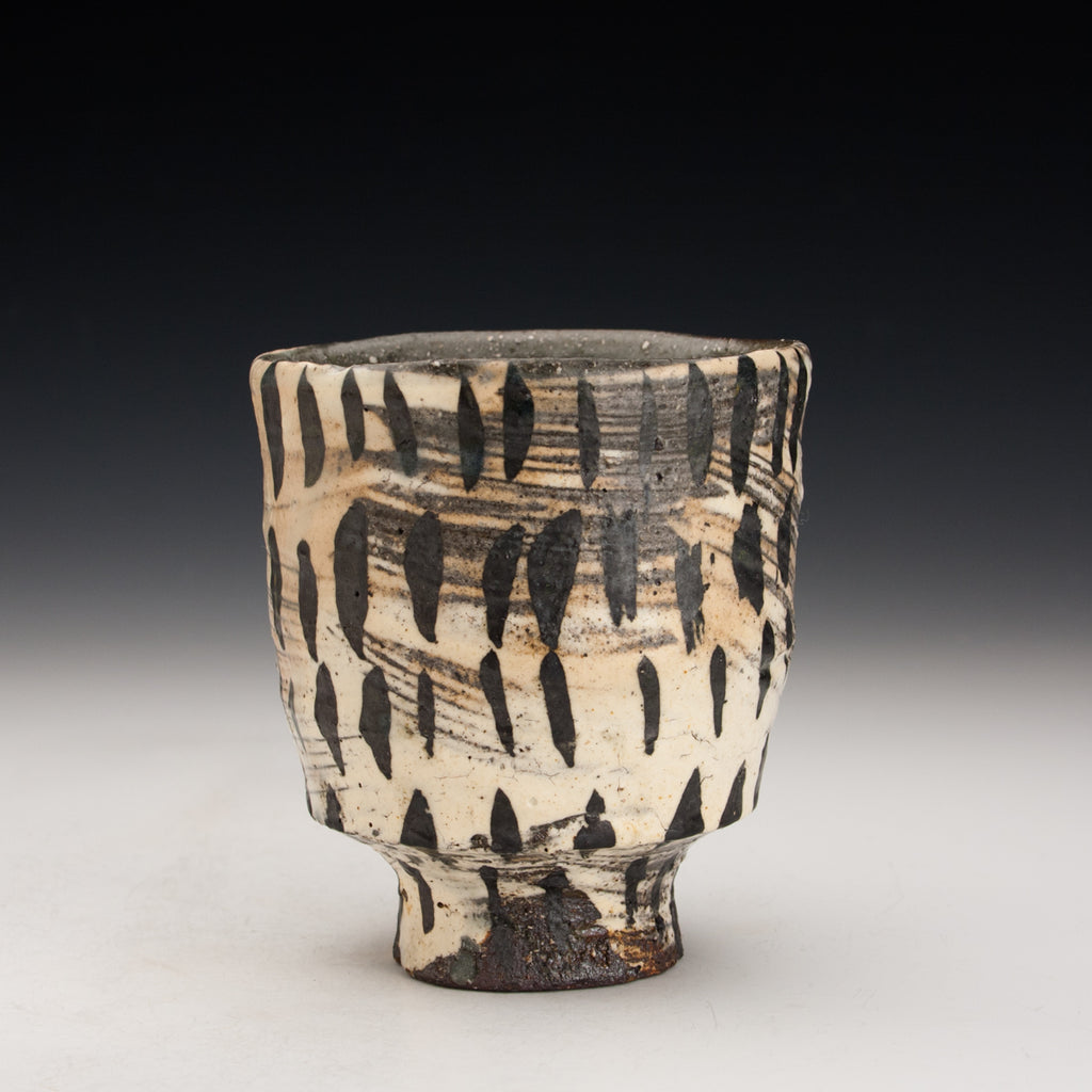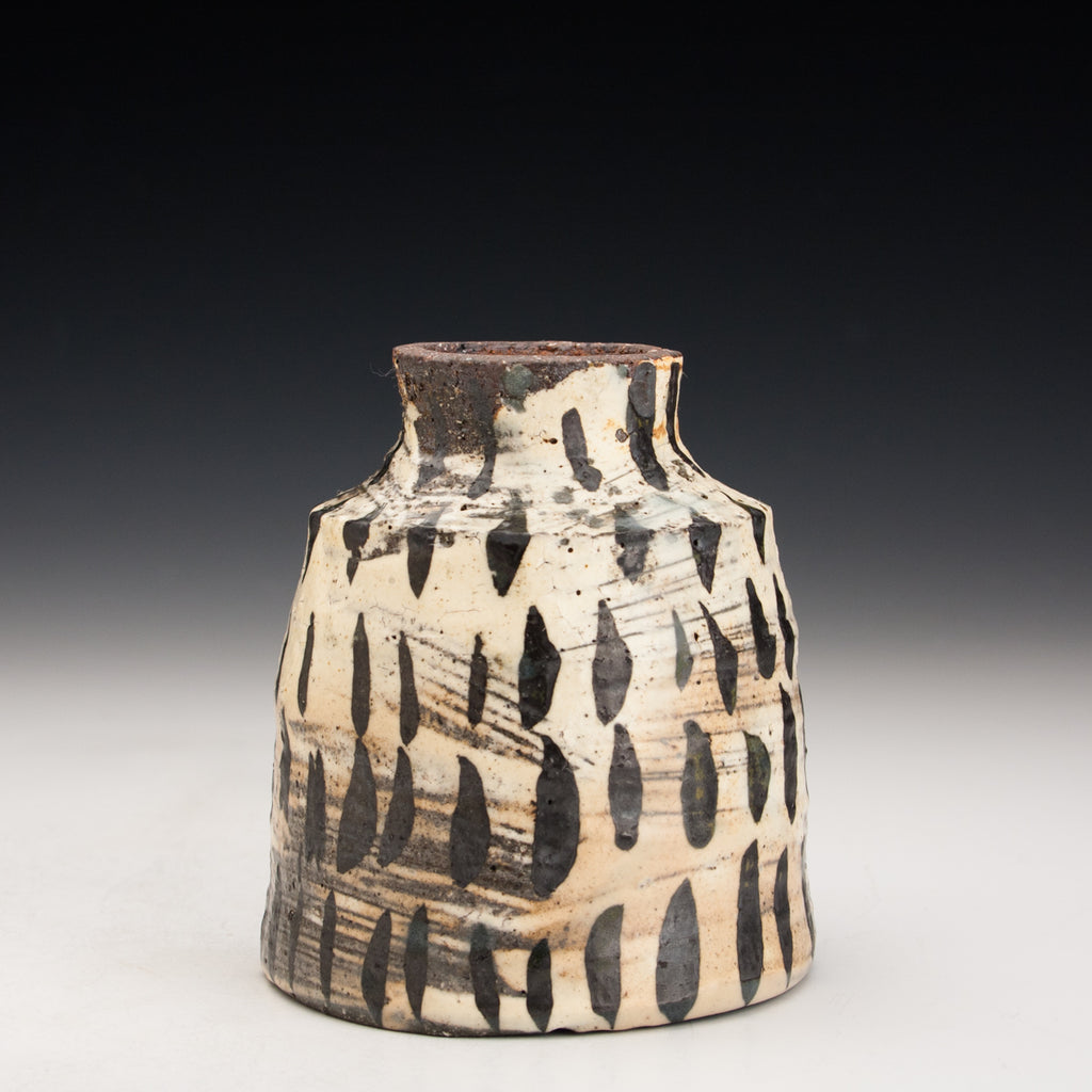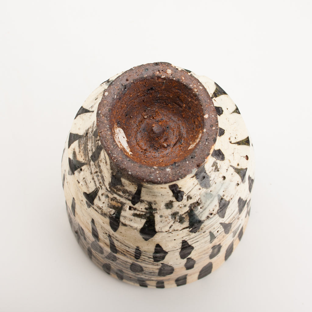 Wood fired local red clay. Brushed slip and clear glaze with black iron. 3.75 x 3.5