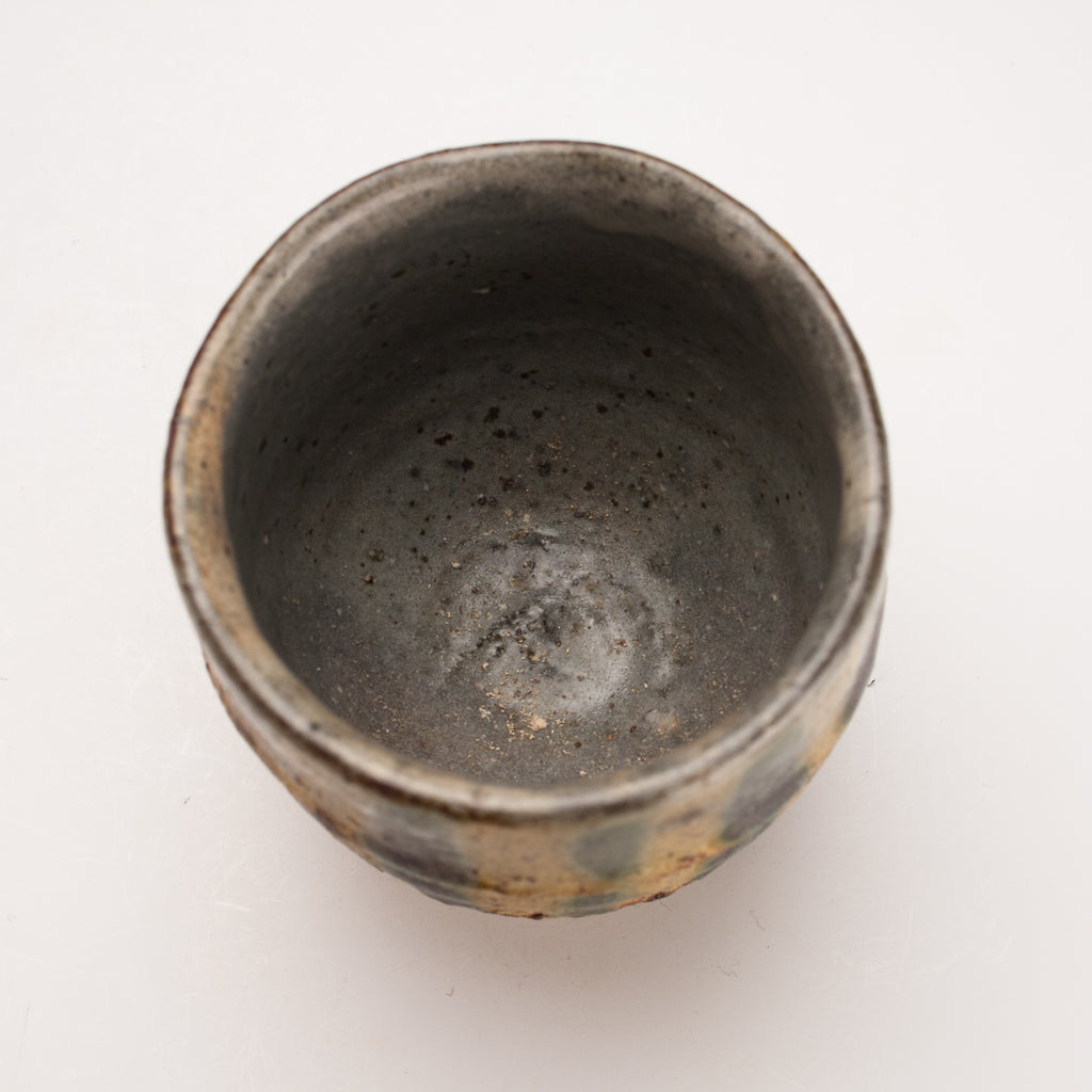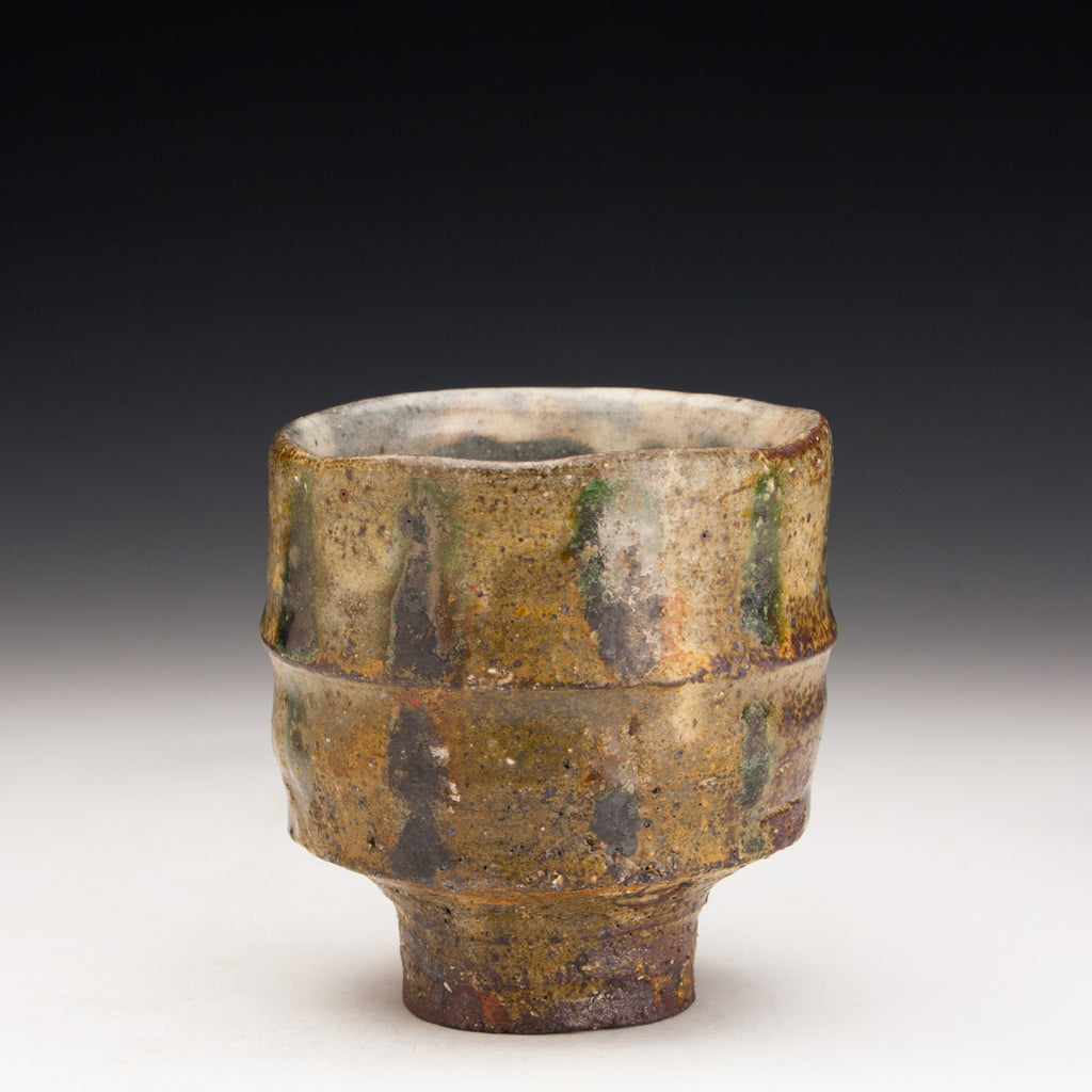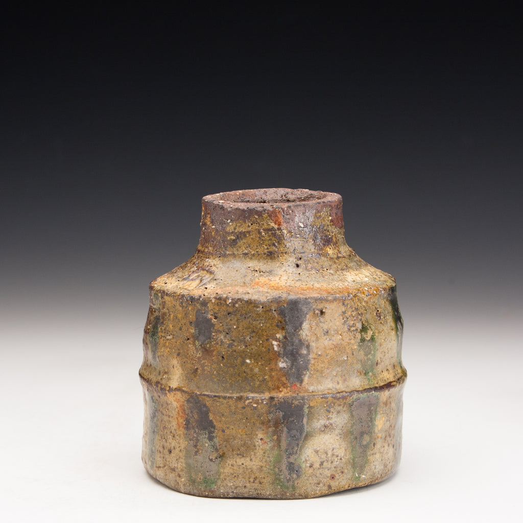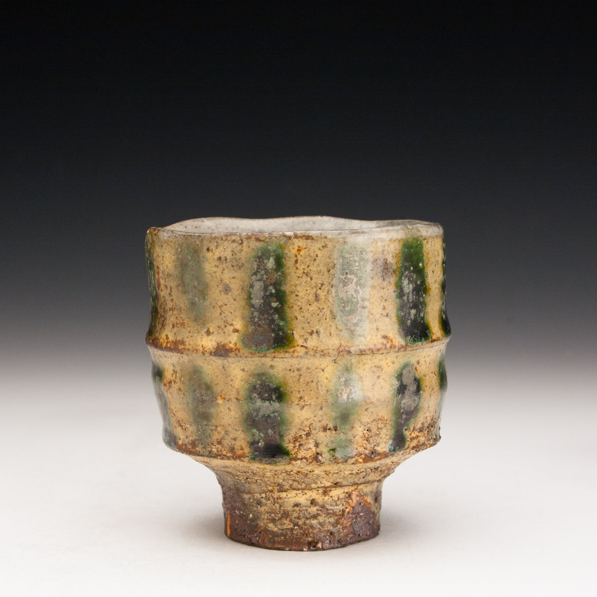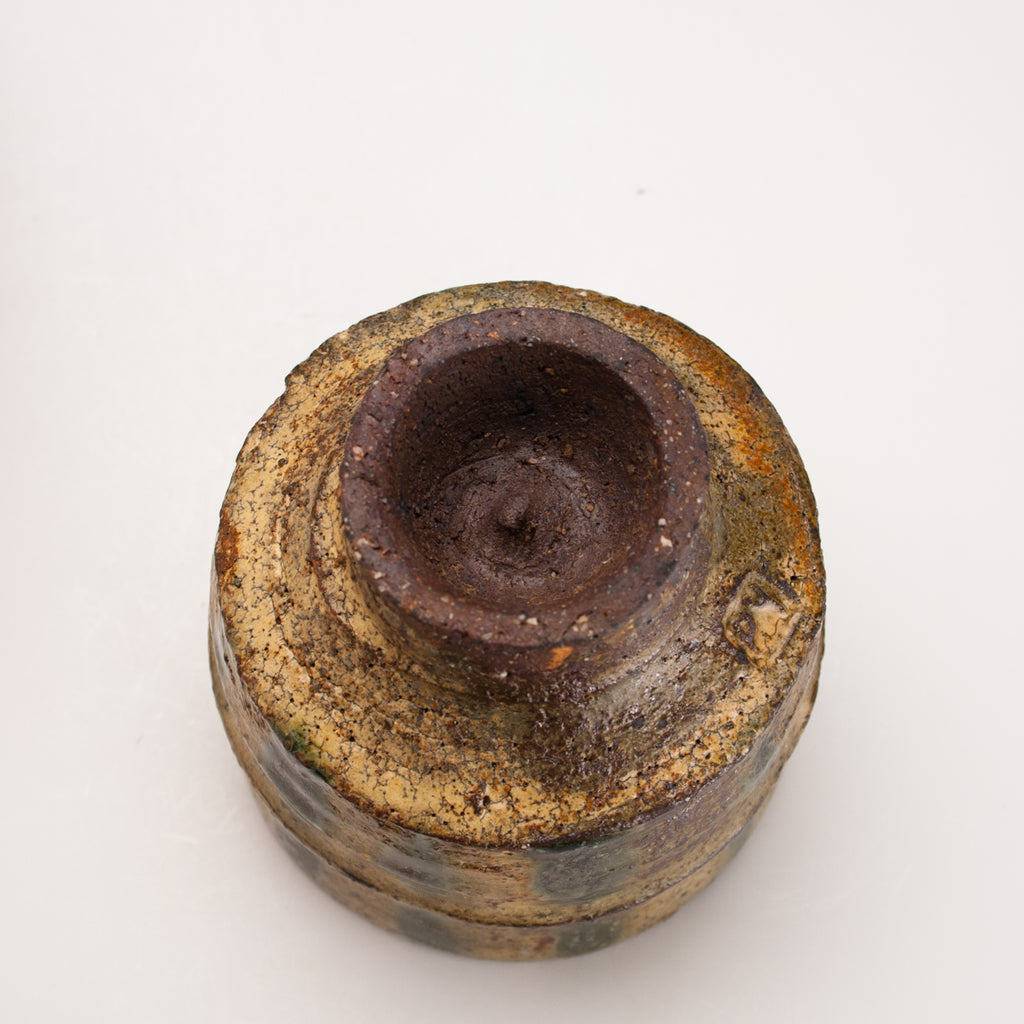 Wood fired local red clay. Yellow ash glaze with copper green deco. 3.5 x 3.25