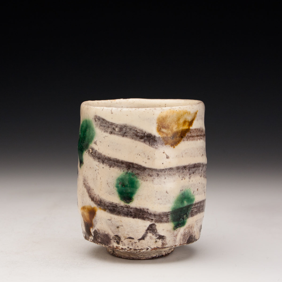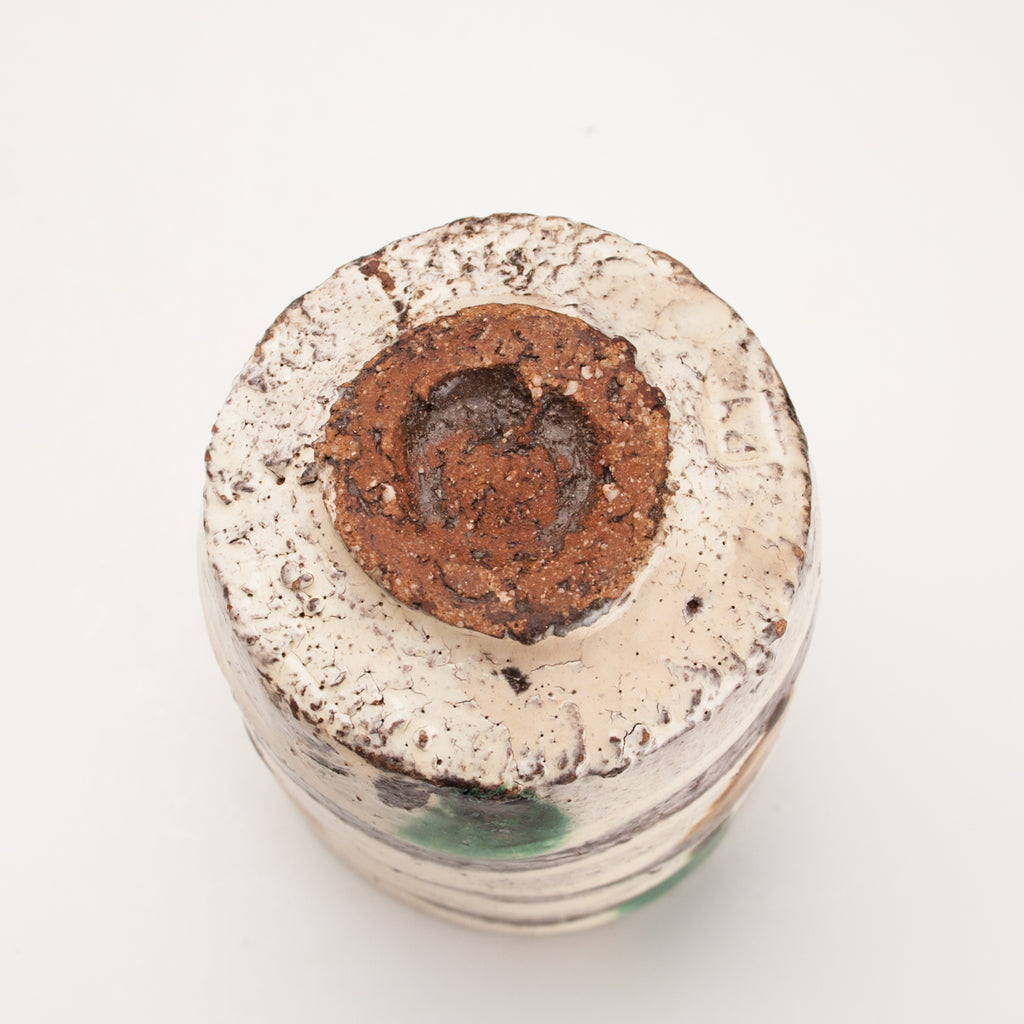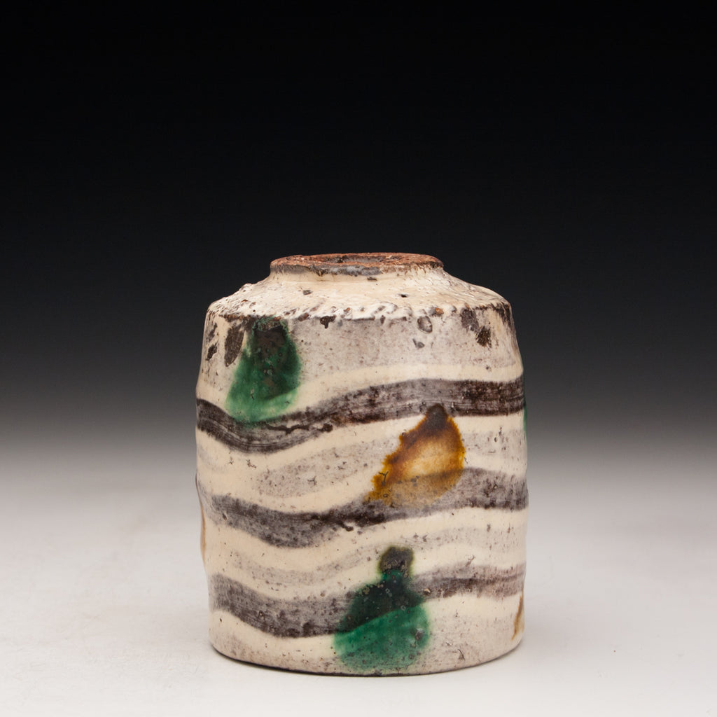 Wood fired local red clay. white slip, finger wipes, clear glaze with green and amber. 3.75 x 3.25