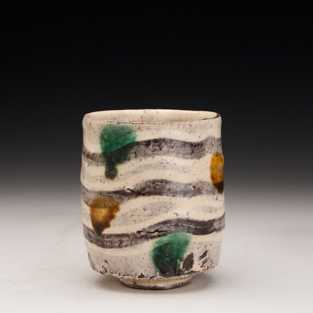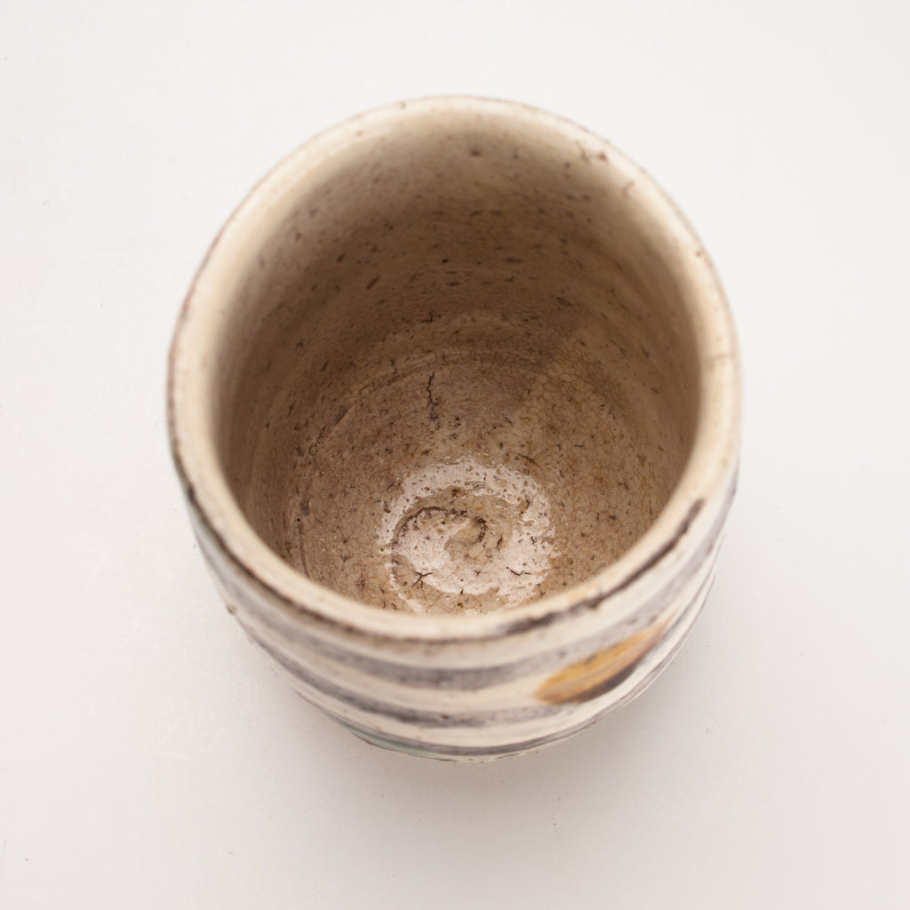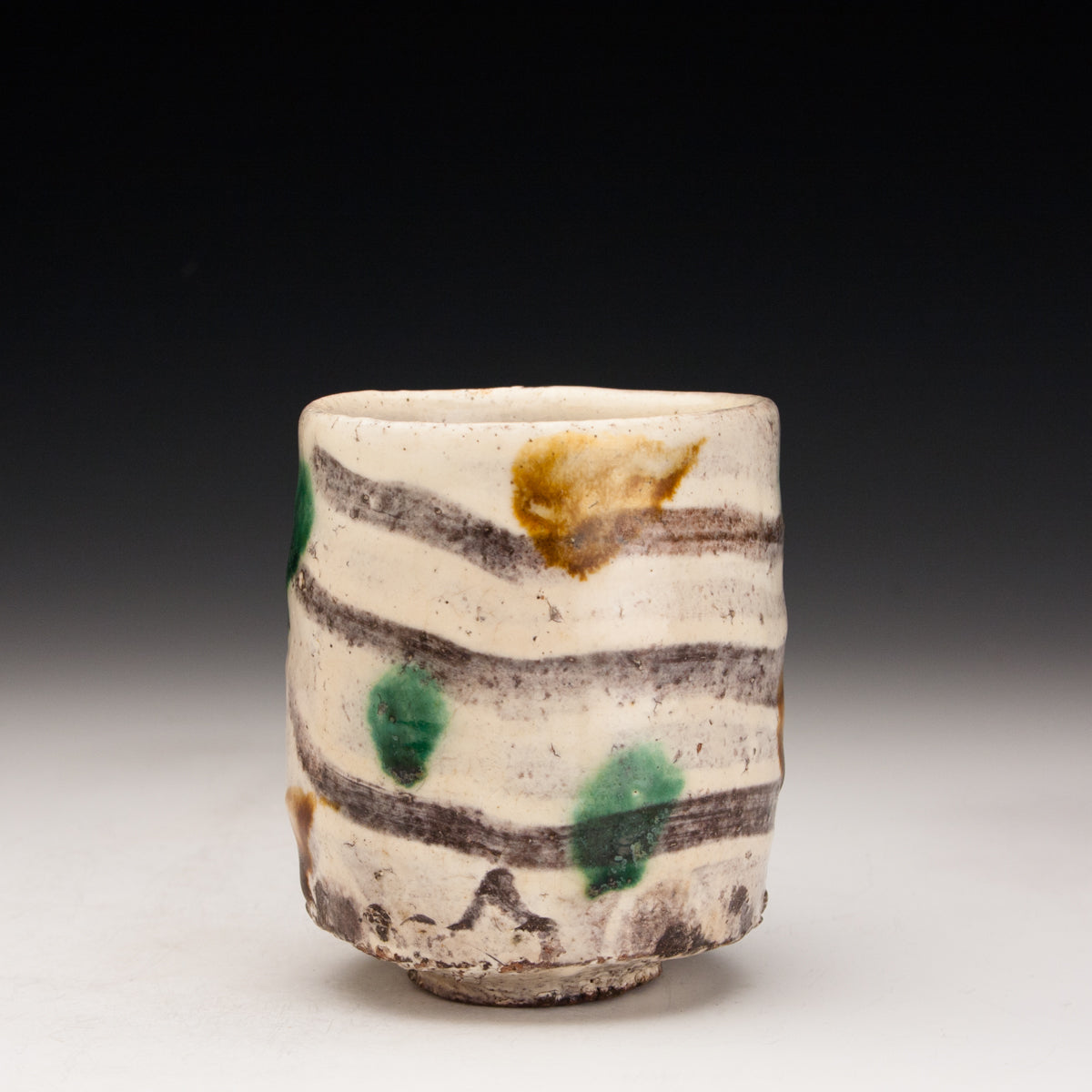 Wood fired local red clay. white slip, finger wipes, clear glaze with green and amber. 3.75 x 3.25