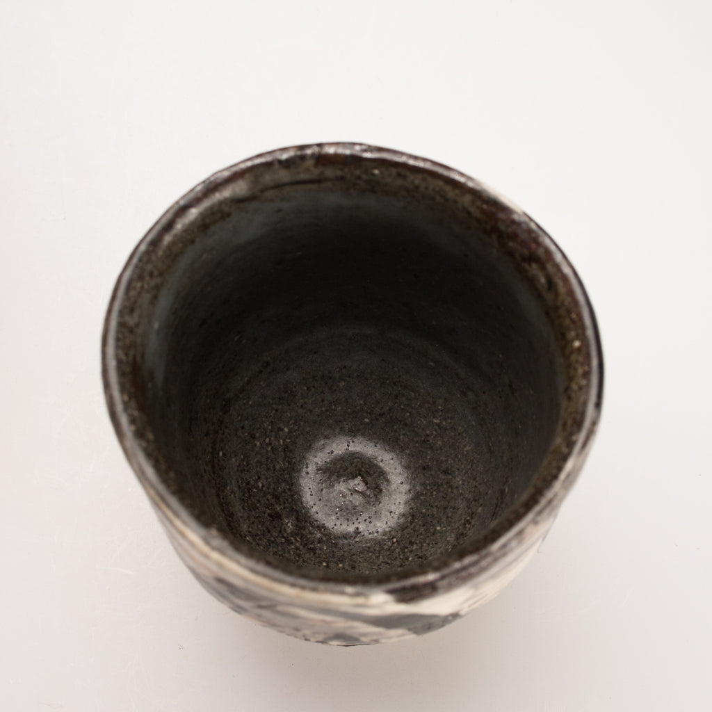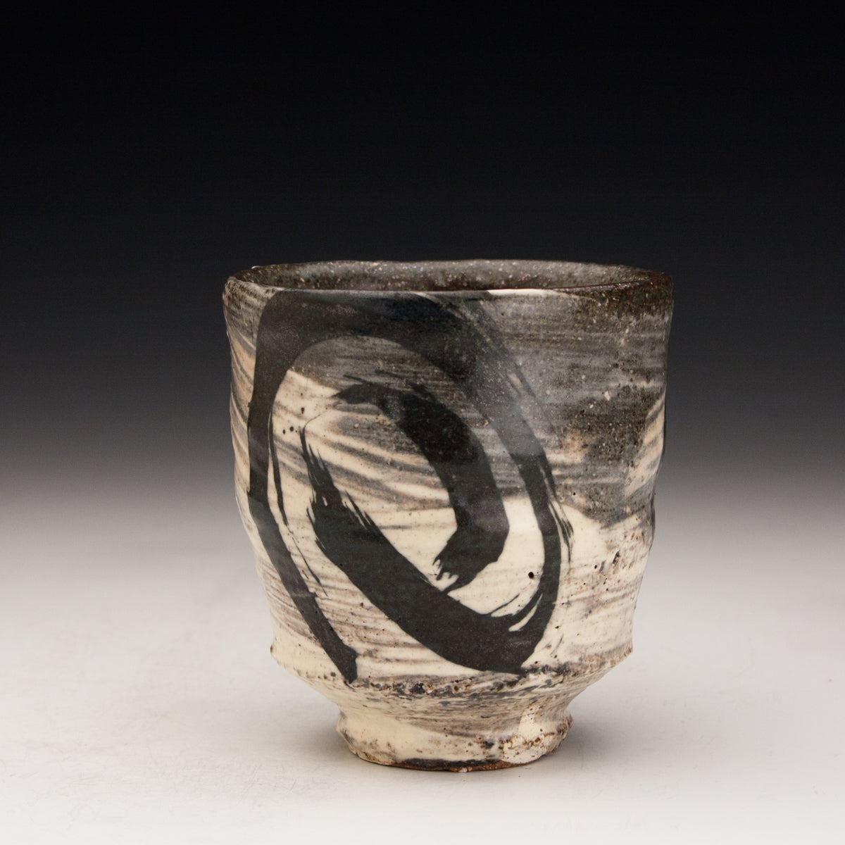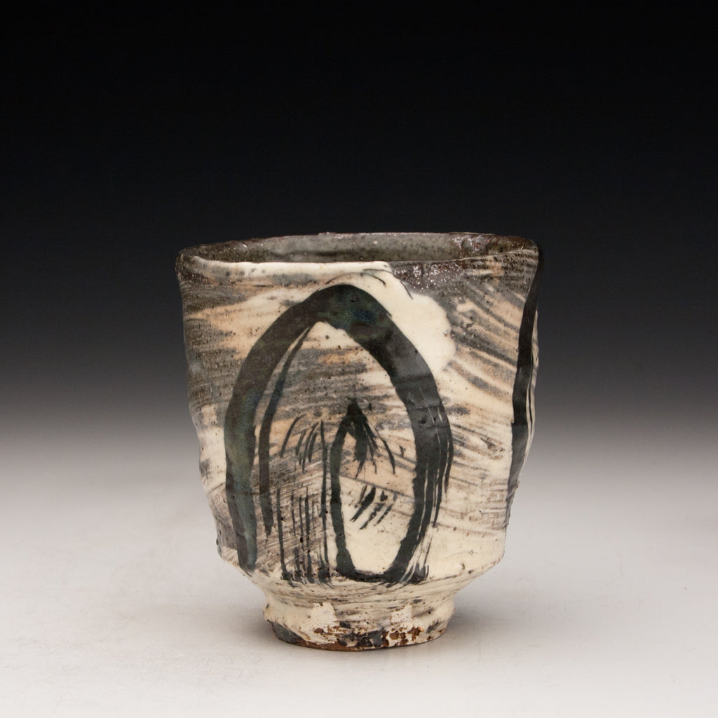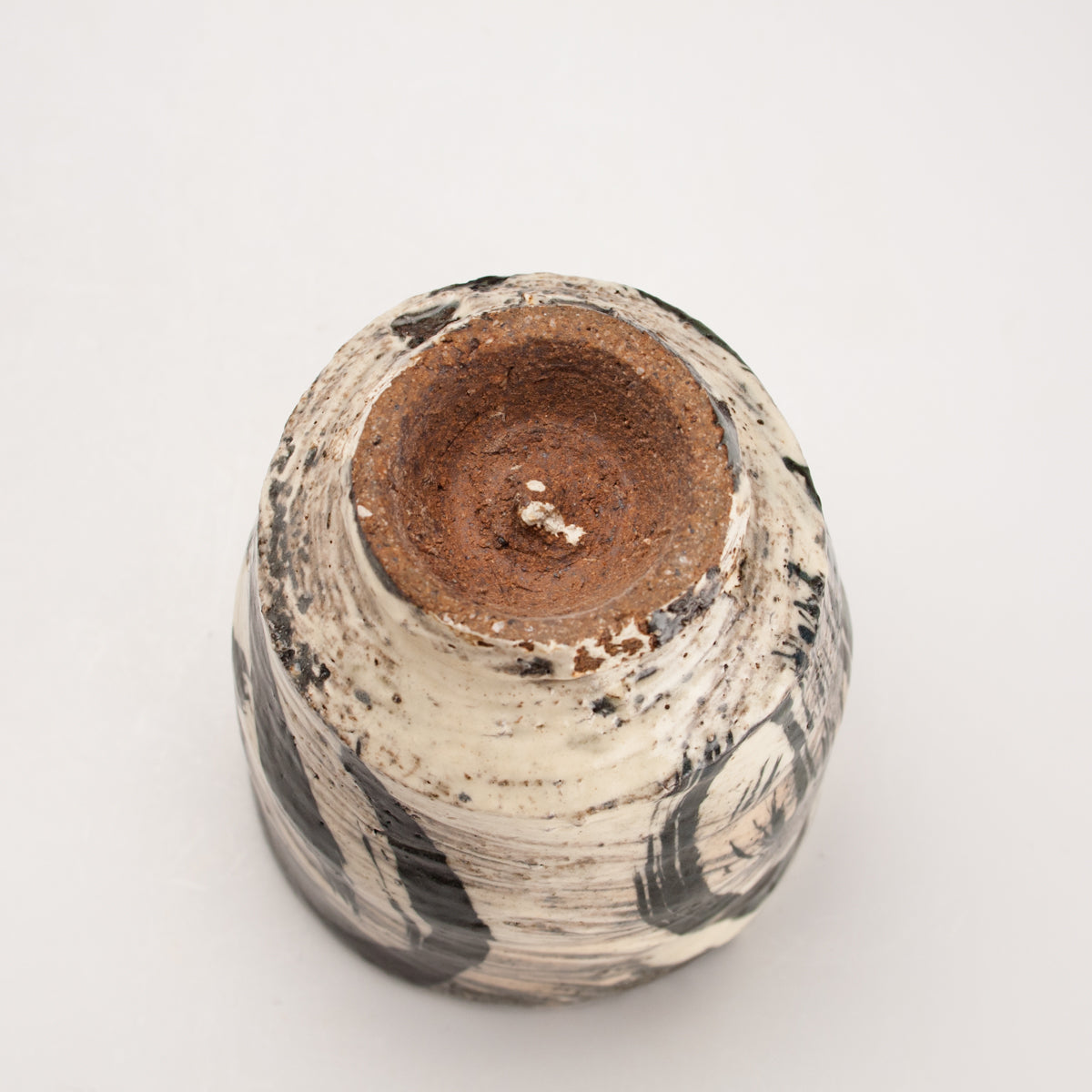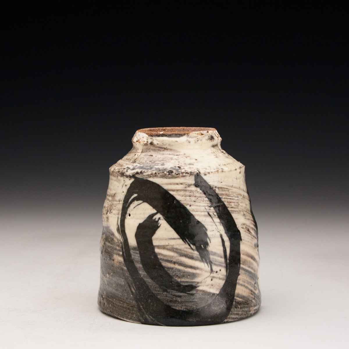 Wood fired local red clay. Brushed slip and clear glaze with black iron deco. 3.75 x 3.25