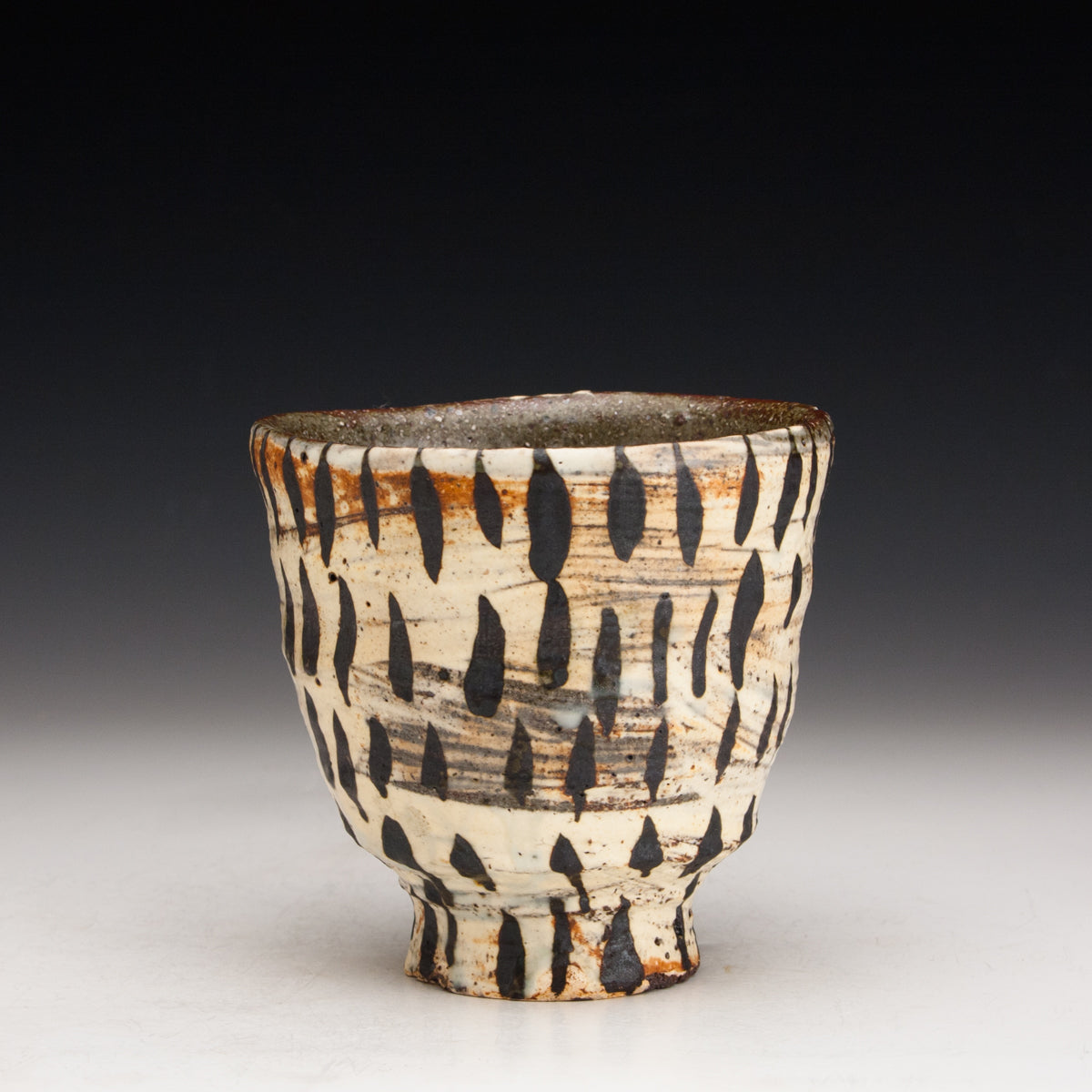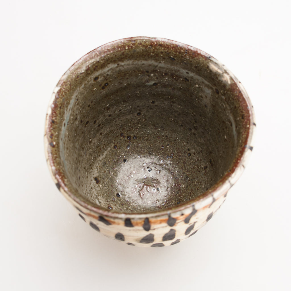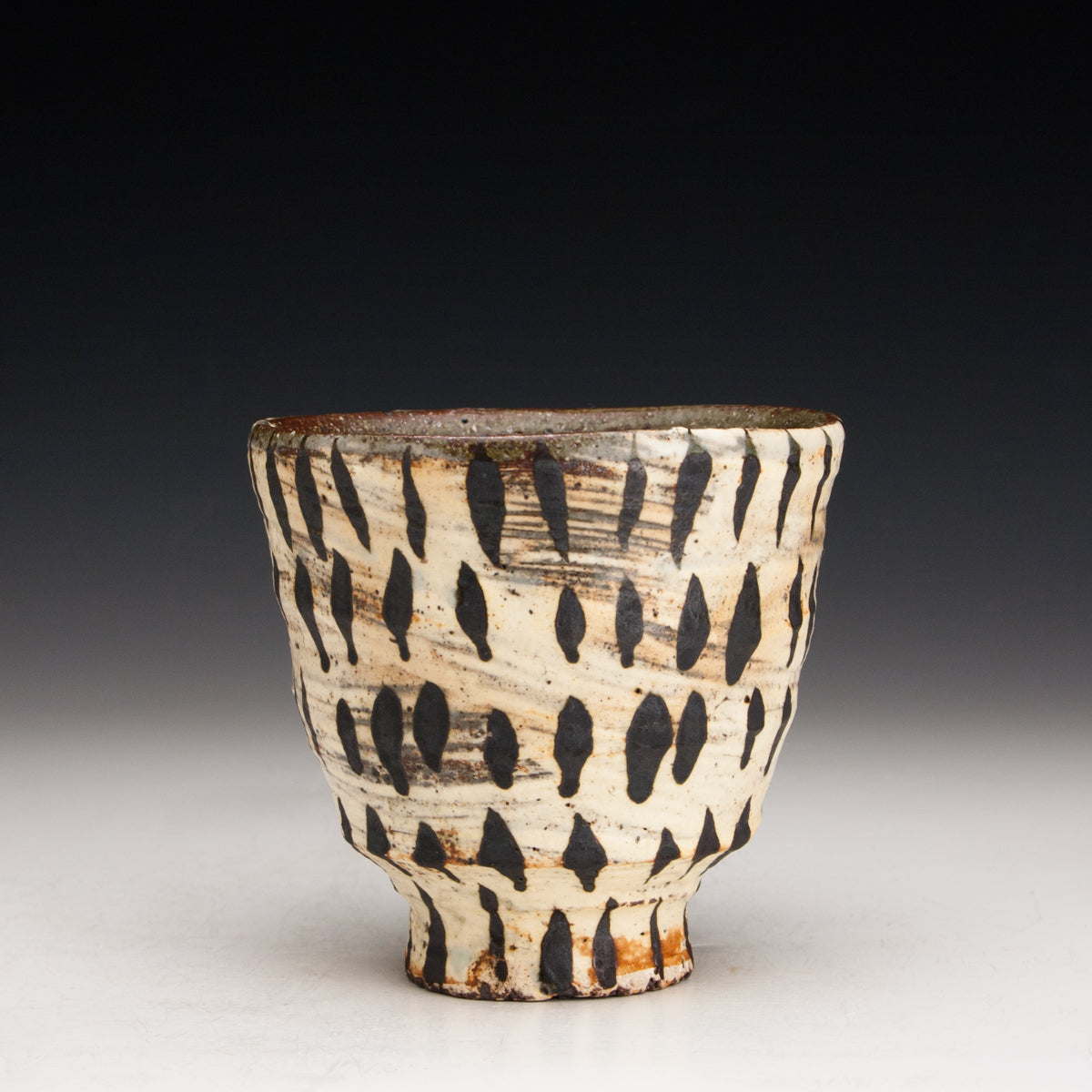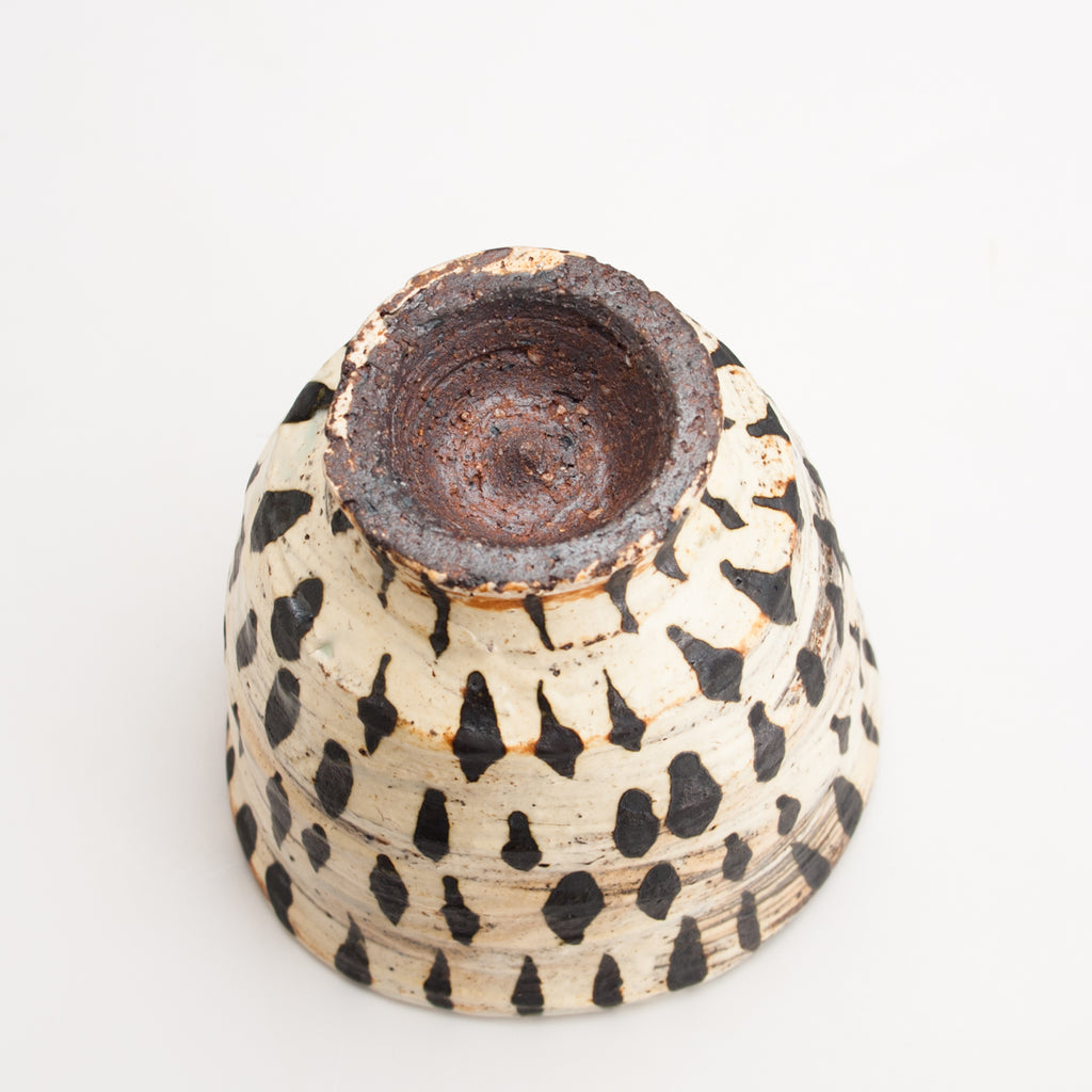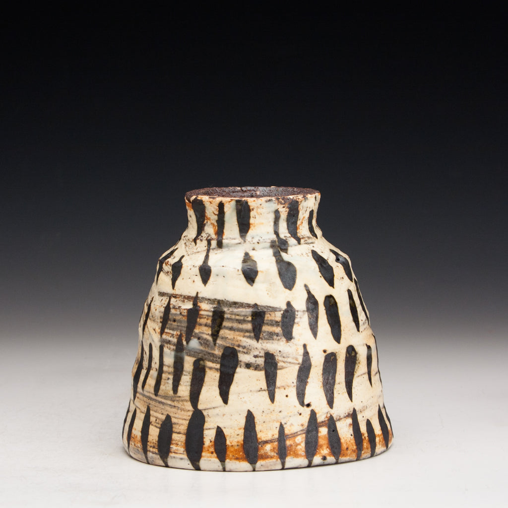 Local red clay. Brushed slip and clear glaze with black deco. 4 x 3.5
