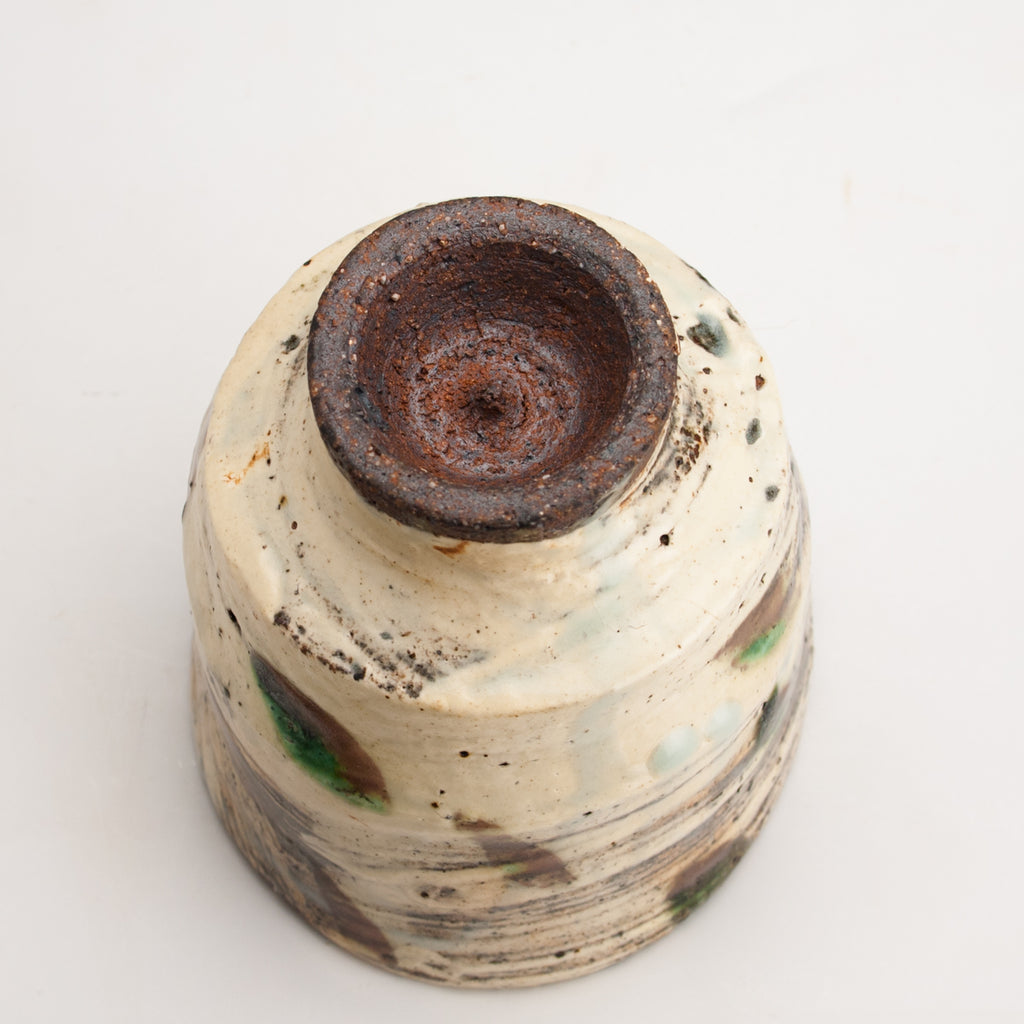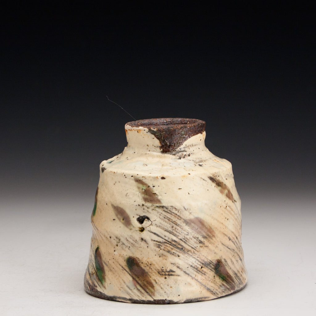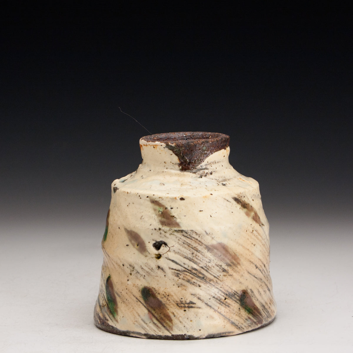 Local red clay. Brushed slip and clear glaze with copper green. 3.75 x 3.5