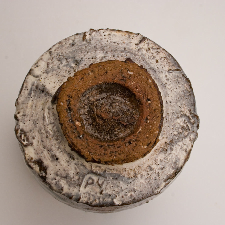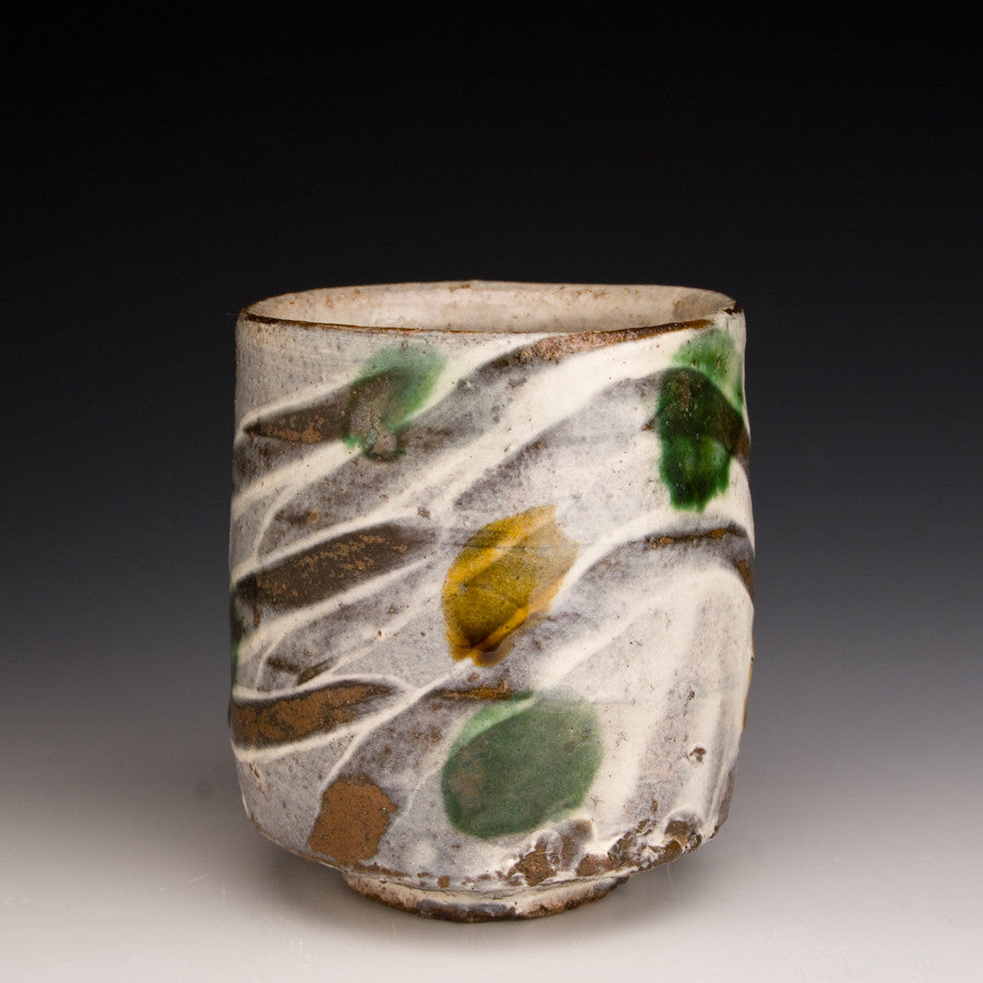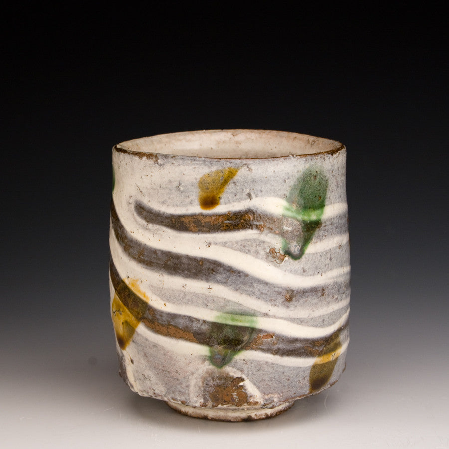 Wood fired local red clay. White slip and green, amber glazes under clear ash  glaze. 4 x 3.5