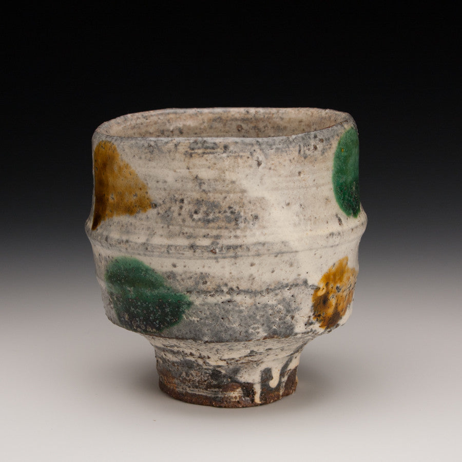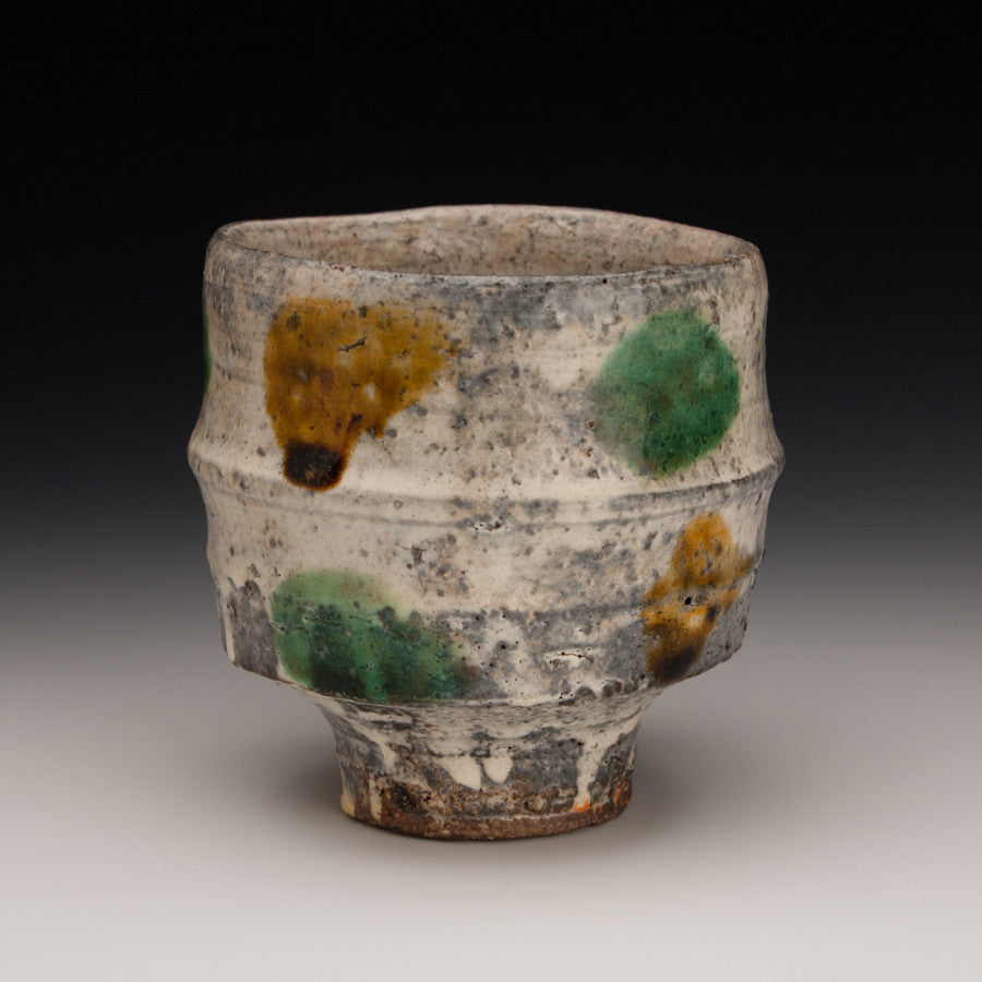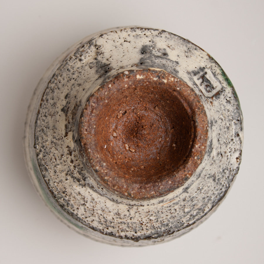 Wood fired local red clay. White slip with green and amber dots. 3.5 x 3.5