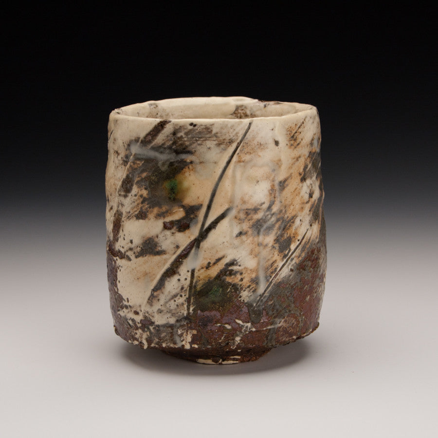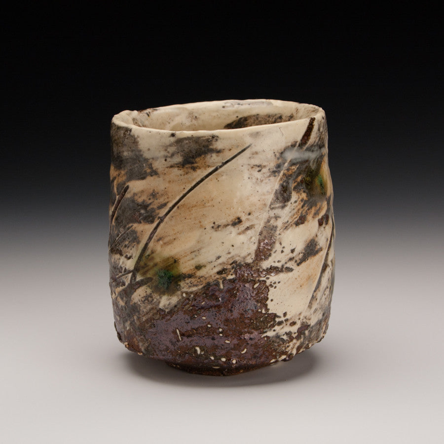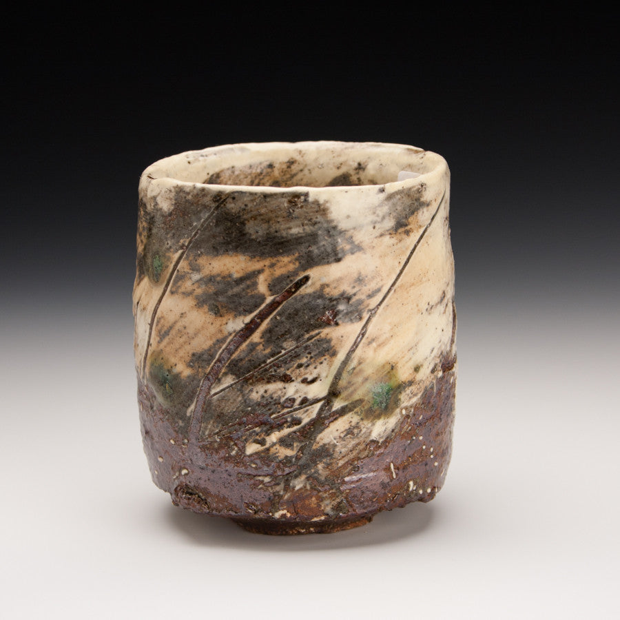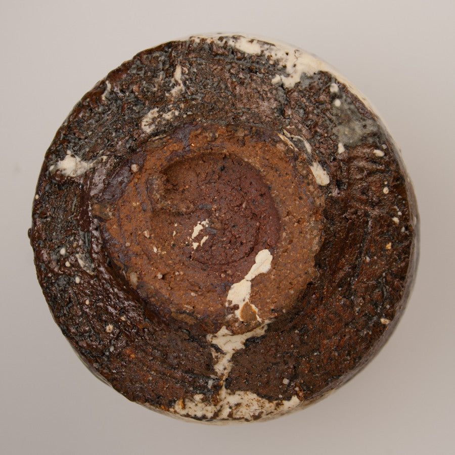 Wood fired local red clay. White slip and sgraffito with green dots. 3.25 x 3.75