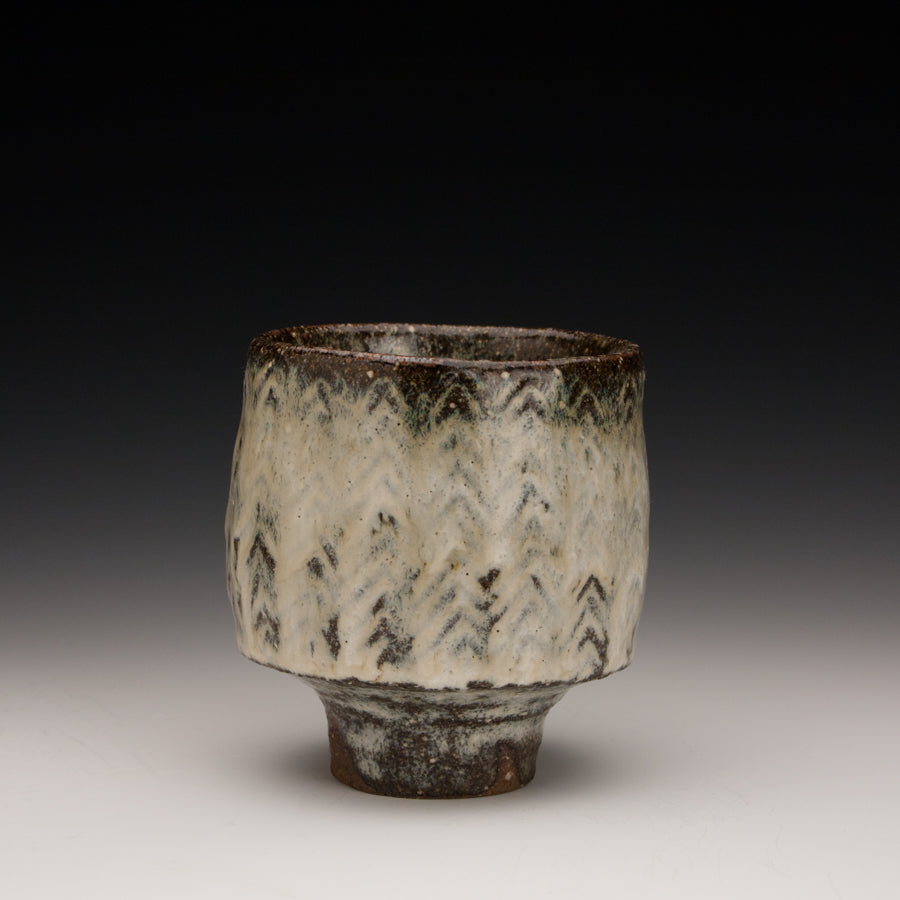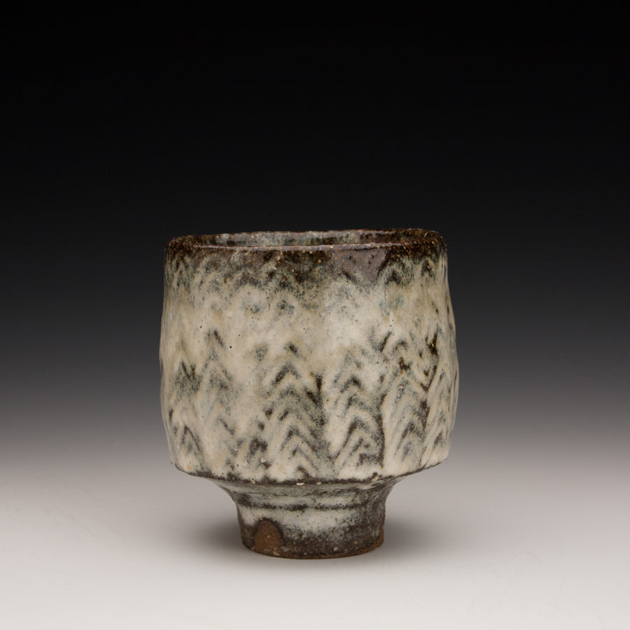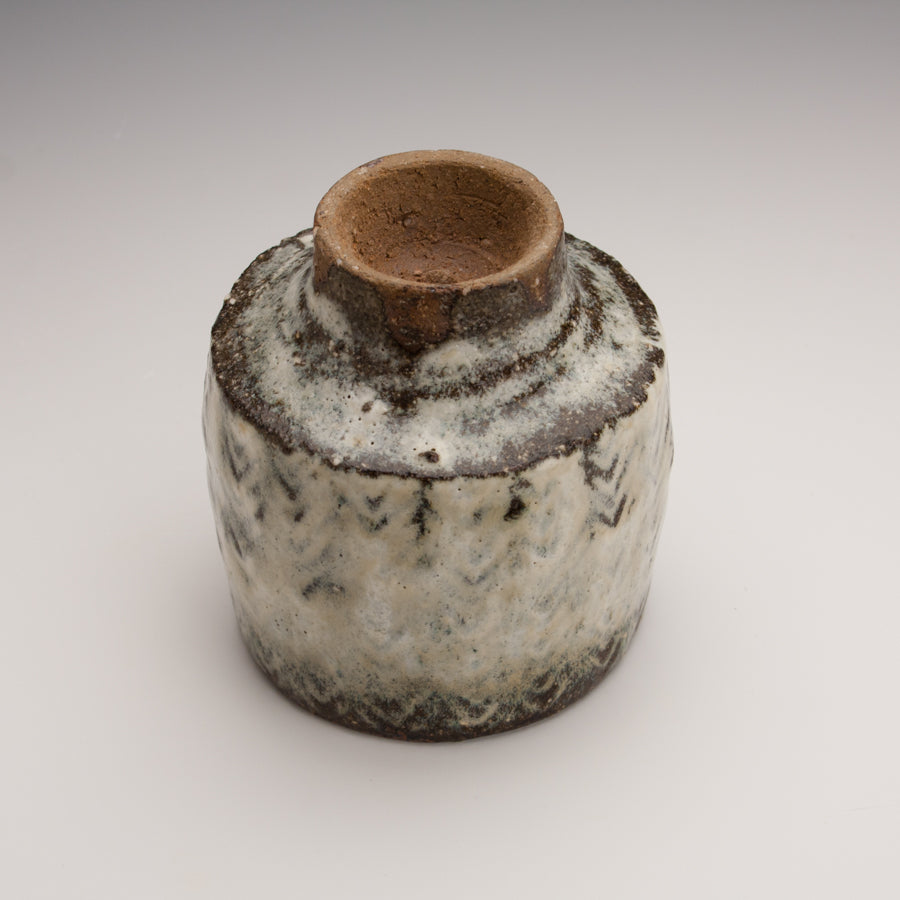 Wood fired local red clay. Nuka glaze with roulette . 4 x 3.25