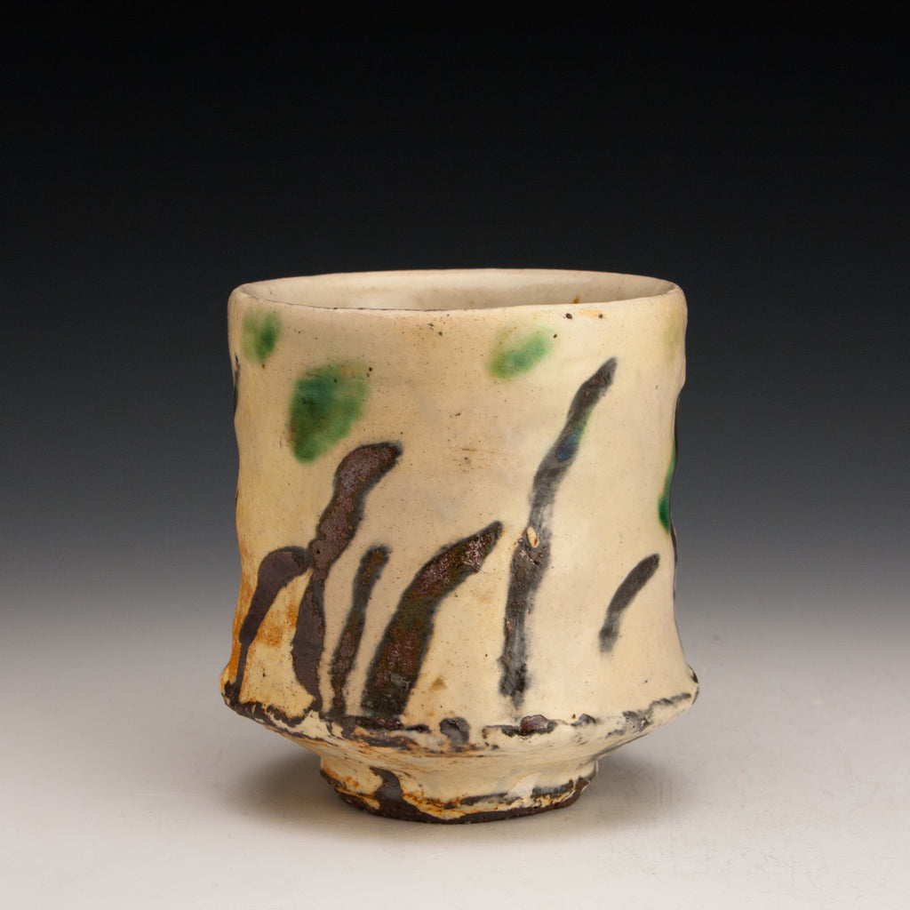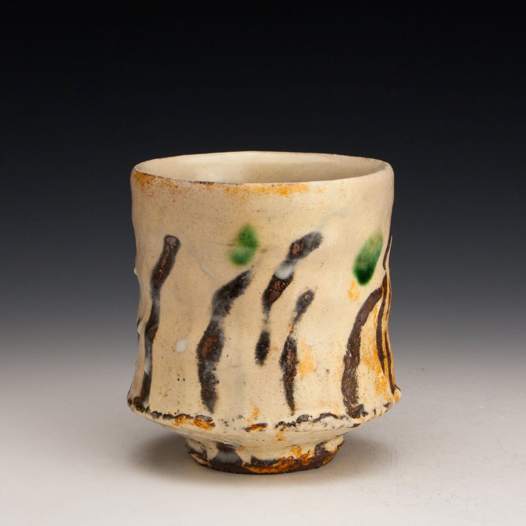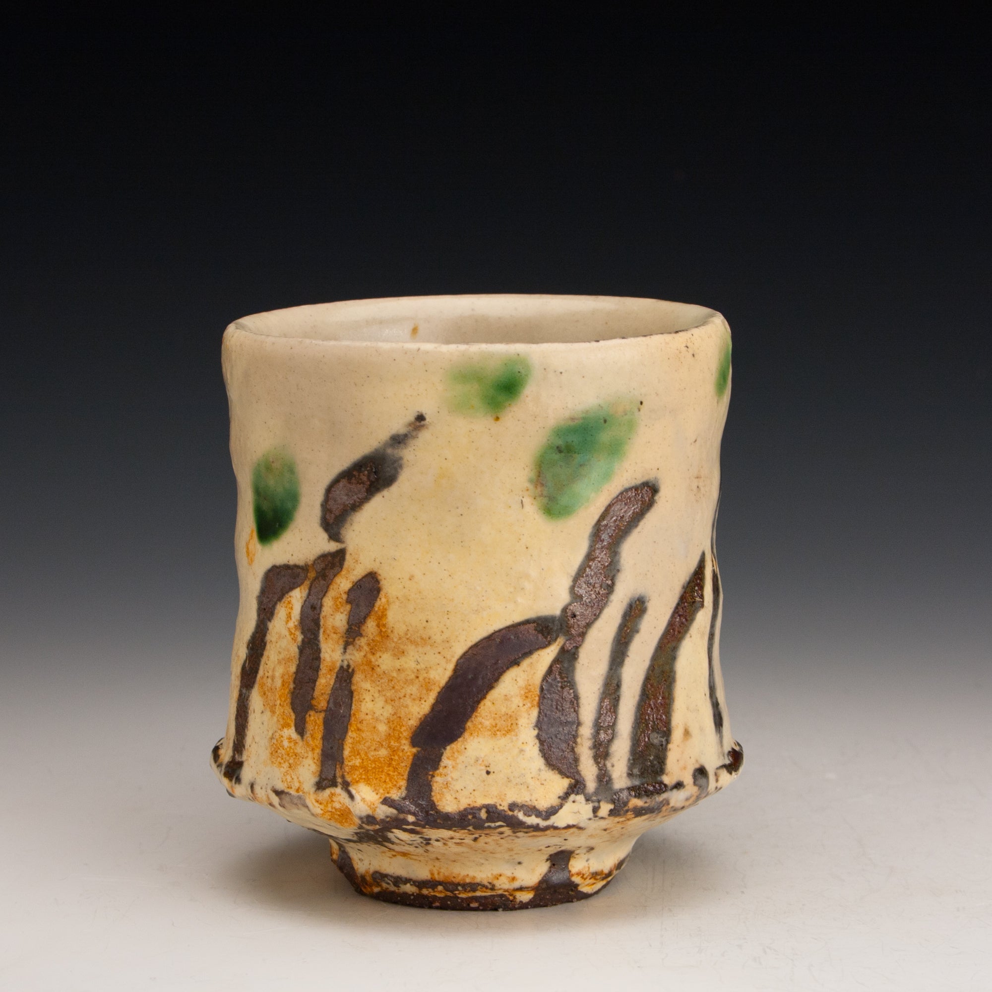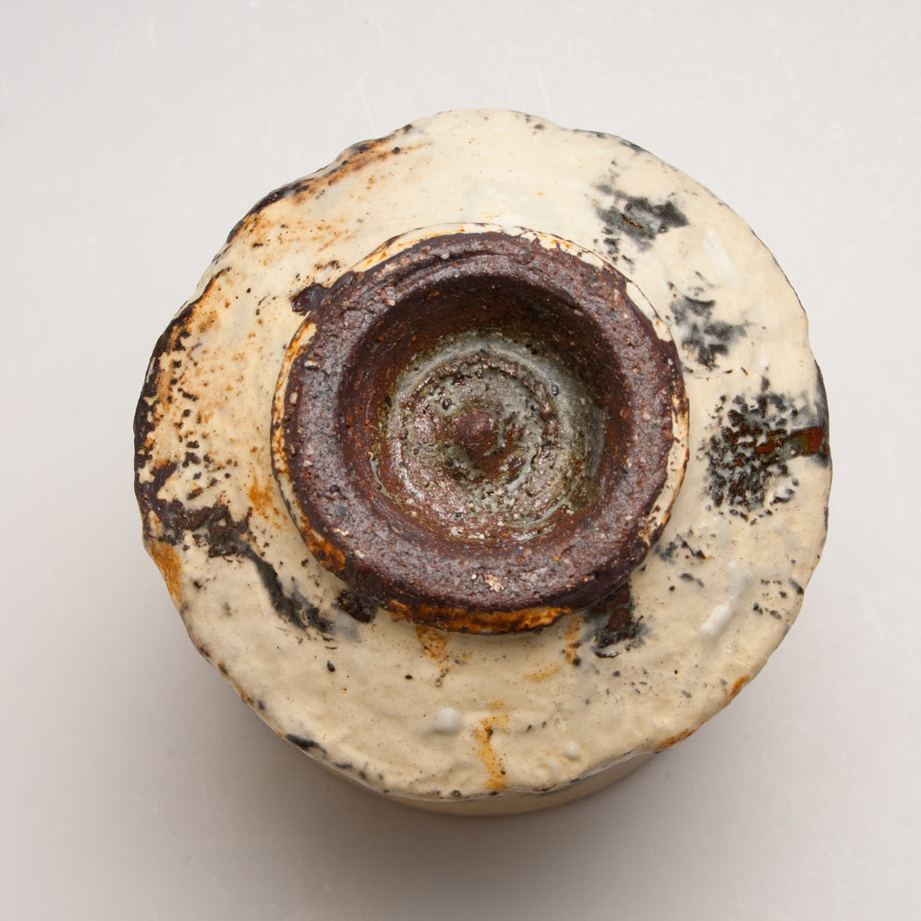 Wood fired local red clay. White slip with fingerwipes and clear glaze. 3.5 x 4