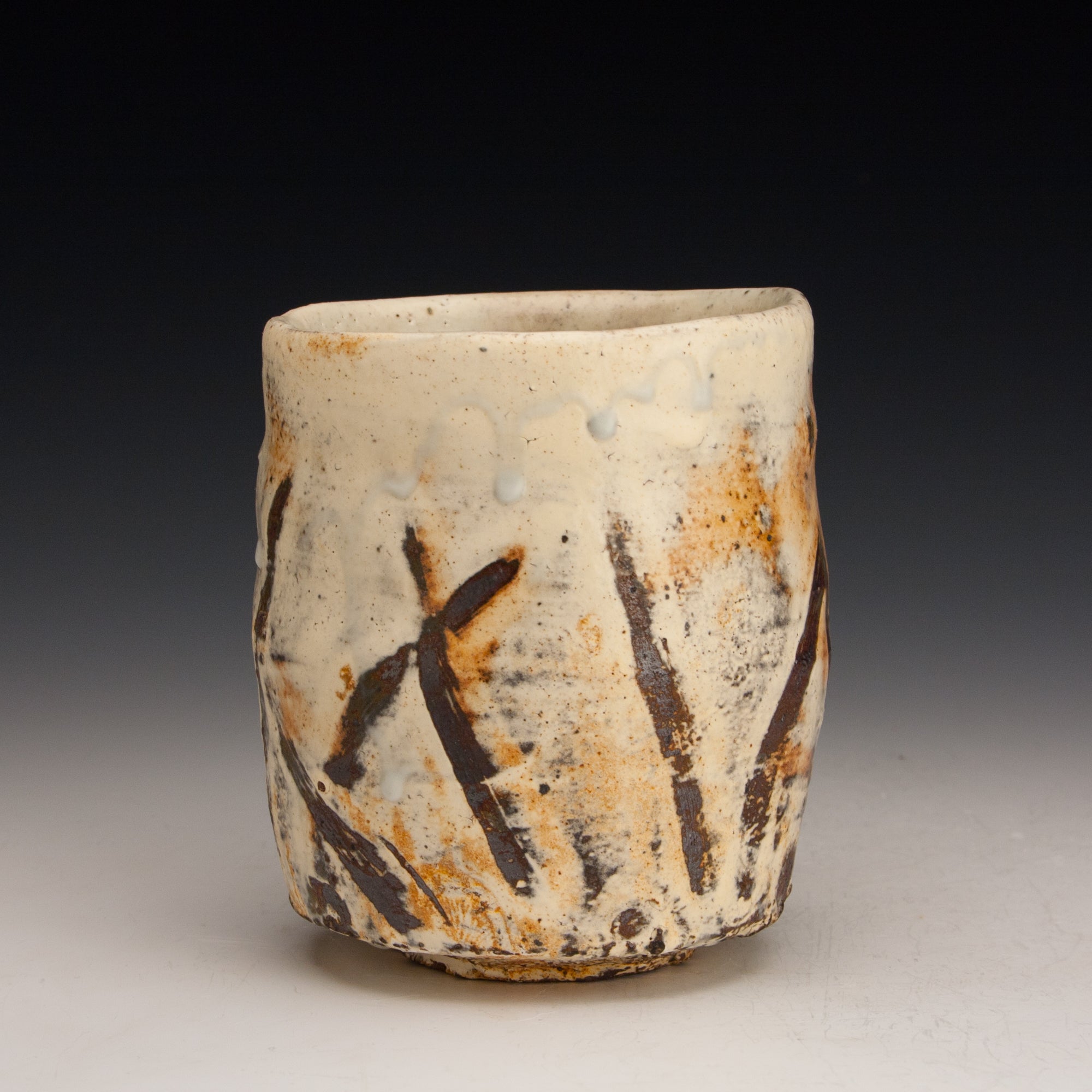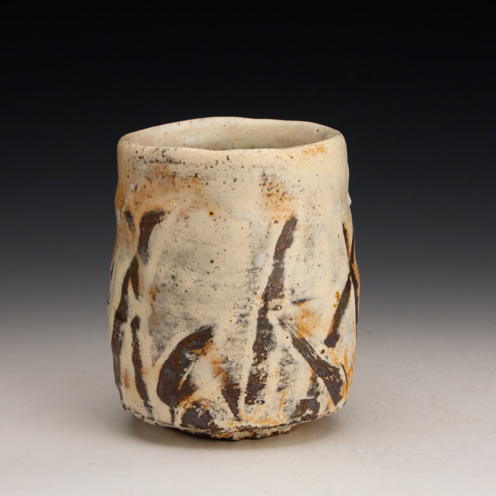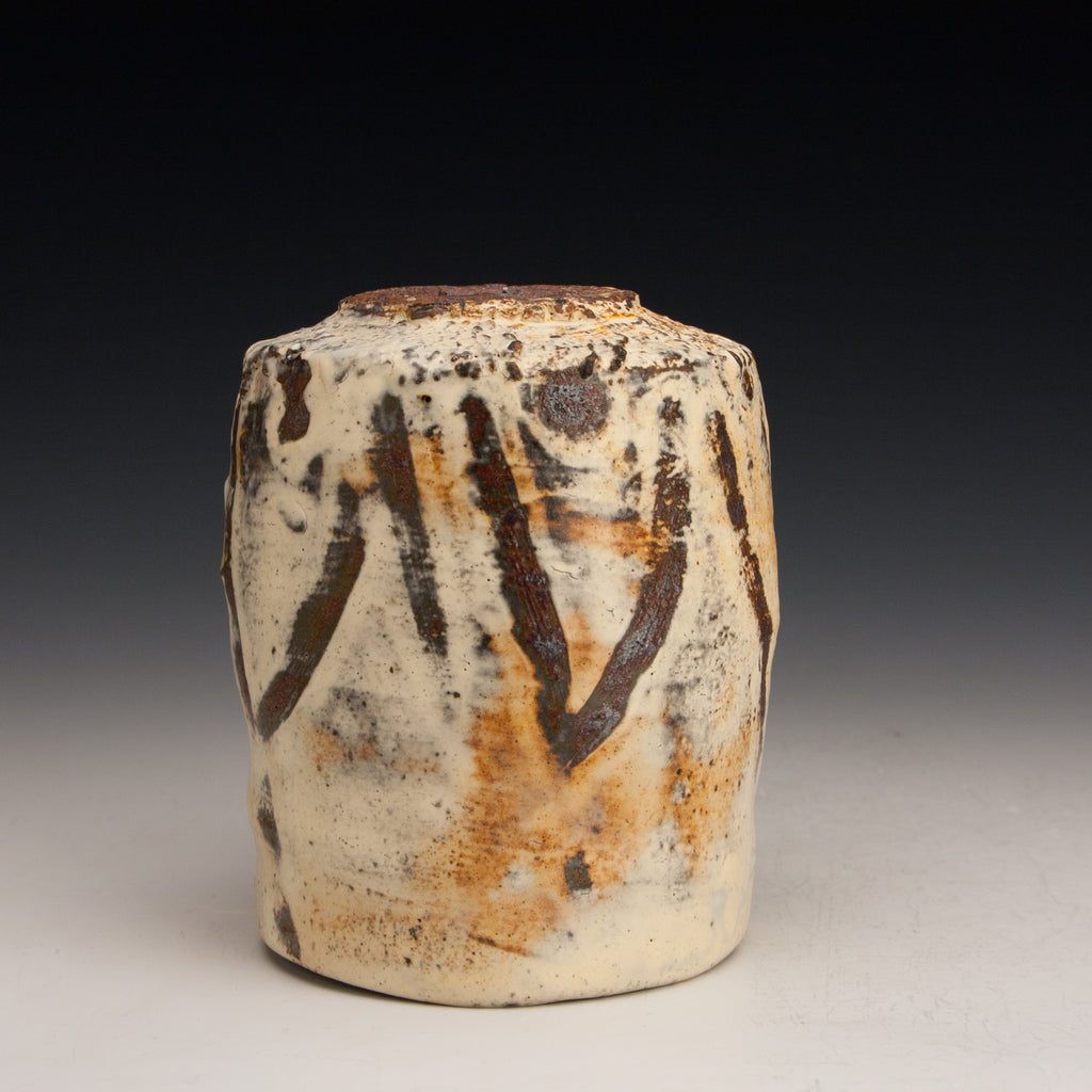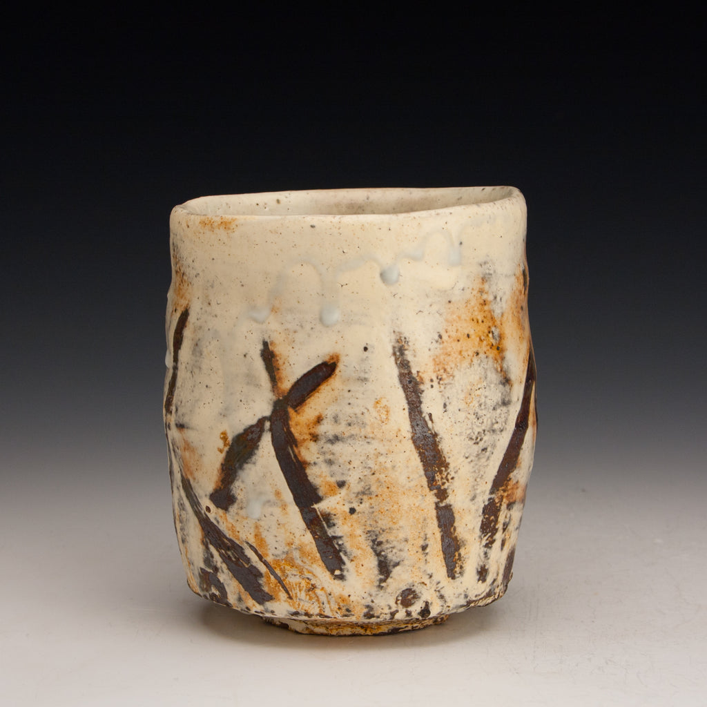 Wood fired local red clay. White slip with fingerwipes under clear glaze. 3.5 x 4.25
