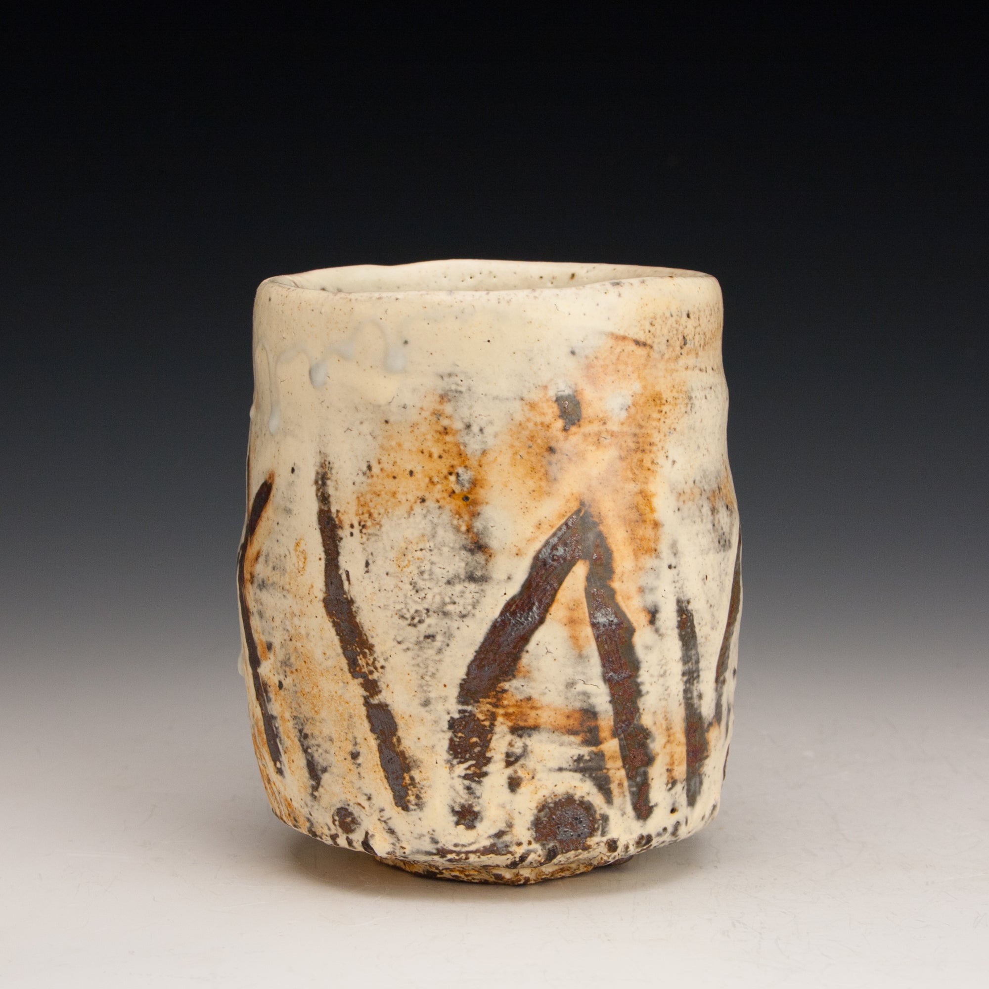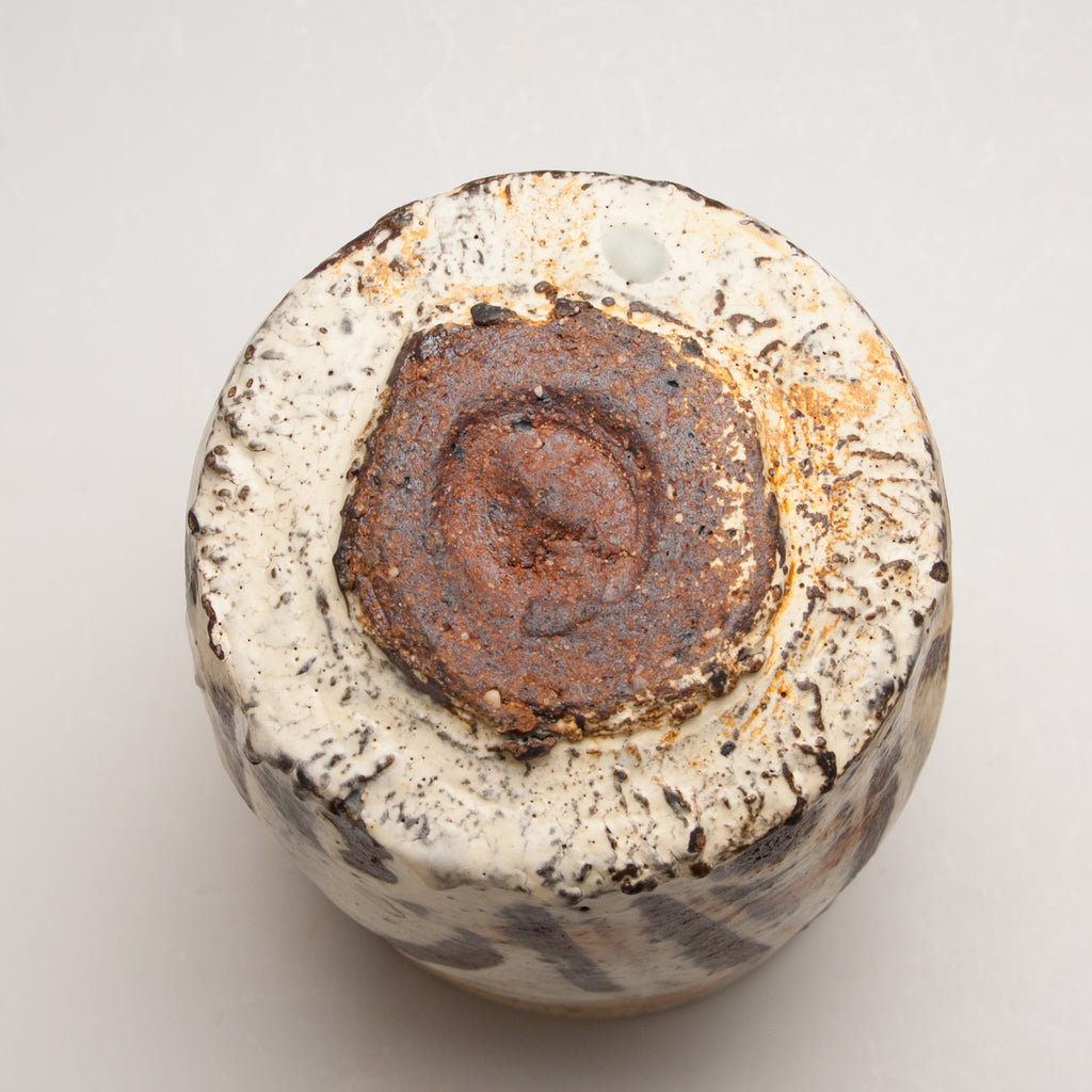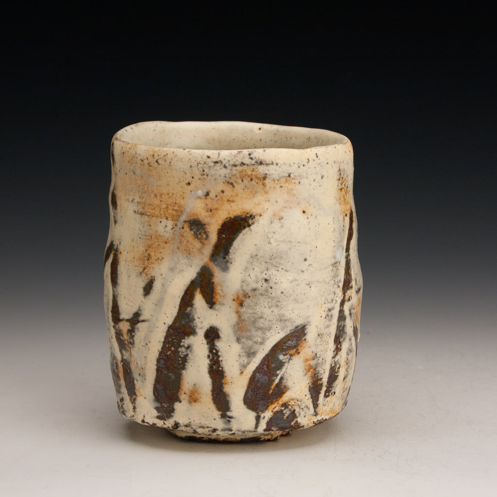 Wood fired local red clay. White slip with fingerwipes under clear glaze. 3.5 x 4.25